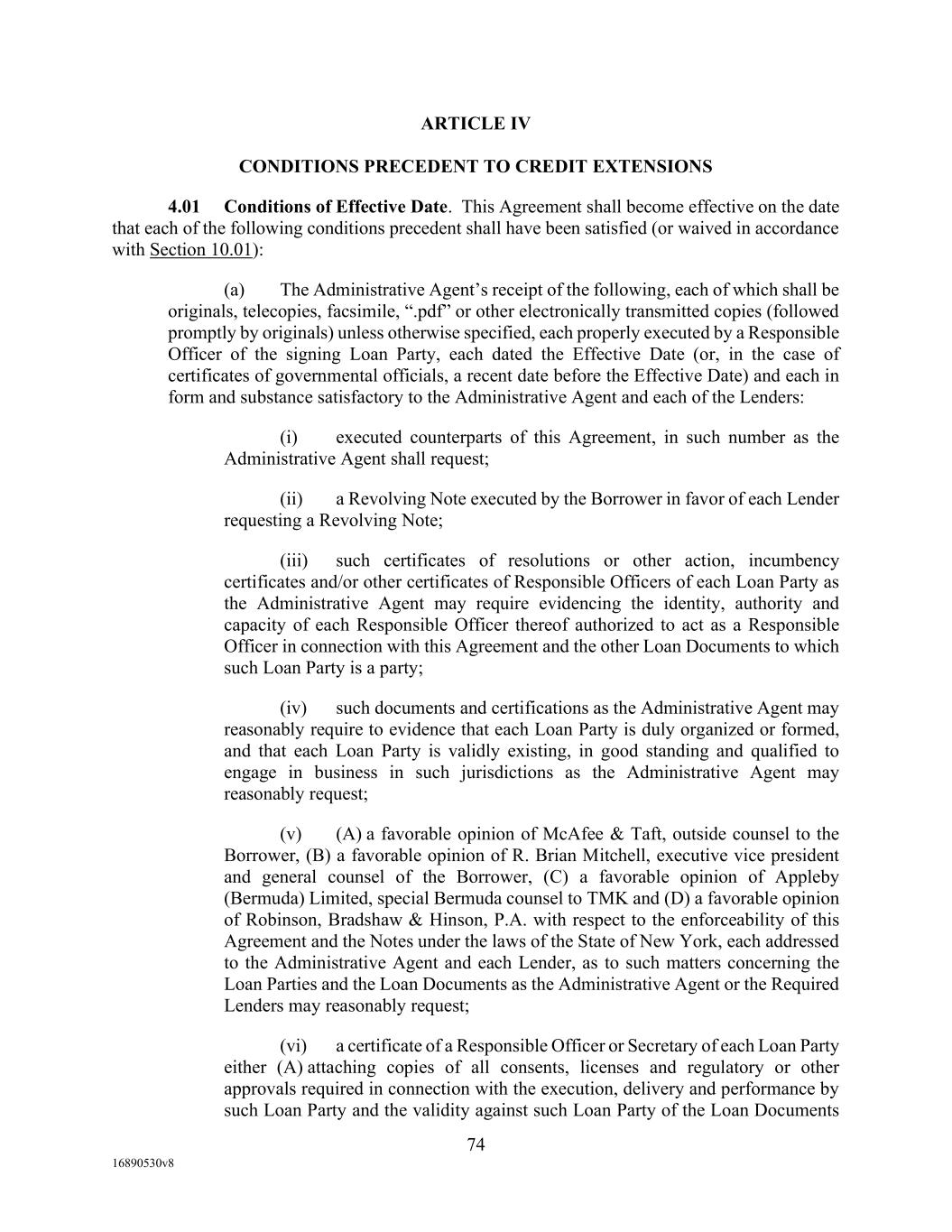 16890530v8 74 ARTICLE IV CONDITIONS PRECEDENT TO CREDIT EXTENSIONS 4.01 Conditions of Effective Date. This Agreement shall become effective on the date that each of the following conditions precedent shall have been satisfied (or waived in accordance with Section 10.01): (a) The Administrative Agent’s receipt of the following, each of which shall be originals, telecopies, facsimile, “.pdf” or other electronically transmitted copies (followed promptly by originals) unless otherwise specified, each properly executed by a Responsible Officer of the signing Loan Party, each dated the Effective Date (or, in the case of certificates of governmental officials, a recent date before the Effective Date) and each in form and substance satisfactory to the Administrative Agent and each of the Lenders: (i) executed counterparts of this Agreement, in such number as the Administrative Agent shall request; (ii) a Revolving Note executed by the Borrower in favor of each Lender requesting a Revolving Note; (iii) such certificates of resolutions or other action, incumbency certificates and/or other certificates of Responsible Officers of each Loan Party as the Administrative Agent may require evidencing the identity, authority and capacity of each Responsible Officer thereof authorized to act as a Responsible Officer in connection with this Agreement and the other Loan Documents to which such Loan Party is a party; (iv) such documents and certifications as the Administrative Agent may reasonably require to evidence that each Loan Party is duly organized or formed, and that each Loan Party is validly existing, in good standing and qualified to engage in business in such jurisdictions as the Administrative Agent may reasonably request; (v) (A) a favorable opinion of McAfee & Taft, outside counsel to the Borrower, (B) a favorable opinion of R. Brian Mitchell, executive vice president and general counsel of the Borrower, (C) a favorable opinion of Appleby (Bermuda) Limited, special Bermuda counsel to TMK and (D) a favorable opinion of Robinson, Bradshaw & Hinson, P.A. with respect to the enforceability of this Agreement and the Notes under the laws of the State of New York, each addressed to the Administrative Agent and each Lender, as to such matters concerning the Loan Parties and the Loan Documents as the Administrative Agent or the Required Lenders may reasonably request; (vi) a certificate of a Responsible Officer or Secretary of each Loan Party either (A) attaching copies of all consents, licenses and regulatory or other approvals required in connection with the execution, delivery and performance by such Loan Party and the validity against such Loan Party of the Loan Documents