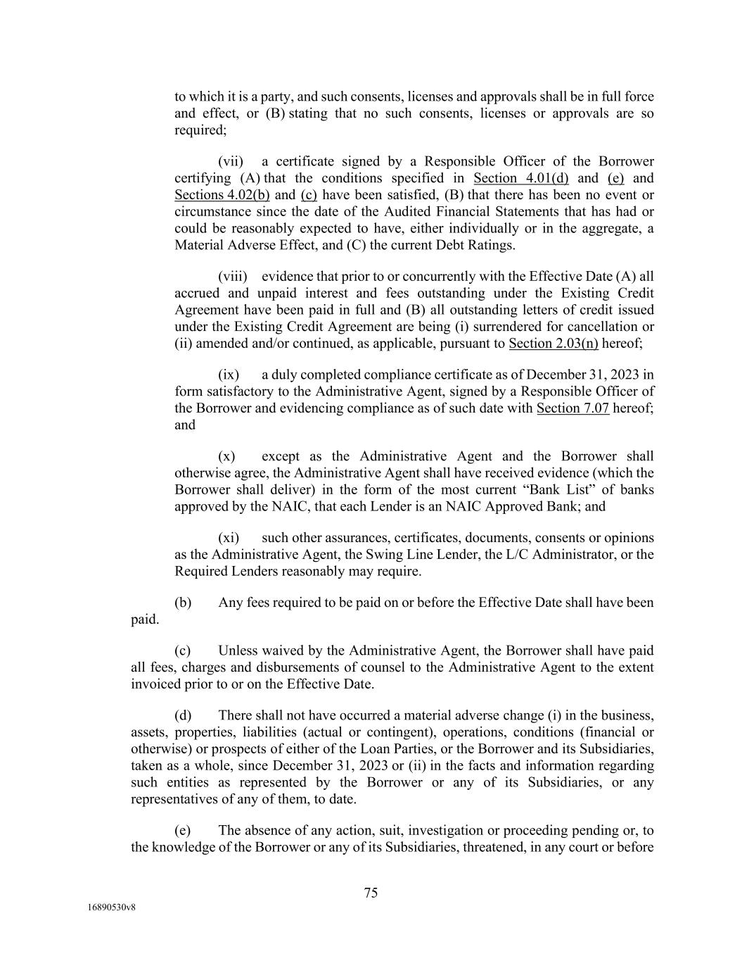 16890530v8 75 to which it is a party, and such consents, licenses and approvals shall be in full force and effect, or (B) stating that no such consents, licenses or approvals are so required; (vii) a certificate signed by a Responsible Officer of the Borrower certifying (A) that the conditions specified in Section 4.01(d) and (e) and Sections 4.02(b) and (c) have been satisfied, (B) that there has been no event or circumstance since the date of the Audited Financial Statements that has had or could be reasonably expected to have, either individually or in the aggregate, a Material Adverse Effect, and (C) the current Debt Ratings. (viii) evidence that prior to or concurrently with the Effective Date (A) all accrued and unpaid interest and fees outstanding under the Existing Credit Agreement have been paid in full and (B) all outstanding letters of credit issued under the Existing Credit Agreement are being (i) surrendered for cancellation or (ii) amended and/or continued, as applicable, pursuant to Section 2.03(n) hereof; (ix) a duly completed compliance certificate as of December 31, 2023 in form satisfactory to the Administrative Agent, signed by a Responsible Officer of the Borrower and evidencing compliance as of such date with Section 7.07 hereof; and (x) except as the Administrative Agent and the Borrower shall otherwise agree, the Administrative Agent shall have received evidence (which the Borrower shall deliver) in the form of the most current “Bank List” of banks approved by the NAIC, that each Lender is an NAIC Approved Bank; and (xi) such other assurances, certificates, documents, consents or opinions as the Administrative Agent, the Swing Line Lender, the L/C Administrator, or the Required Lenders reasonably may require. (b) Any fees required to be paid on or before the Effective Date shall have been paid. (c) Unless waived by the Administrative Agent, the Borrower shall have paid all fees, charges and disbursements of counsel to the Administrative Agent to the extent invoiced prior to or on the Effective Date. (d) There shall not have occurred a material adverse change (i) in the business, assets, properties, liabilities (actual or contingent), operations, conditions (financial or otherwise) or prospects of either of the Loan Parties, or the Borrower and its Subsidiaries, taken as a whole, since December 31, 2023 or (ii) in the facts and information regarding such entities as represented by the Borrower or any of its Subsidiaries, or any representatives of any of them, to date. (e) The absence of any action, suit, investigation or proceeding pending or, to the knowledge of the Borrower or any of its Subsidiaries, threatened, in any court or before