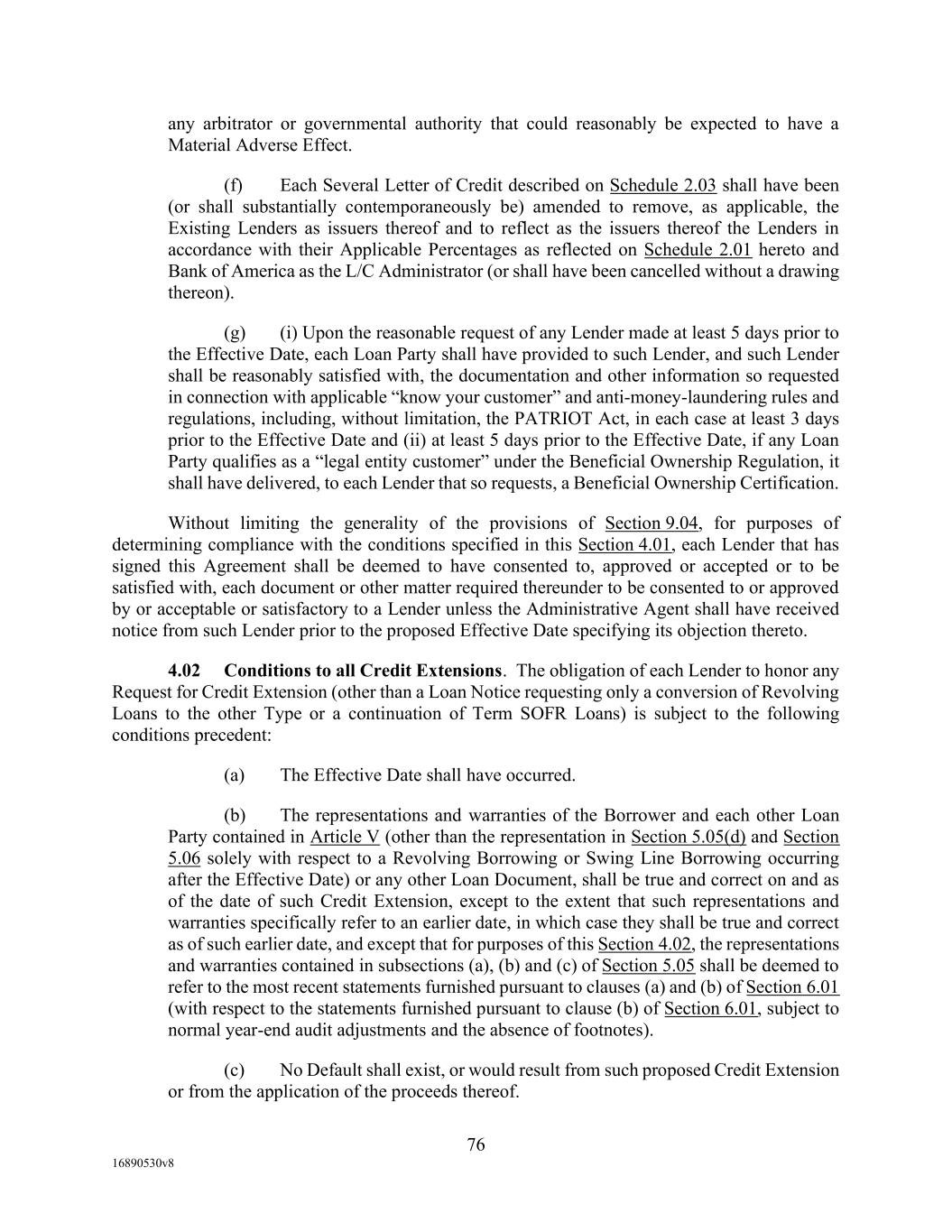 16890530v8 76 any arbitrator or governmental authority that could reasonably be expected to have a Material Adverse Effect. (f) Each Several Letter of Credit described on Schedule 2.03 shall have been (or shall substantially contemporaneously be) amended to remove, as applicable, the Existing Lenders as issuers thereof and to reflect as the issuers thereof the Lenders in accordance with their Applicable Percentages as reflected on Schedule 2.01 hereto and Bank of America as the L/C Administrator (or shall have been cancelled without a drawing thereon). (g) (i) Upon the reasonable request of any Lender made at least 5 days prior to the Effective Date, each Loan Party shall have provided to such Lender, and such Lender shall be reasonably satisfied with, the documentation and other information so requested in connection with applicable “know your customer” and anti-money-laundering rules and regulations, including, without limitation, the PATRIOT Act, in each case at least 3 days prior to the Effective Date and (ii) at least 5 days prior to the Effective Date, if any Loan Party qualifies as a “legal entity customer” under the Beneficial Ownership Regulation, it shall have delivered, to each Lender that so requests, a Beneficial Ownership Certification. Without limiting the generality of the provisions of Section 9.04, for purposes of determining compliance with the conditions specified in this Section 4.01, each Lender that has signed this Agreement shall be deemed to have consented to, approved or accepted or to be satisfied with, each document or other matter required thereunder to be consented to or approved by or acceptable or satisfactory to a Lender unless the Administrative Agent shall have received notice from such Lender prior to the proposed Effective Date specifying its objection thereto. 4.02 Conditions to all Credit Extensions. The obligation of each Lender to honor any Request for Credit Extension (other than a Loan Notice requesting only a conversion of Revolving Loans to the other Type or a continuation of Term SOFR Loans) is subject to the following conditions precedent: (a) The Effective Date shall have occurred. (b) The representations and warranties of the Borrower and each other Loan Party contained in Article V (other than the representation in Section 5.05(d) and Section 5.06 solely with respect to a Revolving Borrowing or Swing Line Borrowing occurring after the Effective Date) or any other Loan Document, shall be true and correct on and as of the date of such Credit Extension, except to the extent that such representations and warranties specifically refer to an earlier date, in which case they shall be true and correct as of such earlier date, and except that for purposes of this Section 4.02, the representations and warranties contained in subsections (a), (b) and (c) of Section 5.05 shall be deemed to refer to the most recent statements furnished pursuant to clauses (a) and (b) of Section 6.01 (with respect to the statements furnished pursuant to clause (b) of Section 6.01, subject to normal year-end audit adjustments and the absence of footnotes). (c) No Default shall exist, or would result from such proposed Credit Extension or from the application of the proceeds thereof.
