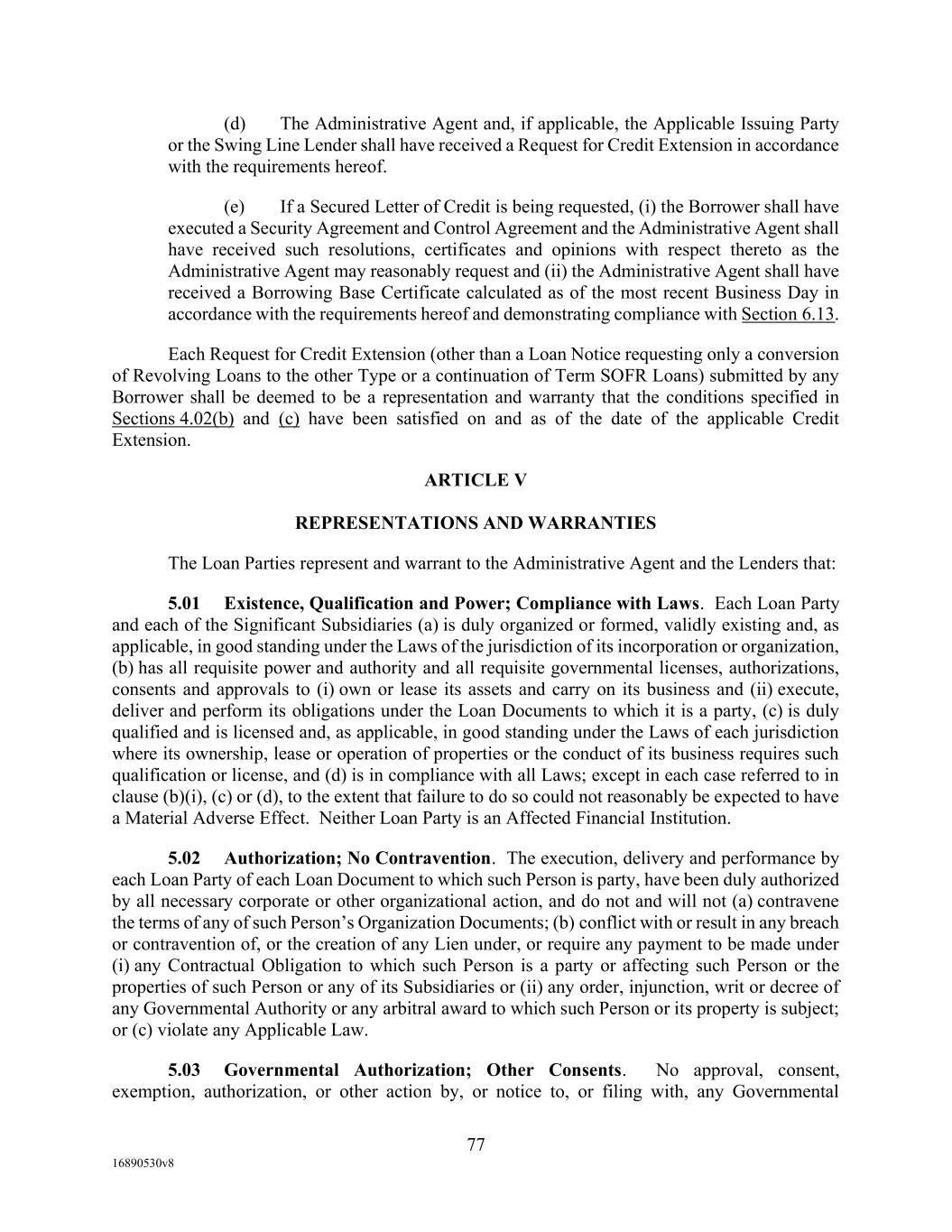 16890530v8 77 (d) The Administrative Agent and, if applicable, the Applicable Issuing Party or the Swing Line Lender shall have received a Request for Credit Extension in accordance with the requirements hereof. (e) If a Secured Letter of Credit is being requested, (i) the Borrower shall have executed a Security Agreement and Control Agreement and the Administrative Agent shall have received such resolutions, certificates and opinions with respect thereto as the Administrative Agent may reasonably request and (ii) the Administrative Agent shall have received a Borrowing Base Certificate calculated as of the most recent Business Day in accordance with the requirements hereof and demonstrating compliance with Section 6.13. Each Request for Credit Extension (other than a Loan Notice requesting only a conversion of Revolving Loans to the other Type or a continuation of Term SOFR Loans) submitted by any Borrower shall be deemed to be a representation and warranty that the conditions specified in Sections 4.02(b) and (c) have been satisfied on and as of the date of the applicable Credit Extension. ARTICLE V REPRESENTATIONS AND WARRANTIES The Loan Parties represent and warrant to the Administrative Agent and the Lenders that: 5.01 Existence, Qualification and Power; Compliance with Laws. Each Loan Party and each of the Significant Subsidiaries (a) is duly organized or formed, validly existing and, as applicable, in good standing under the Laws of the jurisdiction of its incorporation or organization, (b) has all requisite power and authority and all requisite governmental licenses, authorizations, consents and approvals to (i) own or lease its assets and carry on its business and (ii) execute, deliver and perform its obligations under the Loan Documents to which it is a party, (c) is duly qualified and is licensed and, as applicable, in good standing under the Laws of each jurisdiction where its ownership, lease or operation of properties or the conduct of its business requires such qualification or license, and (d) is in compliance with all Laws; except in each case referred to in clause (b)(i), (c) or (d), to the extent that failure to do so could not reasonably be expected to have a Material Adverse Effect. Neither Loan Party is an Affected Financial Institution. 5.02 Authorization; No Contravention. The execution, delivery and performance by each Loan Party of each Loan Document to which such Person is party, have been duly authorized by all necessary corporate or other organizational action, and do not and will not (a) contravene the terms of any of such Person’s Organization Documents; (b) conflict with or result in any breach or contravention of, or the creation of any Lien under, or require any payment to be made under (i) any Contractual Obligation to which such Person is a party or affecting such Person or the properties of such Person or any of its Subsidiaries or (ii) any order, injunction, writ or decree of any Governmental Authority or any arbitral award to which such Person or its property is subject; or (c) violate any Applicable Law. 5.03 Governmental Authorization; Other Consents. No approval, consent, exemption, authorization, or other action by, or notice to, or filing with, any Governmental