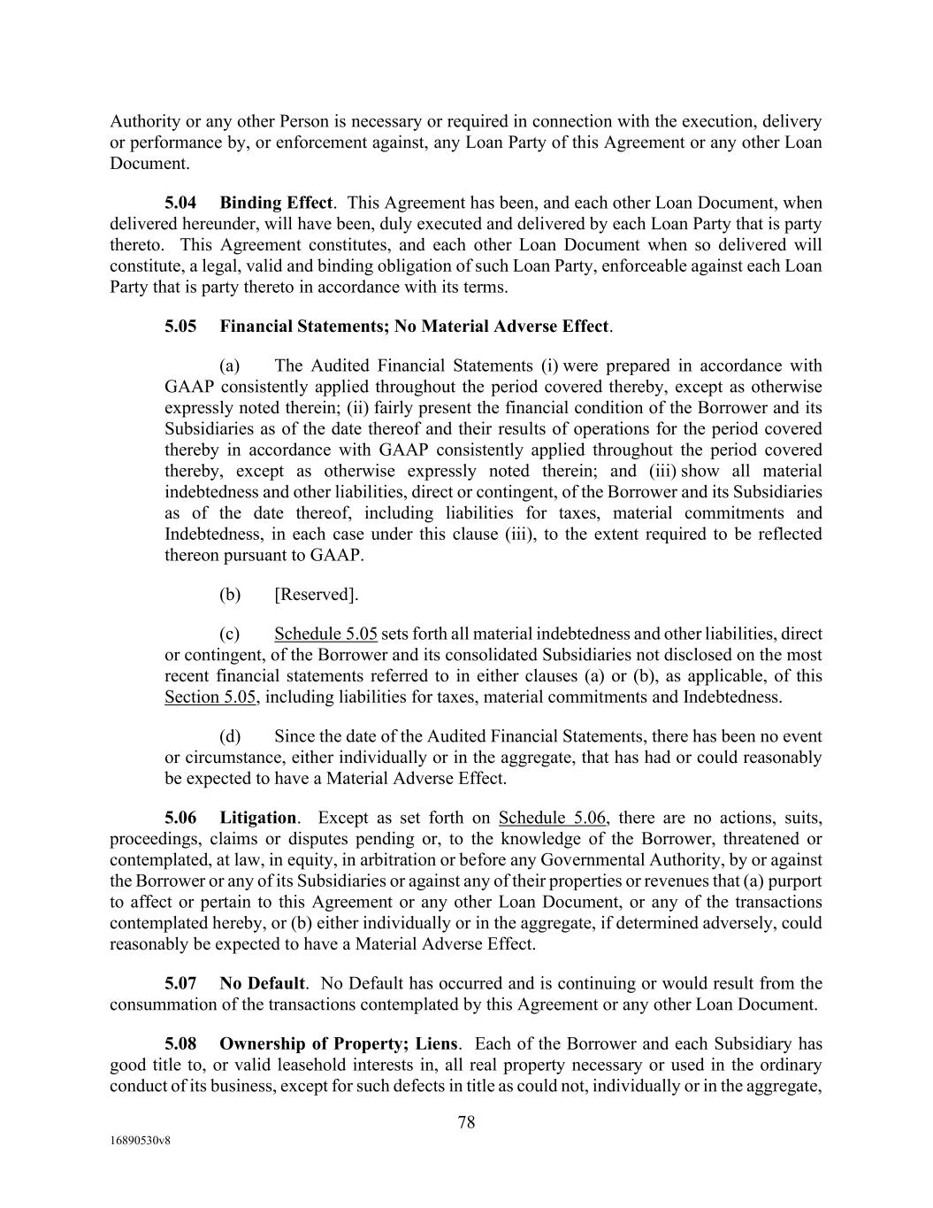 16890530v8 78 Authority or any other Person is necessary or required in connection with the execution, delivery or performance by, or enforcement against, any Loan Party of this Agreement or any other Loan Document. 5.04 Binding Effect. This Agreement has been, and each other Loan Document, when delivered hereunder, will have been, duly executed and delivered by each Loan Party that is party thereto. This Agreement constitutes, and each other Loan Document when so delivered will constitute, a legal, valid and binding obligation of such Loan Party, enforceable against each Loan Party that is party thereto in accordance with its terms. 5.05 Financial Statements; No Material Adverse Effect. (a) The Audited Financial Statements (i) were prepared in accordance with GAAP consistently applied throughout the period covered thereby, except as otherwise expressly noted therein; (ii) fairly present the financial condition of the Borrower and its Subsidiaries as of the date thereof and their results of operations for the period covered thereby in accordance with GAAP consistently applied throughout the period covered thereby, except as otherwise expressly noted therein; and (iii) show all material indebtedness and other liabilities, direct or contingent, of the Borrower and its Subsidiaries as of the date thereof, including liabilities for taxes, material commitments and Indebtedness, in each case under this clause (iii), to the extent required to be reflected thereon pursuant to GAAP. (b) [Reserved]. (c) Schedule 5.05 sets forth all material indebtedness and other liabilities, direct or contingent, of the Borrower and its consolidated Subsidiaries not disclosed on the most recent financial statements referred to in either clauses (a) or (b), as applicable, of this Section 5.05, including liabilities for taxes, material commitments and Indebtedness. (d) Since the date of the Audited Financial Statements, there has been no event or circumstance, either individually or in the aggregate, that has had or could reasonably be expected to have a Material Adverse Effect. 5.06 Litigation. Except as set forth on Schedule 5.06, there are no actions, suits, proceedings, claims or disputes pending or, to the knowledge of the Borrower, threatened or contemplated, at law, in equity, in arbitration or before any Governmental Authority, by or against the Borrower or any of its Subsidiaries or against any of their properties or revenues that (a) purport to affect or pertain to this Agreement or any other Loan Document, or any of the transactions contemplated hereby, or (b) either individually or in the aggregate, if determined adversely, could reasonably be expected to have a Material Adverse Effect. 5.07 No Default. No Default has occurred and is continuing or would result from the consummation of the transactions contemplated by this Agreement or any other Loan Document. 5.08 Ownership of Property; Liens. Each of the Borrower and each Subsidiary has good title to, or valid leasehold interests in, all real property necessary or used in the ordinary conduct of its business, except for such defects in title as could not, individually or in the aggregate,