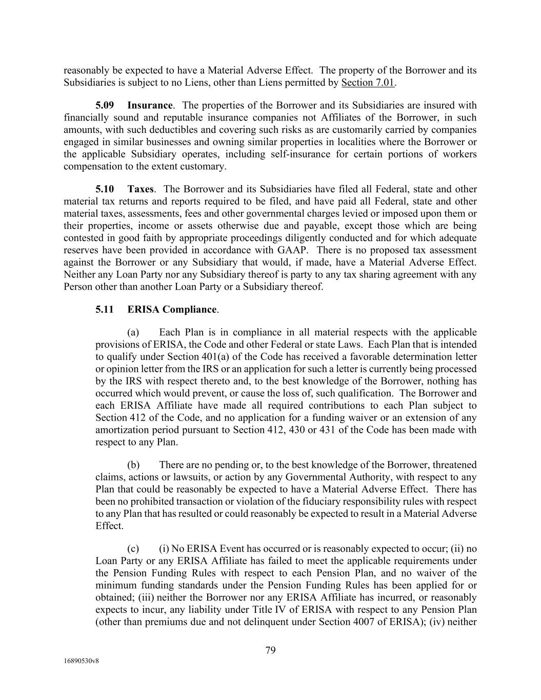16890530v8 79 reasonably be expected to have a Material Adverse Effect. The property of the Borrower and its Subsidiaries is subject to no Liens, other than Liens permitted by Section 7.01. 5.09 Insurance. The properties of the Borrower and its Subsidiaries are insured with financially sound and reputable insurance companies not Affiliates of the Borrower, in such amounts, with such deductibles and covering such risks as are customarily carried by companies engaged in similar businesses and owning similar properties in localities where the Borrower or the applicable Subsidiary operates, including self-insurance for certain portions of workers compensation to the extent customary. 5.10 Taxes. The Borrower and its Subsidiaries have filed all Federal, state and other material tax returns and reports required to be filed, and have paid all Federal, state and other material taxes, assessments, fees and other governmental charges levied or imposed upon them or their properties, income or assets otherwise due and payable, except those which are being contested in good faith by appropriate proceedings diligently conducted and for which adequate reserves have been provided in accordance with GAAP. There is no proposed tax assessment against the Borrower or any Subsidiary that would, if made, have a Material Adverse Effect. Neither any Loan Party nor any Subsidiary thereof is party to any tax sharing agreement with any Person other than another Loan Party or a Subsidiary thereof. 5.11 ERISA Compliance. (a) Each Plan is in compliance in all material respects with the applicable provisions of ERISA, the Code and other Federal or state Laws. Each Plan that is intended to qualify under Section 401(a) of the Code has received a favorable determination letter or opinion letter from the IRS or an application for such a letter is currently being processed by the IRS with respect thereto and, to the best knowledge of the Borrower, nothing has occurred which would prevent, or cause the loss of, such qualification. The Borrower and each ERISA Affiliate have made all required contributions to each Plan subject to Section 412 of the Code, and no application for a funding waiver or an extension of any amortization period pursuant to Section 412, 430 or 431 of the Code has been made with respect to any Plan. (b) There are no pending or, to the best knowledge of the Borrower, threatened claims, actions or lawsuits, or action by any Governmental Authority, with respect to any Plan that could be reasonably be expected to have a Material Adverse Effect. There has been no prohibited transaction or violation of the fiduciary responsibility rules with respect to any Plan that has resulted or could reasonably be expected to result in a Material Adverse Effect. (c) (i) No ERISA Event has occurred or is reasonably expected to occur; (ii) no Loan Party or any ERISA Affiliate has failed to meet the applicable requirements under the Pension Funding Rules with respect to each Pension Plan, and no waiver of the minimum funding standards under the Pension Funding Rules has been applied for or obtained; (iii) neither the Borrower nor any ERISA Affiliate has incurred, or reasonably expects to incur, any liability under Title IV of ERISA with respect to any Pension Plan (other than premiums due and not delinquent under Section 4007 of ERISA); (iv) neither