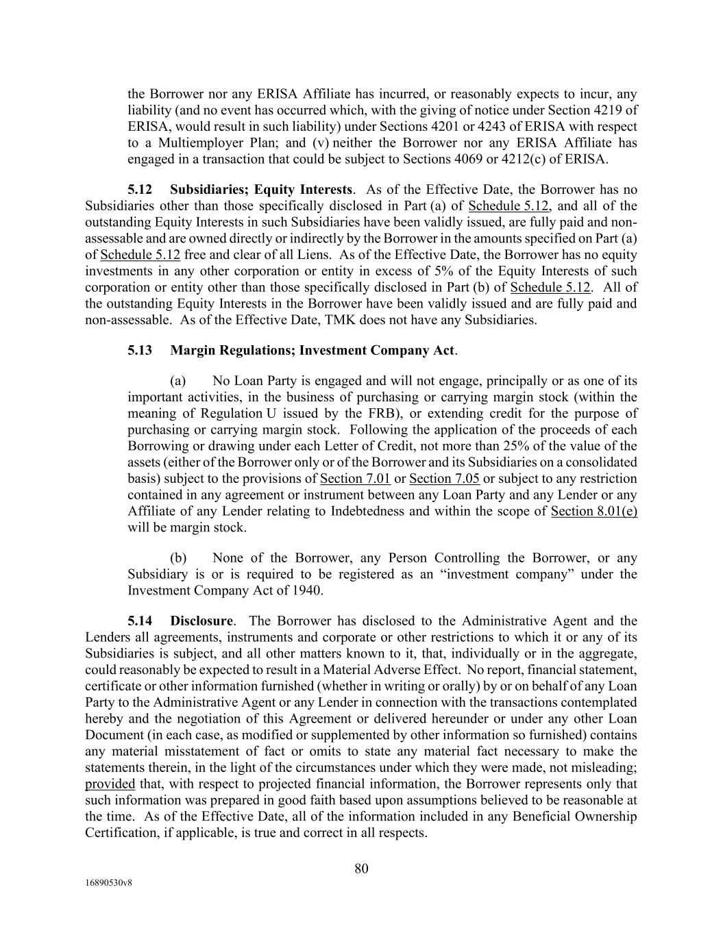 16890530v8 80 the Borrower nor any ERISA Affiliate has incurred, or reasonably expects to incur, any liability (and no event has occurred which, with the giving of notice under Section 4219 of ERISA, would result in such liability) under Sections 4201 or 4243 of ERISA with respect to a Multiemployer Plan; and (v) neither the Borrower nor any ERISA Affiliate has engaged in a transaction that could be subject to Sections 4069 or 4212(c) of ERISA. 5.12 Subsidiaries; Equity Interests. As of the Effective Date, the Borrower has no Subsidiaries other than those specifically disclosed in Part (a) of Schedule 5.12, and all of the outstanding Equity Interests in such Subsidiaries have been validly issued, are fully paid and non- assessable and are owned directly or indirectly by the Borrower in the amounts specified on Part (a) of Schedule 5.12 free and clear of all Liens. As of the Effective Date, the Borrower has no equity investments in any other corporation or entity in excess of 5% of the Equity Interests of such corporation or entity other than those specifically disclosed in Part (b) of Schedule 5.12. All of the outstanding Equity Interests in the Borrower have been validly issued and are fully paid and non-assessable. As of the Effective Date, TMK does not have any Subsidiaries. 5.13 Margin Regulations; Investment Company Act. (a) No Loan Party is engaged and will not engage, principally or as one of its important activities, in the business of purchasing or carrying margin stock (within the meaning of Regulation U issued by the FRB), or extending credit for the purpose of purchasing or carrying margin stock. Following the application of the proceeds of each Borrowing or drawing under each Letter of Credit, not more than 25% of the value of the assets (either of the Borrower only or of the Borrower and its Subsidiaries on a consolidated basis) subject to the provisions of Section 7.01 or Section 7.05 or subject to any restriction contained in any agreement or instrument between any Loan Party and any Lender or any Affiliate of any Lender relating to Indebtedness and within the scope of Section 8.01(e) will be margin stock. (b) None of the Borrower, any Person Controlling the Borrower, or any Subsidiary is or is required to be registered as an “investment company” under the Investment Company Act of 1940. 5.14 Disclosure. The Borrower has disclosed to the Administrative Agent and the Lenders all agreements, instruments and corporate or other restrictions to which it or any of its Subsidiaries is subject, and all other matters known to it, that, individually or in the aggregate, could reasonably be expected to result in a Material Adverse Effect. No report, financial statement, certificate or other information furnished (whether in writing or orally) by or on behalf of any Loan Party to the Administrative Agent or any Lender in connection with the transactions contemplated hereby and the negotiation of this Agreement or delivered hereunder or under any other Loan Document (in each case, as modified or supplemented by other information so furnished) contains any material misstatement of fact or omits to state any material fact necessary to make the statements therein, in the light of the circumstances under which they were made, not misleading; provided that, with respect to projected financial information, the Borrower represents only that such information was prepared in good faith based upon assumptions believed to be reasonable at the time. As of the Effective Date, all of the information included in any Beneficial Ownership Certification, if applicable, is true and correct in all respects.