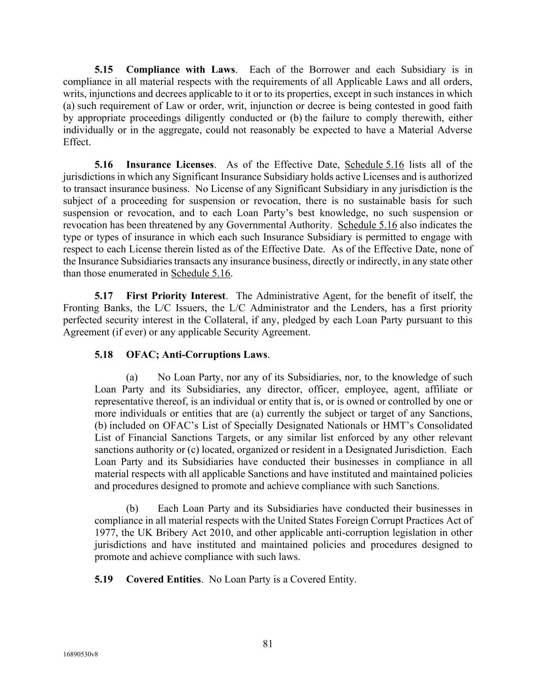 16890530v8 81 5.15 Compliance with Laws. Each of the Borrower and each Subsidiary is in compliance in all material respects with the requirements of all Applicable Laws and all orders, writs, injunctions and decrees applicable to it or to its properties, except in such instances in which (a) such requirement of Law or order, writ, injunction or decree is being contested in good faith by appropriate proceedings diligently conducted or (b) the failure to comply therewith, either individually or in the aggregate, could not reasonably be expected to have a Material Adverse Effect. 5.16 Insurance Licenses. As of the Effective Date, Schedule 5.16 lists all of the jurisdictions in which any Significant Insurance Subsidiary holds active Licenses and is authorized to transact insurance business. No License of any Significant Subsidiary in any jurisdiction is the subject of a proceeding for suspension or revocation, there is no sustainable basis for such suspension or revocation, and to each Loan Party’s best knowledge, no such suspension or revocation has been threatened by any Governmental Authority. Schedule 5.16 also indicates the type or types of insurance in which each such Insurance Subsidiary is permitted to engage with respect to each License therein listed as of the Effective Date. As of the Effective Date, none of the Insurance Subsidiaries transacts any insurance business, directly or indirectly, in any state other than those enumerated in Schedule 5.16. 5.17 First Priority Interest. The Administrative Agent, for the benefit of itself, the Fronting Banks, the L/C Issuers, the L/C Administrator and the Lenders, has a first priority perfected security interest in the Collateral, if any, pledged by each Loan Party pursuant to this Agreement (if ever) or any applicable Security Agreement. 5.18 OFAC; Anti-Corruptions Laws. (a) No Loan Party, nor any of its Subsidiaries, nor, to the knowledge of such Loan Party and its Subsidiaries, any director, officer, employee, agent, affiliate or representative thereof, is an individual or entity that is, or is owned or controlled by one or more individuals or entities that are (a) currently the subject or target of any Sanctions, (b) included on OFAC’s List of Specially Designated Nationals or HMT’s Consolidated List of Financial Sanctions Targets, or any similar list enforced by any other relevant sanctions authority or (c) located, organized or resident in a Designated Jurisdiction. Each Loan Party and its Subsidiaries have conducted their businesses in compliance in all material respects with all applicable Sanctions and have instituted and maintained policies and procedures designed to promote and achieve compliance with such Sanctions. (b) Each Loan Party and its Subsidiaries have conducted their businesses in compliance in all material respects with the United States Foreign Corrupt Practices Act of 1977, the UK Bribery Act 2010, and other applicable anti-corruption legislation in other jurisdictions and have instituted and maintained policies and procedures designed to promote and achieve compliance with such laws. 5.19 Covered Entities. No Loan Party is a Covered Entity.