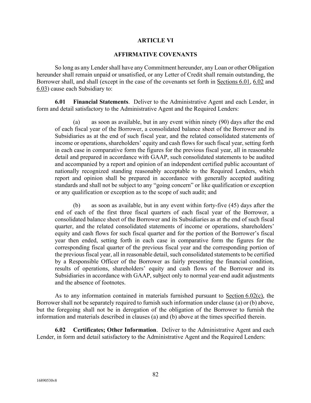 16890530v8 82 ARTICLE VI AFFIRMATIVE COVENANTS So long as any Lender shall have any Commitment hereunder, any Loan or other Obligation hereunder shall remain unpaid or unsatisfied, or any Letter of Credit shall remain outstanding, the Borrower shall, and shall (except in the case of the covenants set forth in Sections 6.01, 6.02 and 6.03) cause each Subsidiary to: 6.01 Financial Statements. Deliver to the Administrative Agent and each Lender, in form and detail satisfactory to the Administrative Agent and the Required Lenders: (a) as soon as available, but in any event within ninety (90) days after the end of each fiscal year of the Borrower, a consolidated balance sheet of the Borrower and its Subsidiaries as at the end of such fiscal year, and the related consolidated statements of income or operations, shareholders’ equity and cash flows for such fiscal year, setting forth in each case in comparative form the figures for the previous fiscal year, all in reasonable detail and prepared in accordance with GAAP, such consolidated statements to be audited and accompanied by a report and opinion of an independent certified public accountant of nationally recognized standing reasonably acceptable to the Required Lenders, which report and opinion shall be prepared in accordance with generally accepted auditing standards and shall not be subject to any “going concern” or like qualification or exception or any qualification or exception as to the scope of such audit; and (b) as soon as available, but in any event within forty-five (45) days after the end of each of the first three fiscal quarters of each fiscal year of the Borrower, a consolidated balance sheet of the Borrower and its Subsidiaries as at the end of such fiscal quarter, and the related consolidated statements of income or operations, shareholders’ equity and cash flows for such fiscal quarter and for the portion of the Borrower’s fiscal year then ended, setting forth in each case in comparative form the figures for the corresponding fiscal quarter of the previous fiscal year and the corresponding portion of the previous fiscal year, all in reasonable detail, such consolidated statements to be certified by a Responsible Officer of the Borrower as fairly presenting the financial condition, results of operations, shareholders’ equity and cash flows of the Borrower and its Subsidiaries in accordance with GAAP, subject only to normal year-end audit adjustments and the absence of footnotes. As to any information contained in materials furnished pursuant to Section 6.02(c), the Borrower shall not be separately required to furnish such information under clause (a) or (b) above, but the foregoing shall not be in derogation of the obligation of the Borrower to furnish the information and materials described in clauses (a) and (b) above at the times specified therein. 6.02 Certificates; Other Information. Deliver to the Administrative Agent and each Lender, in form and detail satisfactory to the Administrative Agent and the Required Lenders:
