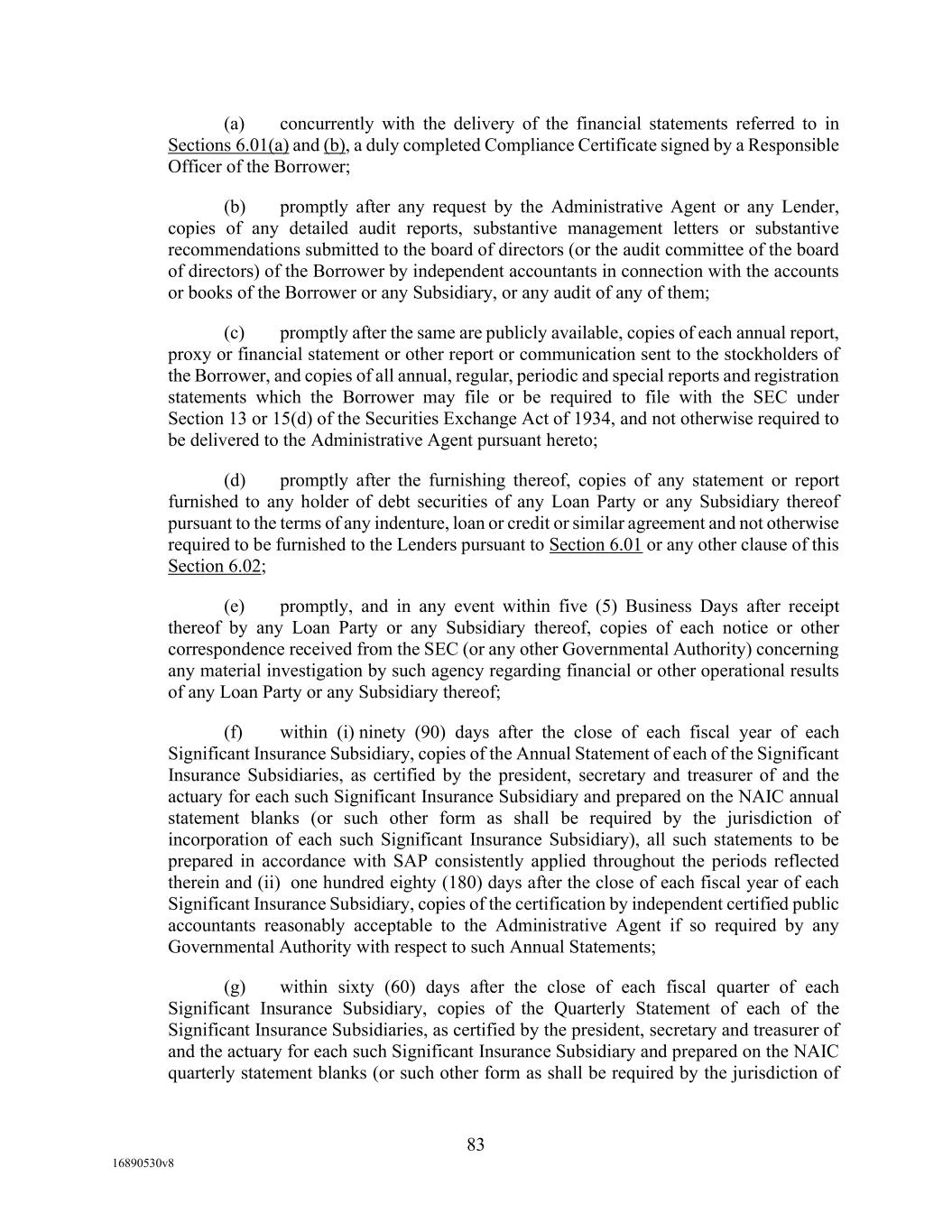 16890530v8 83 (a) concurrently with the delivery of the financial statements referred to in Sections 6.01(a) and (b), a duly completed Compliance Certificate signed by a Responsible Officer of the Borrower; (b) promptly after any request by the Administrative Agent or any Lender, copies of any detailed audit reports, substantive management letters or substantive recommendations submitted to the board of directors (or the audit committee of the board of directors) of the Borrower by independent accountants in connection with the accounts or books of the Borrower or any Subsidiary, or any audit of any of them; (c) promptly after the same are publicly available, copies of each annual report, proxy or financial statement or other report or communication sent to the stockholders of the Borrower, and copies of all annual, regular, periodic and special reports and registration statements which the Borrower may file or be required to file with the SEC under Section 13 or 15(d) of the Securities Exchange Act of 1934, and not otherwise required to be delivered to the Administrative Agent pursuant hereto; (d) promptly after the furnishing thereof, copies of any statement or report furnished to any holder of debt securities of any Loan Party or any Subsidiary thereof pursuant to the terms of any indenture, loan or credit or similar agreement and not otherwise required to be furnished to the Lenders pursuant to Section 6.01 or any other clause of this Section 6.02; (e) promptly, and in any event within five (5) Business Days after receipt thereof by any Loan Party or any Subsidiary thereof, copies of each notice or other correspondence received from the SEC (or any other Governmental Authority) concerning any material investigation by such agency regarding financial or other operational results of any Loan Party or any Subsidiary thereof; (f) within (i) ninety (90) days after the close of each fiscal year of each Significant Insurance Subsidiary, copies of the Annual Statement of each of the Significant Insurance Subsidiaries, as certified by the president, secretary and treasurer of and the actuary for each such Significant Insurance Subsidiary and prepared on the NAIC annual statement blanks (or such other form as shall be required by the jurisdiction of incorporation of each such Significant Insurance Subsidiary), all such statements to be prepared in accordance with SAP consistently applied throughout the periods reflected therein and (ii) one hundred eighty (180) days after the close of each fiscal year of each Significant Insurance Subsidiary, copies of the certification by independent certified public accountants reasonably acceptable to the Administrative Agent if so required by any Governmental Authority with respect to such Annual Statements; (g) within sixty (60) days after the close of each fiscal quarter of each Significant Insurance Subsidiary, copies of the Quarterly Statement of each of the Significant Insurance Subsidiaries, as certified by the president, secretary and treasurer of and the actuary for each such Significant Insurance Subsidiary and prepared on the NAIC quarterly statement blanks (or such other form as shall be required by the jurisdiction of