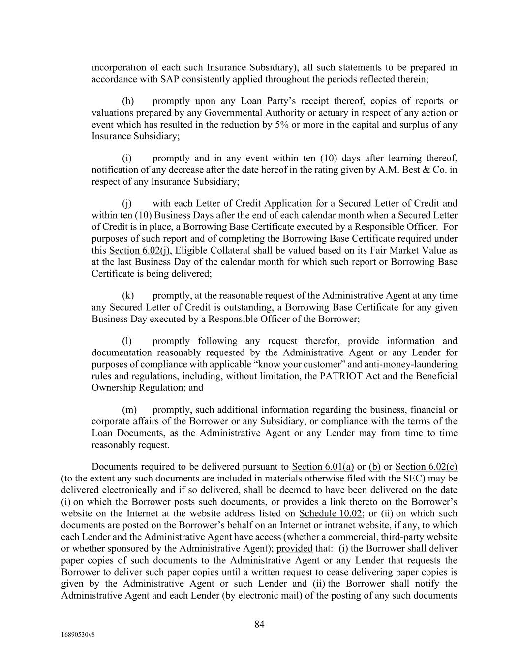 16890530v8 84 incorporation of each such Insurance Subsidiary), all such statements to be prepared in accordance with SAP consistently applied throughout the periods reflected therein; (h) promptly upon any Loan Party’s receipt thereof, copies of reports or valuations prepared by any Governmental Authority or actuary in respect of any action or event which has resulted in the reduction by 5% or more in the capital and surplus of any Insurance Subsidiary; (i) promptly and in any event within ten (10) days after learning thereof, notification of any decrease after the date hereof in the rating given by A.M. Best & Co. in respect of any Insurance Subsidiary; (j) with each Letter of Credit Application for a Secured Letter of Credit and within ten (10) Business Days after the end of each calendar month when a Secured Letter of Credit is in place, a Borrowing Base Certificate executed by a Responsible Officer. For purposes of such report and of completing the Borrowing Base Certificate required under this Section 6.02(j), Eligible Collateral shall be valued based on its Fair Market Value as at the last Business Day of the calendar month for which such report or Borrowing Base Certificate is being delivered; (k) promptly, at the reasonable request of the Administrative Agent at any time any Secured Letter of Credit is outstanding, a Borrowing Base Certificate for any given Business Day executed by a Responsible Officer of the Borrower; (l) promptly following any request therefor, provide information and documentation reasonably requested by the Administrative Agent or any Lender for purposes of compliance with applicable “know your customer” and anti-money-laundering rules and regulations, including, without limitation, the PATRIOT Act and the Beneficial Ownership Regulation; and (m) promptly, such additional information regarding the business, financial or corporate affairs of the Borrower or any Subsidiary, or compliance with the terms of the Loan Documents, as the Administrative Agent or any Lender may from time to time reasonably request. Documents required to be delivered pursuant to Section 6.01(a) or (b) or Section 6.02(c) (to the extent any such documents are included in materials otherwise filed with the SEC) may be delivered electronically and if so delivered, shall be deemed to have been delivered on the date (i) on which the Borrower posts such documents, or provides a link thereto on the Borrower’s website on the Internet at the website address listed on Schedule 10.02; or (ii) on which such documents are posted on the Borrower’s behalf on an Internet or intranet website, if any, to which each Lender and the Administrative Agent have access (whether a commercial, third-party website or whether sponsored by the Administrative Agent); provided that: (i) the Borrower shall deliver paper copies of such documents to the Administrative Agent or any Lender that requests the Borrower to deliver such paper copies until a written request to cease delivering paper copies is given by the Administrative Agent or such Lender and (ii) the Borrower shall notify the Administrative Agent and each Lender (by electronic mail) of the posting of any such documents