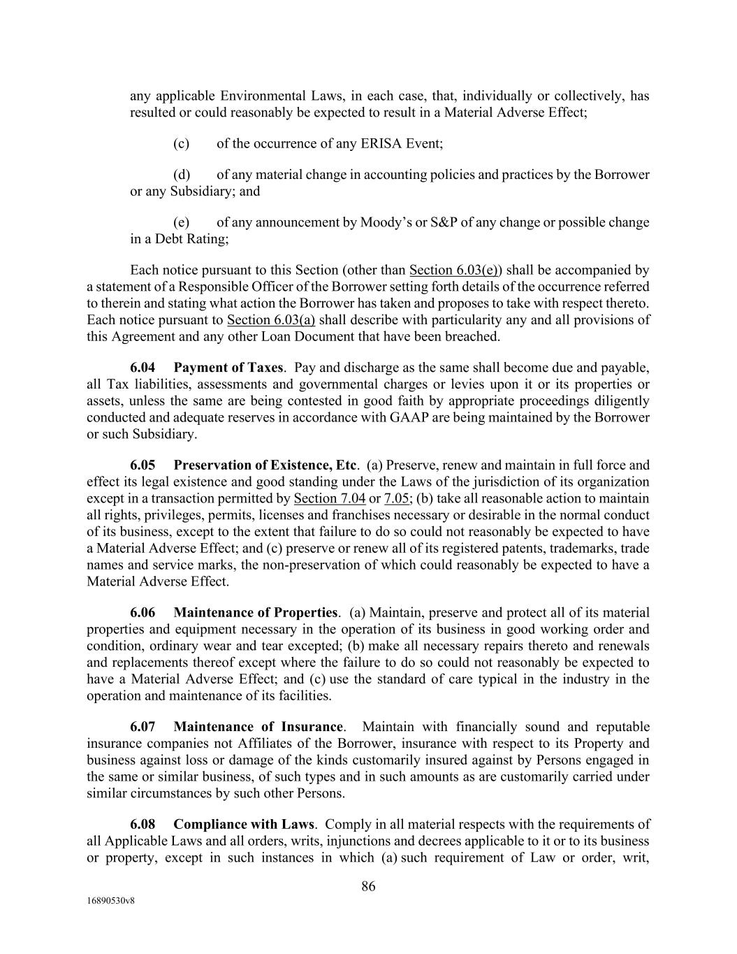 16890530v8 86 any applicable Environmental Laws, in each case, that, individually or collectively, has resulted or could reasonably be expected to result in a Material Adverse Effect; (c) of the occurrence of any ERISA Event; (d) of any material change in accounting policies and practices by the Borrower or any Subsidiary; and (e) of any announcement by Moody’s or S&P of any change or possible change in a Debt Rating; Each notice pursuant to this Section (other than Section 6.03(e)) shall be accompanied by a statement of a Responsible Officer of the Borrower setting forth details of the occurrence referred to therein and stating what action the Borrower has taken and proposes to take with respect thereto. Each notice pursuant to Section 6.03(a) shall describe with particularity any and all provisions of this Agreement and any other Loan Document that have been breached. 6.04 Payment of Taxes. Pay and discharge as the same shall become due and payable, all Tax liabilities, assessments and governmental charges or levies upon it or its properties or assets, unless the same are being contested in good faith by appropriate proceedings diligently conducted and adequate reserves in accordance with GAAP are being maintained by the Borrower or such Subsidiary. 6.05 Preservation of Existence, Etc. (a) Preserve, renew and maintain in full force and effect its legal existence and good standing under the Laws of the jurisdiction of its organization except in a transaction permitted by Section 7.04 or 7.05; (b) take all reasonable action to maintain all rights, privileges, permits, licenses and franchises necessary or desirable in the normal conduct of its business, except to the extent that failure to do so could not reasonably be expected to have a Material Adverse Effect; and (c) preserve or renew all of its registered patents, trademarks, trade names and service marks, the non-preservation of which could reasonably be expected to have a Material Adverse Effect. 6.06 Maintenance of Properties. (a) Maintain, preserve and protect all of its material properties and equipment necessary in the operation of its business in good working order and condition, ordinary wear and tear excepted; (b) make all necessary repairs thereto and renewals and replacements thereof except where the failure to do so could not reasonably be expected to have a Material Adverse Effect; and (c) use the standard of care typical in the industry in the operation and maintenance of its facilities. 6.07 Maintenance of Insurance. Maintain with financially sound and reputable insurance companies not Affiliates of the Borrower, insurance with respect to its Property and business against loss or damage of the kinds customarily insured against by Persons engaged in the same or similar business, of such types and in such amounts as are customarily carried under similar circumstances by such other Persons. 6.08 Compliance with Laws. Comply in all material respects with the requirements of all Applicable Laws and all orders, writs, injunctions and decrees applicable to it or to its business or property, except in such instances in which (a) such requirement of Law or order, writ,