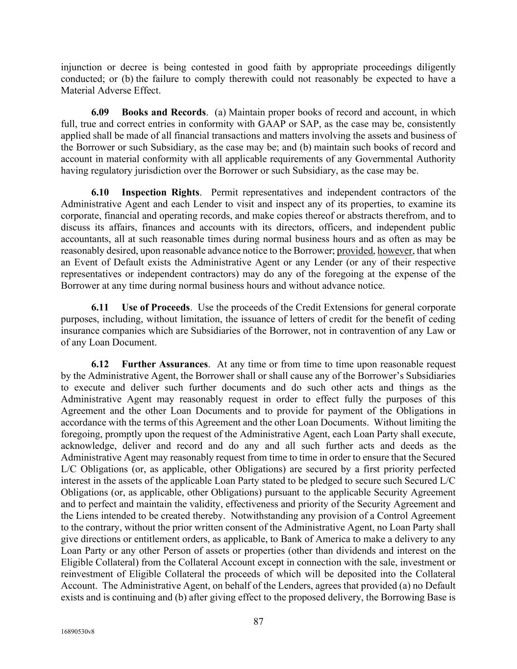 16890530v8 87 injunction or decree is being contested in good faith by appropriate proceedings diligently conducted; or (b) the failure to comply therewith could not reasonably be expected to have a Material Adverse Effect. 6.09 Books and Records. (a) Maintain proper books of record and account, in which full, true and correct entries in conformity with GAAP or SAP, as the case may be, consistently applied shall be made of all financial transactions and matters involving the assets and business of the Borrower or such Subsidiary, as the case may be; and (b) maintain such books of record and account in material conformity with all applicable requirements of any Governmental Authority having regulatory jurisdiction over the Borrower or such Subsidiary, as the case may be. 6.10 Inspection Rights. Permit representatives and independent contractors of the Administrative Agent and each Lender to visit and inspect any of its properties, to examine its corporate, financial and operating records, and make copies thereof or abstracts therefrom, and to discuss its affairs, finances and accounts with its directors, officers, and independent public accountants, all at such reasonable times during normal business hours and as often as may be reasonably desired, upon reasonable advance notice to the Borrower; provided, however, that when an Event of Default exists the Administrative Agent or any Lender (or any of their respective representatives or independent contractors) may do any of the foregoing at the expense of the Borrower at any time during normal business hours and without advance notice. 6.11 Use of Proceeds. Use the proceeds of the Credit Extensions for general corporate purposes, including, without limitation, the issuance of letters of credit for the benefit of ceding insurance companies which are Subsidiaries of the Borrower, not in contravention of any Law or of any Loan Document. 6.12 Further Assurances. At any time or from time to time upon reasonable request by the Administrative Agent, the Borrower shall or shall cause any of the Borrower’s Subsidiaries to execute and deliver such further documents and do such other acts and things as the Administrative Agent may reasonably request in order to effect fully the purposes of this Agreement and the other Loan Documents and to provide for payment of the Obligations in accordance with the terms of this Agreement and the other Loan Documents. Without limiting the foregoing, promptly upon the request of the Administrative Agent, each Loan Party shall execute, acknowledge, deliver and record and do any and all such further acts and deeds as the Administrative Agent may reasonably request from time to time in order to ensure that the Secured L/C Obligations (or, as applicable, other Obligations) are secured by a first priority perfected interest in the assets of the applicable Loan Party stated to be pledged to secure such Secured L/C Obligations (or, as applicable, other Obligations) pursuant to the applicable Security Agreement and to perfect and maintain the validity, effectiveness and priority of the Security Agreement and the Liens intended to be created thereby. Notwithstanding any provision of a Control Agreement to the contrary, without the prior written consent of the Administrative Agent, no Loan Party shall give directions or entitlement orders, as applicable, to Bank of America to make a delivery to any Loan Party or any other Person of assets or properties (other than dividends and interest on the Eligible Collateral) from the Collateral Account except in connection with the sale, investment or reinvestment of Eligible Collateral the proceeds of which will be deposited into the Collateral Account. The Administrative Agent, on behalf of the Lenders, agrees that provided (a) no Default exists and is continuing and (b) after giving effect to the proposed delivery, the Borrowing Base is