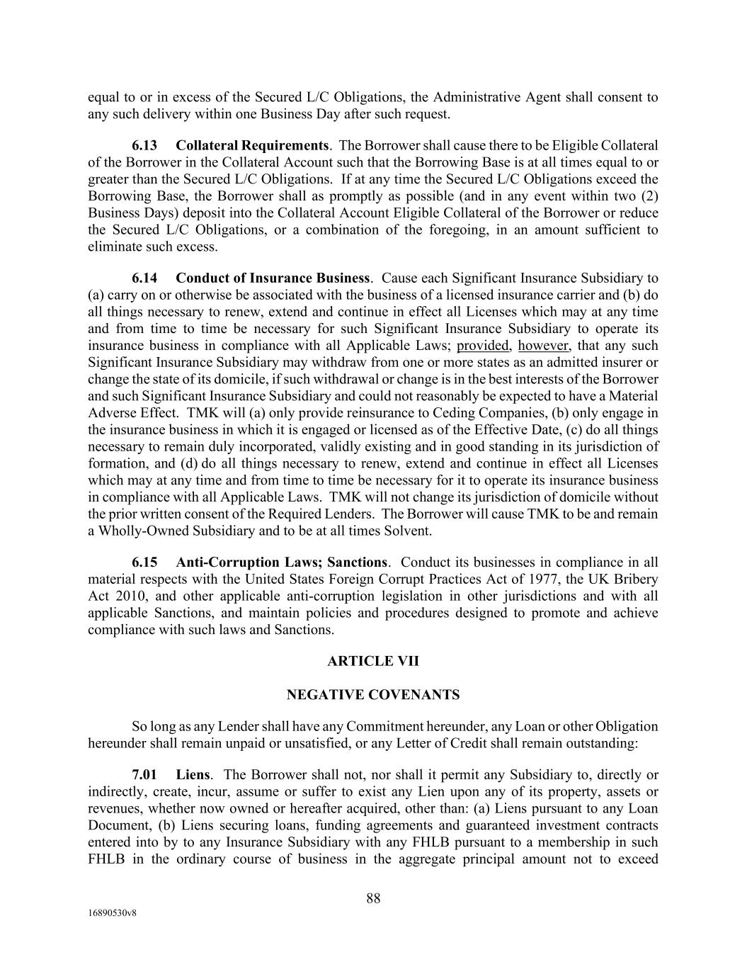 16890530v8 88 equal to or in excess of the Secured L/C Obligations, the Administrative Agent shall consent to any such delivery within one Business Day after such request. 6.13 Collateral Requirements. The Borrower shall cause there to be Eligible Collateral of the Borrower in the Collateral Account such that the Borrowing Base is at all times equal to or greater than the Secured L/C Obligations. If at any time the Secured L/C Obligations exceed the Borrowing Base, the Borrower shall as promptly as possible (and in any event within two (2) Business Days) deposit into the Collateral Account Eligible Collateral of the Borrower or reduce the Secured L/C Obligations, or a combination of the foregoing, in an amount sufficient to eliminate such excess. 6.14 Conduct of Insurance Business. Cause each Significant Insurance Subsidiary to (a) carry on or otherwise be associated with the business of a licensed insurance carrier and (b) do all things necessary to renew, extend and continue in effect all Licenses which may at any time and from time to time be necessary for such Significant Insurance Subsidiary to operate its insurance business in compliance with all Applicable Laws; provided, however, that any such Significant Insurance Subsidiary may withdraw from one or more states as an admitted insurer or change the state of its domicile, if such withdrawal or change is in the best interests of the Borrower and such Significant Insurance Subsidiary and could not reasonably be expected to have a Material Adverse Effect. TMK will (a) only provide reinsurance to Ceding Companies, (b) only engage in the insurance business in which it is engaged or licensed as of the Effective Date, (c) do all things necessary to remain duly incorporated, validly existing and in good standing in its jurisdiction of formation, and (d) do all things necessary to renew, extend and continue in effect all Licenses which may at any time and from time to time be necessary for it to operate its insurance business in compliance with all Applicable Laws. TMK will not change its jurisdiction of domicile without the prior written consent of the Required Lenders. The Borrower will cause TMK to be and remain a Wholly-Owned Subsidiary and to be at all times Solvent. 6.15 Anti-Corruption Laws; Sanctions. Conduct its businesses in compliance in all material respects with the United States Foreign Corrupt Practices Act of 1977, the UK Bribery Act 2010, and other applicable anti-corruption legislation in other jurisdictions and with all applicable Sanctions, and maintain policies and procedures designed to promote and achieve compliance with such laws and Sanctions. ARTICLE VII NEGATIVE COVENANTS So long as any Lender shall have any Commitment hereunder, any Loan or other Obligation hereunder shall remain unpaid or unsatisfied, or any Letter of Credit shall remain outstanding: 7.01 Liens. The Borrower shall not, nor shall it permit any Subsidiary to, directly or indirectly, create, incur, assume or suffer to exist any Lien upon any of its property, assets or revenues, whether now owned or hereafter acquired, other than: (a) Liens pursuant to any Loan Document, (b) Liens securing loans, funding agreements and guaranteed investment contracts entered into by to any Insurance Subsidiary with any FHLB pursuant to a membership in such FHLB in the ordinary course of business in the aggregate principal amount not to exceed