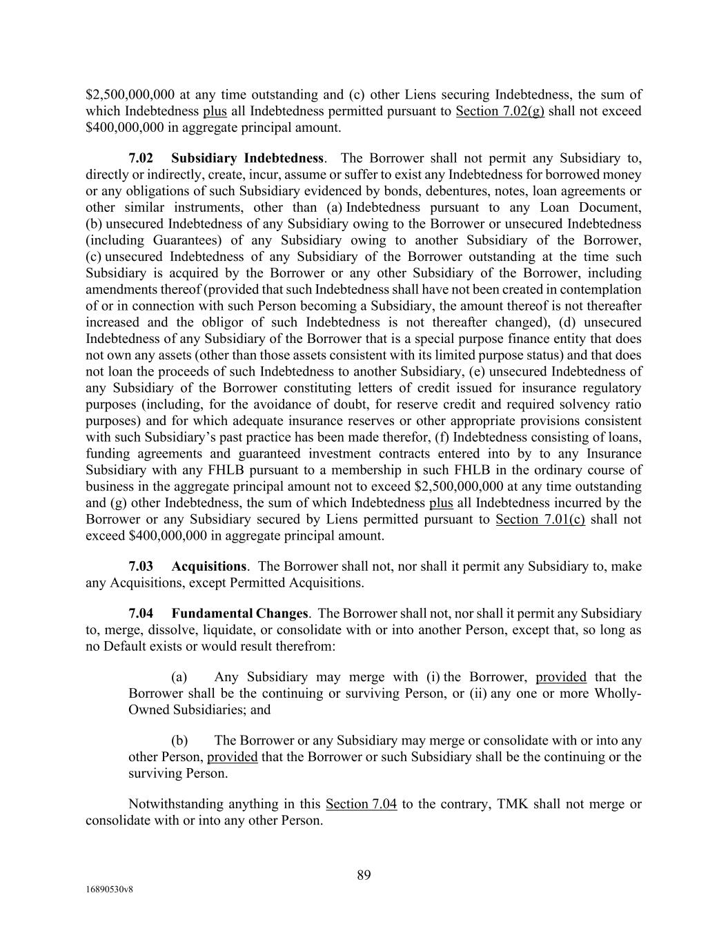 16890530v8 89 $2,500,000,000 at any time outstanding and (c) other Liens securing Indebtedness, the sum of which Indebtedness plus all Indebtedness permitted pursuant to Section 7.02(g) shall not exceed $400,000,000 in aggregate principal amount. 7.02 Subsidiary Indebtedness. The Borrower shall not permit any Subsidiary to, directly or indirectly, create, incur, assume or suffer to exist any Indebtedness for borrowed money or any obligations of such Subsidiary evidenced by bonds, debentures, notes, loan agreements or other similar instruments, other than (a) Indebtedness pursuant to any Loan Document, (b) unsecured Indebtedness of any Subsidiary owing to the Borrower or unsecured Indebtedness (including Guarantees) of any Subsidiary owing to another Subsidiary of the Borrower, (c) unsecured Indebtedness of any Subsidiary of the Borrower outstanding at the time such Subsidiary is acquired by the Borrower or any other Subsidiary of the Borrower, including amendments thereof (provided that such Indebtedness shall have not been created in contemplation of or in connection with such Person becoming a Subsidiary, the amount thereof is not thereafter increased and the obligor of such Indebtedness is not thereafter changed), (d) unsecured Indebtedness of any Subsidiary of the Borrower that is a special purpose finance entity that does not own any assets (other than those assets consistent with its limited purpose status) and that does not loan the proceeds of such Indebtedness to another Subsidiary, (e) unsecured Indebtedness of any Subsidiary of the Borrower constituting letters of credit issued for insurance regulatory purposes (including, for the avoidance of doubt, for reserve credit and required solvency ratio purposes) and for which adequate insurance reserves or other appropriate provisions consistent with such Subsidiary’s past practice has been made therefor, (f) Indebtedness consisting of loans, funding agreements and guaranteed investment contracts entered into by to any Insurance Subsidiary with any FHLB pursuant to a membership in such FHLB in the ordinary course of business in the aggregate principal amount not to exceed $2,500,000,000 at any time outstanding and (g) other Indebtedness, the sum of which Indebtedness plus all Indebtedness incurred by the Borrower or any Subsidiary secured by Liens permitted pursuant to Section 7.01(c) shall not exceed $400,000,000 in aggregate principal amount. 7.03 Acquisitions. The Borrower shall not, nor shall it permit any Subsidiary to, make any Acquisitions, except Permitted Acquisitions. 7.04 Fundamental Changes. The Borrower shall not, nor shall it permit any Subsidiary to, merge, dissolve, liquidate, or consolidate with or into another Person, except that, so long as no Default exists or would result therefrom: (a) Any Subsidiary may merge with (i) the Borrower, provided that the Borrower shall be the continuing or surviving Person, or (ii) any one or more Wholly- Owned Subsidiaries; and (b) The Borrower or any Subsidiary may merge or consolidate with or into any other Person, provided that the Borrower or such Subsidiary shall be the continuing or the surviving Person. Notwithstanding anything in this Section 7.04 to the contrary, TMK shall not merge or consolidate with or into any other Person.