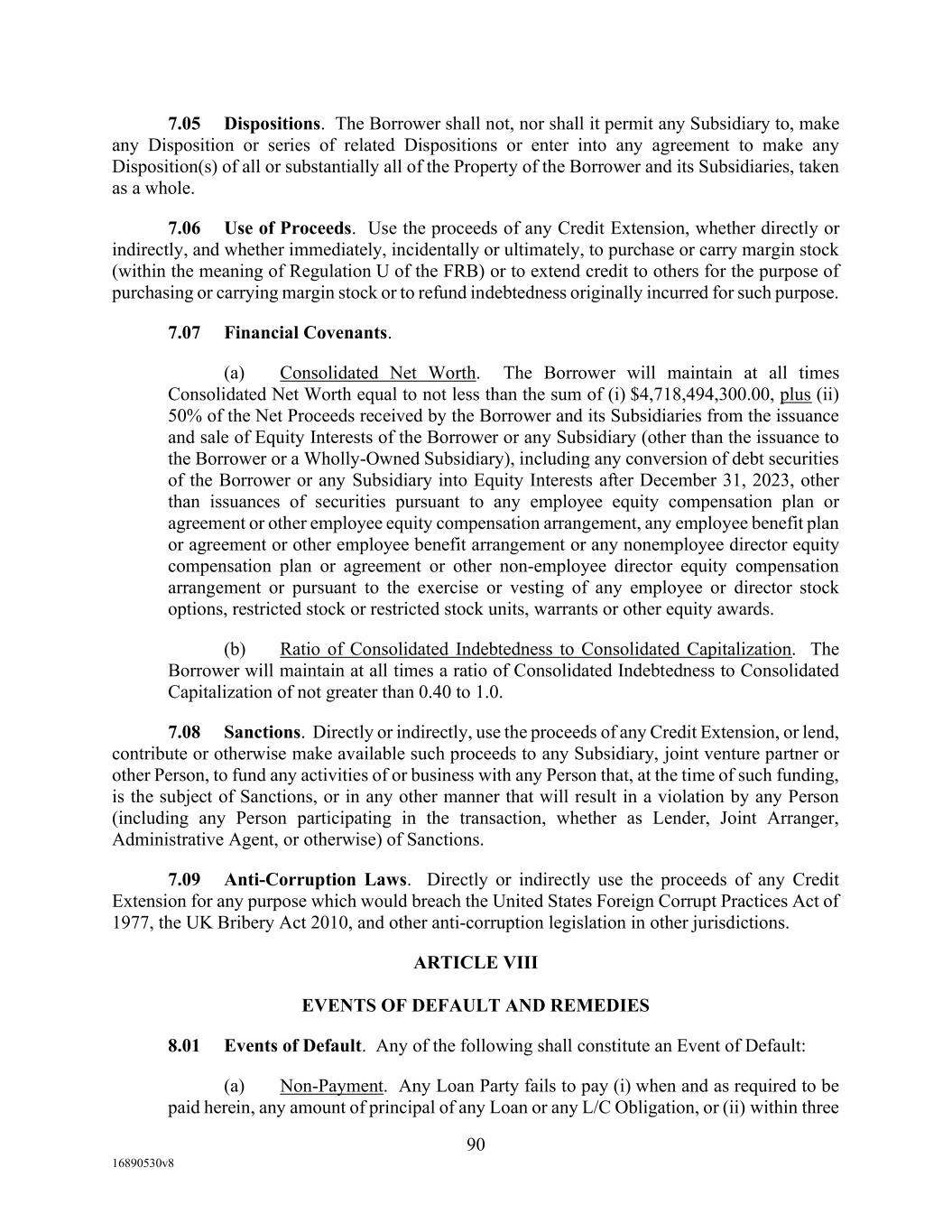 16890530v8 90 7.05 Dispositions. The Borrower shall not, nor shall it permit any Subsidiary to, make any Disposition or series of related Dispositions or enter into any agreement to make any Disposition(s) of all or substantially all of the Property of the Borrower and its Subsidiaries, taken as a whole. 7.06 Use of Proceeds. Use the proceeds of any Credit Extension, whether directly or indirectly, and whether immediately, incidentally or ultimately, to purchase or carry margin stock (within the meaning of Regulation U of the FRB) or to extend credit to others for the purpose of purchasing or carrying margin stock or to refund indebtedness originally incurred for such purpose. 7.07 Financial Covenants. (a) Consolidated Net Worth. The Borrower will maintain at all times Consolidated Net Worth equal to not less than the sum of (i) $4,718,494,300.00, plus (ii) 50% of the Net Proceeds received by the Borrower and its Subsidiaries from the issuance and sale of Equity Interests of the Borrower or any Subsidiary (other than the issuance to the Borrower or a Wholly-Owned Subsidiary), including any conversion of debt securities of the Borrower or any Subsidiary into Equity Interests after December 31, 2023, other than issuances of securities pursuant to any employee equity compensation plan or agreement or other employee equity compensation arrangement, any employee benefit plan or agreement or other employee benefit arrangement or any nonemployee director equity compensation plan or agreement or other non-employee director equity compensation arrangement or pursuant to the exercise or vesting of any employee or director stock options, restricted stock or restricted stock units, warrants or other equity awards. (b) Ratio of Consolidated Indebtedness to Consolidated Capitalization. The Borrower will maintain at all times a ratio of Consolidated Indebtedness to Consolidated Capitalization of not greater than 0.40 to 1.0. 7.08 Sanctions. Directly or indirectly, use the proceeds of any Credit Extension, or lend, contribute or otherwise make available such proceeds to any Subsidiary, joint venture partner or other Person, to fund any activities of or business with any Person that, at the time of such funding, is the subject of Sanctions, or in any other manner that will result in a violation by any Person (including any Person participating in the transaction, whether as Lender, Joint Arranger, Administrative Agent, or otherwise) of Sanctions. 7.09 Anti-Corruption Laws. Directly or indirectly use the proceeds of any Credit Extension for any purpose which would breach the United States Foreign Corrupt Practices Act of 1977, the UK Bribery Act 2010, and other anti-corruption legislation in other jurisdictions. ARTICLE VIII EVENTS OF DEFAULT AND REMEDIES 8.01 Events of Default. Any of the following shall constitute an Event of Default: (a) Non-Payment. Any Loan Party fails to pay (i) when and as required to be paid herein, any amount of principal of any Loan or any L/C Obligation, or (ii) within three