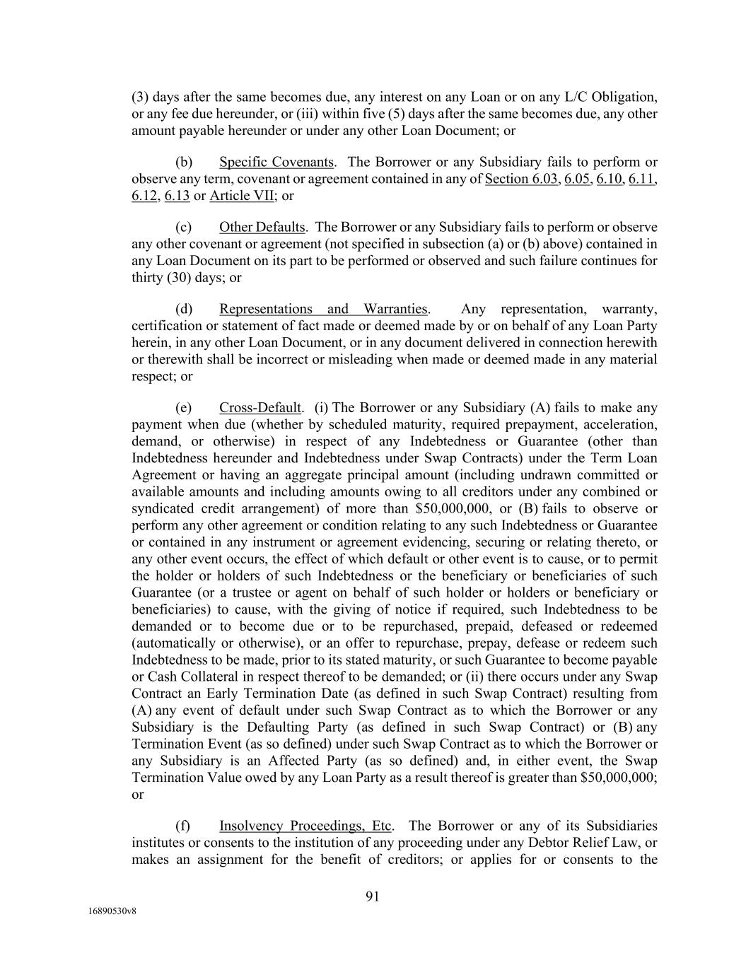 16890530v8 91 (3) days after the same becomes due, any interest on any Loan or on any L/C Obligation, or any fee due hereunder, or (iii) within five (5) days after the same becomes due, any other amount payable hereunder or under any other Loan Document; or (b) Specific Covenants. The Borrower or any Subsidiary fails to perform or observe any term, covenant or agreement contained in any of Section 6.03, 6.05, 6.10, 6.11, 6.12, 6.13 or Article VII; or (c) Other Defaults. The Borrower or any Subsidiary fails to perform or observe any other covenant or agreement (not specified in subsection (a) or (b) above) contained in any Loan Document on its part to be performed or observed and such failure continues for thirty (30) days; or (d) Representations and Warranties. Any representation, warranty, certification or statement of fact made or deemed made by or on behalf of any Loan Party herein, in any other Loan Document, or in any document delivered in connection herewith or therewith shall be incorrect or misleading when made or deemed made in any material respect; or (e) Cross-Default. (i) The Borrower or any Subsidiary (A) fails to make any payment when due (whether by scheduled maturity, required prepayment, acceleration, demand, or otherwise) in respect of any Indebtedness or Guarantee (other than Indebtedness hereunder and Indebtedness under Swap Contracts) under the Term Loan Agreement or having an aggregate principal amount (including undrawn committed or available amounts and including amounts owing to all creditors under any combined or syndicated credit arrangement) of more than $50,000,000, or (B) fails to observe or perform any other agreement or condition relating to any such Indebtedness or Guarantee or contained in any instrument or agreement evidencing, securing or relating thereto, or any other event occurs, the effect of which default or other event is to cause, or to permit the holder or holders of such Indebtedness or the beneficiary or beneficiaries of such Guarantee (or a trustee or agent on behalf of such holder or holders or beneficiary or beneficiaries) to cause, with the giving of notice if required, such Indebtedness to be demanded or to become due or to be repurchased, prepaid, defeased or redeemed (automatically or otherwise), or an offer to repurchase, prepay, defease or redeem such Indebtedness to be made, prior to its stated maturity, or such Guarantee to become payable or Cash Collateral in respect thereof to be demanded; or (ii) there occurs under any Swap Contract an Early Termination Date (as defined in such Swap Contract) resulting from (A) any event of default under such Swap Contract as to which the Borrower or any Subsidiary is the Defaulting Party (as defined in such Swap Contract) or (B) any Termination Event (as so defined) under such Swap Contract as to which the Borrower or any Subsidiary is an Affected Party (as so defined) and, in either event, the Swap Termination Value owed by any Loan Party as a result thereof is greater than $50,000,000; or (f) Insolvency Proceedings, Etc. The Borrower or any of its Subsidiaries institutes or consents to the institution of any proceeding under any Debtor Relief Law, or makes an assignment for the benefit of creditors; or applies for or consents to the