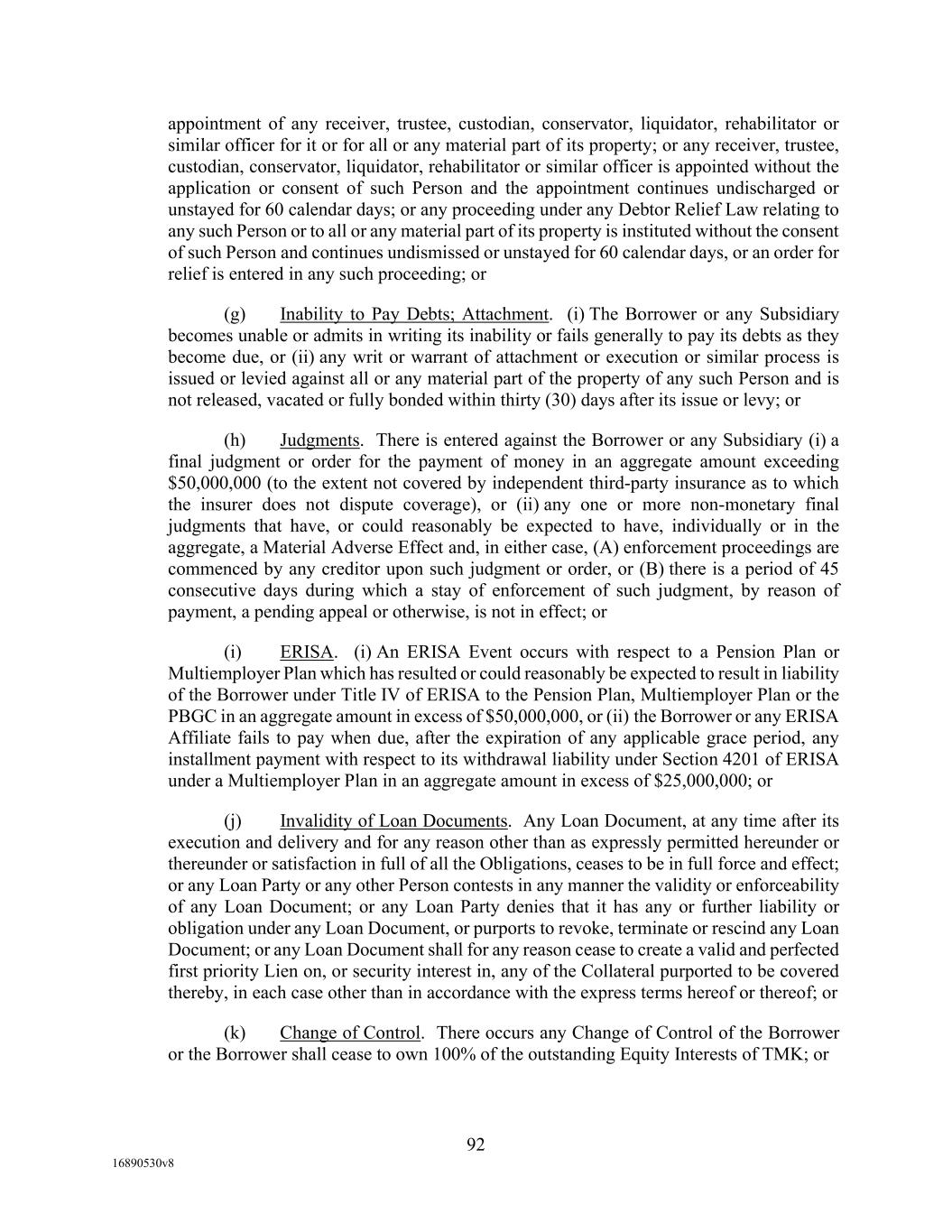 16890530v8 92 appointment of any receiver, trustee, custodian, conservator, liquidator, rehabilitator or similar officer for it or for all or any material part of its property; or any receiver, trustee, custodian, conservator, liquidator, rehabilitator or similar officer is appointed without the application or consent of such Person and the appointment continues undischarged or unstayed for 60 calendar days; or any proceeding under any Debtor Relief Law relating to any such Person or to all or any material part of its property is instituted without the consent of such Person and continues undismissed or unstayed for 60 calendar days, or an order for relief is entered in any such proceeding; or (g) Inability to Pay Debts; Attachment. (i) The Borrower or any Subsidiary becomes unable or admits in writing its inability or fails generally to pay its debts as they become due, or (ii) any writ or warrant of attachment or execution or similar process is issued or levied against all or any material part of the property of any such Person and is not released, vacated or fully bonded within thirty (30) days after its issue or levy; or (h) Judgments. There is entered against the Borrower or any Subsidiary (i) a final judgment or order for the payment of money in an aggregate amount exceeding $50,000,000 (to the extent not covered by independent third-party insurance as to which the insurer does not dispute coverage), or (ii) any one or more non-monetary final judgments that have, or could reasonably be expected to have, individually or in the aggregate, a Material Adverse Effect and, in either case, (A) enforcement proceedings are commenced by any creditor upon such judgment or order, or (B) there is a period of 45 consecutive days during which a stay of enforcement of such judgment, by reason of payment, a pending appeal or otherwise, is not in effect; or (i) ERISA. (i) An ERISA Event occurs with respect to a Pension Plan or Multiemployer Plan which has resulted or could reasonably be expected to result in liability of the Borrower under Title IV of ERISA to the Pension Plan, Multiemployer Plan or the PBGC in an aggregate amount in excess of $50,000,000, or (ii) the Borrower or any ERISA Affiliate fails to pay when due, after the expiration of any applicable grace period, any installment payment with respect to its withdrawal liability under Section 4201 of ERISA under a Multiemployer Plan in an aggregate amount in excess of $25,000,000; or (j) Invalidity of Loan Documents. Any Loan Document, at any time after its execution and delivery and for any reason other than as expressly permitted hereunder or thereunder or satisfaction in full of all the Obligations, ceases to be in full force and effect; or any Loan Party or any other Person contests in any manner the validity or enforceability of any Loan Document; or any Loan Party denies that it has any or further liability or obligation under any Loan Document, or purports to revoke, terminate or rescind any Loan Document; or any Loan Document shall for any reason cease to create a valid and perfected first priority Lien on, or security interest in, any of the Collateral purported to be covered thereby, in each case other than in accordance with the express terms hereof or thereof; or (k) Change of Control. There occurs any Change of Control of the Borrower or the Borrower shall cease to own 100% of the outstanding Equity Interests of TMK; or