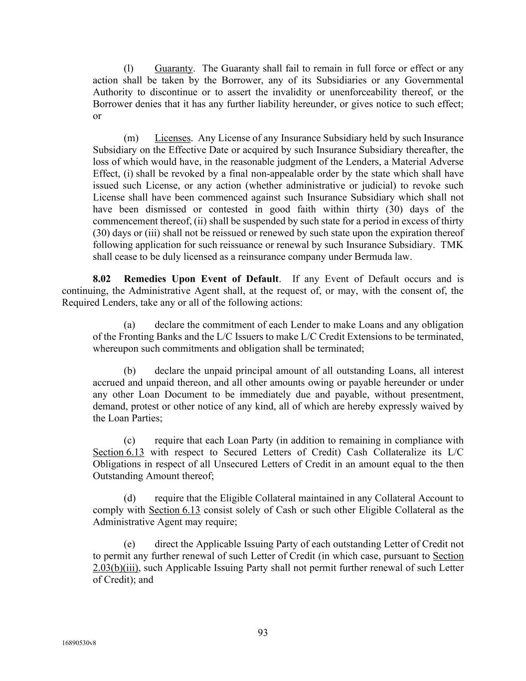 16890530v8 93 (l) Guaranty. The Guaranty shall fail to remain in full force or effect or any action shall be taken by the Borrower, any of its Subsidiaries or any Governmental Authority to discontinue or to assert the invalidity or unenforceability thereof, or the Borrower denies that it has any further liability hereunder, or gives notice to such effect; or (m) Licenses. Any License of any Insurance Subsidiary held by such Insurance Subsidiary on the Effective Date or acquired by such Insurance Subsidiary thereafter, the loss of which would have, in the reasonable judgment of the Lenders, a Material Adverse Effect, (i) shall be revoked by a final non-appealable order by the state which shall have issued such License, or any action (whether administrative or judicial) to revoke such License shall have been commenced against such Insurance Subsidiary which shall not have been dismissed or contested in good faith within thirty (30) days of the commencement thereof, (ii) shall be suspended by such state for a period in excess of thirty (30) days or (iii) shall not be reissued or renewed by such state upon the expiration thereof following application for such reissuance or renewal by such Insurance Subsidiary. TMK shall cease to be duly licensed as a reinsurance company under Bermuda law. 8.02 Remedies Upon Event of Default. If any Event of Default occurs and is continuing, the Administrative Agent shall, at the request of, or may, with the consent of, the Required Lenders, take any or all of the following actions: (a) declare the commitment of each Lender to make Loans and any obligation of the Fronting Banks and the L/C Issuers to make L/C Credit Extensions to be terminated, whereupon such commitments and obligation shall be terminated; (b) declare the unpaid principal amount of all outstanding Loans, all interest accrued and unpaid thereon, and all other amounts owing or payable hereunder or under any other Loan Document to be immediately due and payable, without presentment, demand, protest or other notice of any kind, all of which are hereby expressly waived by the Loan Parties; (c) require that each Loan Party (in addition to remaining in compliance with Section 6.13 with respect to Secured Letters of Credit) Cash Collateralize its L/C Obligations in respect of all Unsecured Letters of Credit in an amount equal to the then Outstanding Amount thereof; (d) require that the Eligible Collateral maintained in any Collateral Account to comply with Section 6.13 consist solely of Cash or such other Eligible Collateral as the Administrative Agent may require; (e) direct the Applicable Issuing Party of each outstanding Letter of Credit not to permit any further renewal of such Letter of Credit (in which case, pursuant to Section 2.03(b)(iii), such Applicable Issuing Party shall not permit further renewal of such Letter of Credit); and