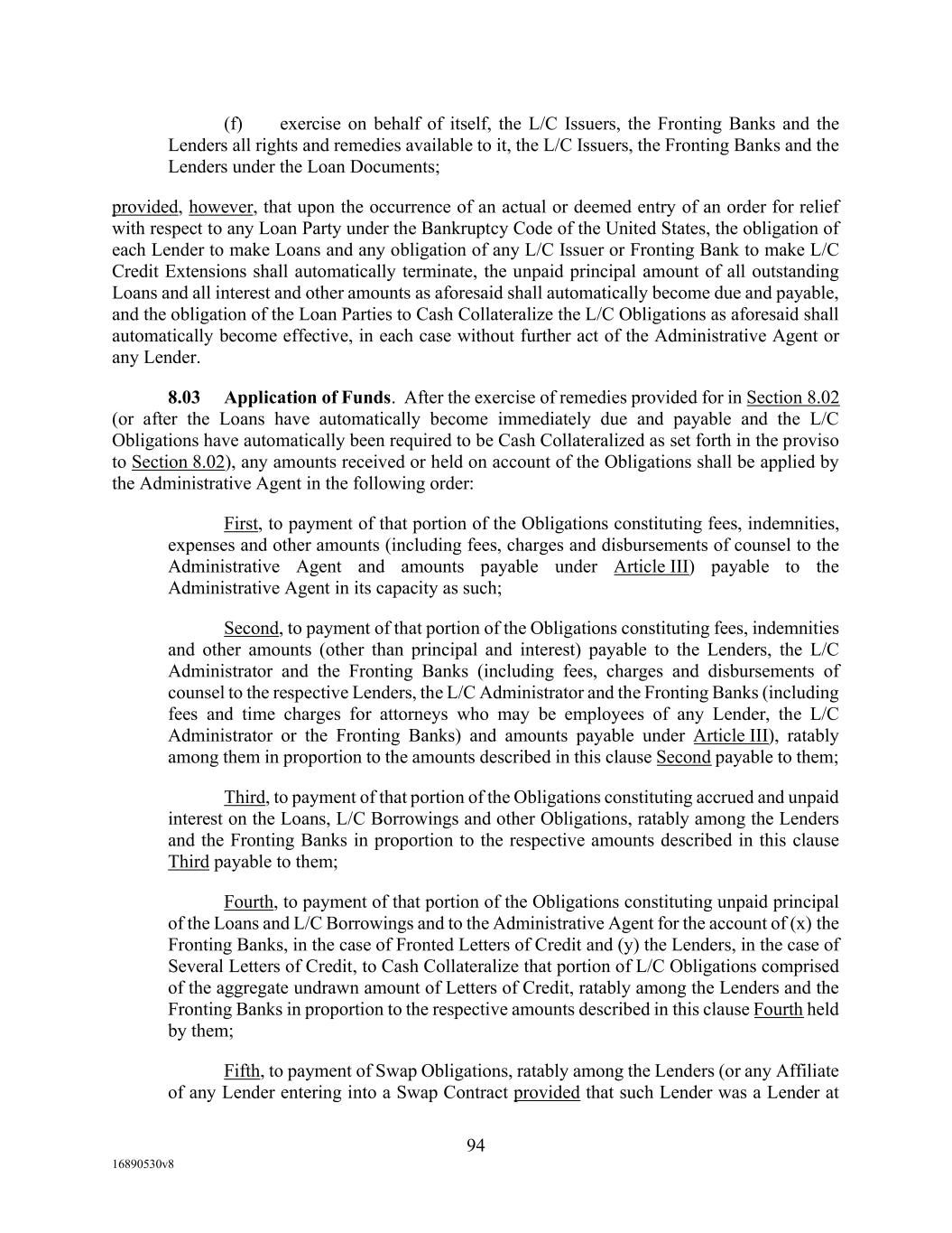 16890530v8 94 (f) exercise on behalf of itself, the L/C Issuers, the Fronting Banks and the Lenders all rights and remedies available to it, the L/C Issuers, the Fronting Banks and the Lenders under the Loan Documents; provided, however, that upon the occurrence of an actual or deemed entry of an order for relief with respect to any Loan Party under the Bankruptcy Code of the United States, the obligation of each Lender to make Loans and any obligation of any L/C Issuer or Fronting Bank to make L/C Credit Extensions shall automatically terminate, the unpaid principal amount of all outstanding Loans and all interest and other amounts as aforesaid shall automatically become due and payable, and the obligation of the Loan Parties to Cash Collateralize the L/C Obligations as aforesaid shall automatically become effective, in each case without further act of the Administrative Agent or any Lender. 8.03 Application of Funds. After the exercise of remedies provided for in Section 8.02 (or after the Loans have automatically become immediately due and payable and the L/C Obligations have automatically been required to be Cash Collateralized as set forth in the proviso to Section 8.02), any amounts received or held on account of the Obligations shall be applied by the Administrative Agent in the following order: First, to payment of that portion of the Obligations constituting fees, indemnities, expenses and other amounts (including fees, charges and disbursements of counsel to the Administrative Agent and amounts payable under Article III) payable to the Administrative Agent in its capacity as such; Second, to payment of that portion of the Obligations constituting fees, indemnities and other amounts (other than principal and interest) payable to the Lenders, the L/C Administrator and the Fronting Banks (including fees, charges and disbursements of counsel to the respective Lenders, the L/C Administrator and the Fronting Banks (including fees and time charges for attorneys who may be employees of any Lender, the L/C Administrator or the Fronting Banks) and amounts payable under Article III), ratably among them in proportion to the amounts described in this clause Second payable to them; Third, to payment of that portion of the Obligations constituting accrued and unpaid interest on the Loans, L/C Borrowings and other Obligations, ratably among the Lenders and the Fronting Banks in proportion to the respective amounts described in this clause Third payable to them; Fourth, to payment of that portion of the Obligations constituting unpaid principal of the Loans and L/C Borrowings and to the Administrative Agent for the account of (x) the Fronting Banks, in the case of Fronted Letters of Credit and (y) the Lenders, in the case of Several Letters of Credit, to Cash Collateralize that portion of L/C Obligations comprised of the aggregate undrawn amount of Letters of Credit, ratably among the Lenders and the Fronting Banks in proportion to the respective amounts described in this clause Fourth held by them; Fifth, to payment of Swap Obligations, ratably among the Lenders (or any Affiliate of any Lender entering into a Swap Contract provided that such Lender was a Lender at