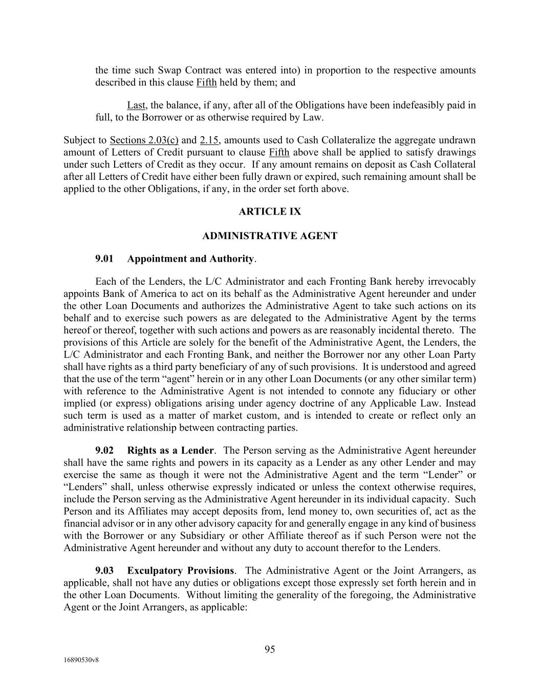 16890530v8 95 the time such Swap Contract was entered into) in proportion to the respective amounts described in this clause Fifth held by them; and Last, the balance, if any, after all of the Obligations have been indefeasibly paid in full, to the Borrower or as otherwise required by Law. Subject to Sections 2.03(c) and 2.15, amounts used to Cash Collateralize the aggregate undrawn amount of Letters of Credit pursuant to clause Fifth above shall be applied to satisfy drawings under such Letters of Credit as they occur. If any amount remains on deposit as Cash Collateral after all Letters of Credit have either been fully drawn or expired, such remaining amount shall be applied to the other Obligations, if any, in the order set forth above. ARTICLE IX ADMINISTRATIVE AGENT 9.01 Appointment and Authority. Each of the Lenders, the L/C Administrator and each Fronting Bank hereby irrevocably appoints Bank of America to act on its behalf as the Administrative Agent hereunder and under the other Loan Documents and authorizes the Administrative Agent to take such actions on its behalf and to exercise such powers as are delegated to the Administrative Agent by the terms hereof or thereof, together with such actions and powers as are reasonably incidental thereto. The provisions of this Article are solely for the benefit of the Administrative Agent, the Lenders, the L/C Administrator and each Fronting Bank, and neither the Borrower nor any other Loan Party shall have rights as a third party beneficiary of any of such provisions. It is understood and agreed that the use of the term “agent” herein or in any other Loan Documents (or any other similar term) with reference to the Administrative Agent is not intended to connote any fiduciary or other implied (or express) obligations arising under agency doctrine of any Applicable Law. Instead such term is used as a matter of market custom, and is intended to create or reflect only an administrative relationship between contracting parties. 9.02 Rights as a Lender. The Person serving as the Administrative Agent hereunder shall have the same rights and powers in its capacity as a Lender as any other Lender and may exercise the same as though it were not the Administrative Agent and the term “Lender” or “Lenders” shall, unless otherwise expressly indicated or unless the context otherwise requires, include the Person serving as the Administrative Agent hereunder in its individual capacity. Such Person and its Affiliates may accept deposits from, lend money to, own securities of, act as the financial advisor or in any other advisory capacity for and generally engage in any kind of business with the Borrower or any Subsidiary or other Affiliate thereof as if such Person were not the Administrative Agent hereunder and without any duty to account therefor to the Lenders. 9.03 Exculpatory Provisions. The Administrative Agent or the Joint Arrangers, as applicable, shall not have any duties or obligations except those expressly set forth herein and in the other Loan Documents. Without limiting the generality of the foregoing, the Administrative Agent or the Joint Arrangers, as applicable: