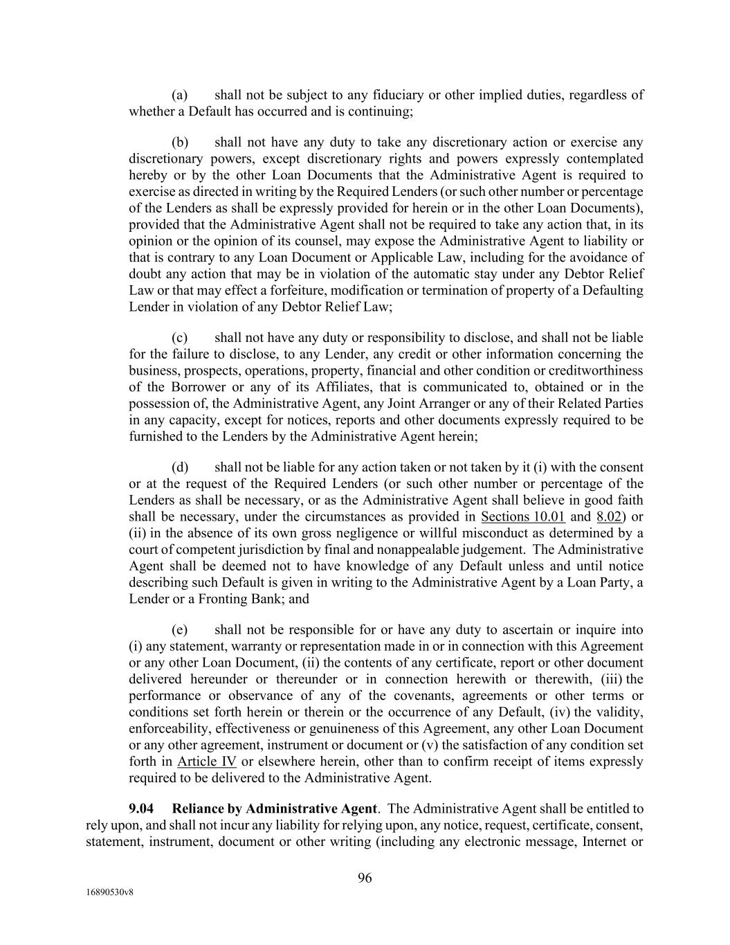 16890530v8 96 (a) shall not be subject to any fiduciary or other implied duties, regardless of whether a Default has occurred and is continuing; (b) shall not have any duty to take any discretionary action or exercise any discretionary powers, except discretionary rights and powers expressly contemplated hereby or by the other Loan Documents that the Administrative Agent is required to exercise as directed in writing by the Required Lenders (or such other number or percentage of the Lenders as shall be expressly provided for herein or in the other Loan Documents), provided that the Administrative Agent shall not be required to take any action that, in its opinion or the opinion of its counsel, may expose the Administrative Agent to liability or that is contrary to any Loan Document or Applicable Law, including for the avoidance of doubt any action that may be in violation of the automatic stay under any Debtor Relief Law or that may effect a forfeiture, modification or termination of property of a Defaulting Lender in violation of any Debtor Relief Law; (c) shall not have any duty or responsibility to disclose, and shall not be liable for the failure to disclose, to any Lender, any credit or other information concerning the business, prospects, operations, property, financial and other condition or creditworthiness of the Borrower or any of its Affiliates, that is communicated to, obtained or in the possession of, the Administrative Agent, any Joint Arranger or any of their Related Parties in any capacity, except for notices, reports and other documents expressly required to be furnished to the Lenders by the Administrative Agent herein; (d) shall not be liable for any action taken or not taken by it (i) with the consent or at the request of the Required Lenders (or such other number or percentage of the Lenders as shall be necessary, or as the Administrative Agent shall believe in good faith shall be necessary, under the circumstances as provided in Sections 10.01 and 8.02) or (ii) in the absence of its own gross negligence or willful misconduct as determined by a court of competent jurisdiction by final and nonappealable judgement. The Administrative Agent shall be deemed not to have knowledge of any Default unless and until notice describing such Default is given in writing to the Administrative Agent by a Loan Party, a Lender or a Fronting Bank; and (e) shall not be responsible for or have any duty to ascertain or inquire into (i) any statement, warranty or representation made in or in connection with this Agreement or any other Loan Document, (ii) the contents of any certificate, report or other document delivered hereunder or thereunder or in connection herewith or therewith, (iii) the performance or observance of any of the covenants, agreements or other terms or conditions set forth herein or therein or the occurrence of any Default, (iv) the validity, enforceability, effectiveness or genuineness of this Agreement, any other Loan Document or any other agreement, instrument or document or (v) the satisfaction of any condition set forth in Article IV or elsewhere herein, other than to confirm receipt of items expressly required to be delivered to the Administrative Agent. 9.04 Reliance by Administrative Agent. The Administrative Agent shall be entitled to rely upon, and shall not incur any liability for relying upon, any notice, request, certificate, consent, statement, instrument, document or other writing (including any electronic message, Internet or
