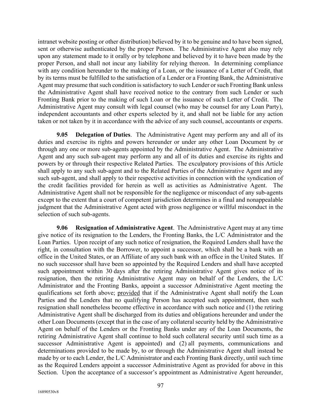 16890530v8 97 intranet website posting or other distribution) believed by it to be genuine and to have been signed, sent or otherwise authenticated by the proper Person. The Administrative Agent also may rely upon any statement made to it orally or by telephone and believed by it to have been made by the proper Person, and shall not incur any liability for relying thereon. In determining compliance with any condition hereunder to the making of a Loan, or the issuance of a Letter of Credit, that by its terms must be fulfilled to the satisfaction of a Lender or a Fronting Bank, the Administrative Agent may presume that such condition is satisfactory to such Lender or such Fronting Bank unless the Administrative Agent shall have received notice to the contrary from such Lender or such Fronting Bank prior to the making of such Loan or the issuance of such Letter of Credit. The Administrative Agent may consult with legal counsel (who may be counsel for any Loan Party), independent accountants and other experts selected by it, and shall not be liable for any action taken or not taken by it in accordance with the advice of any such counsel, accountants or experts. 9.05 Delegation of Duties. The Administrative Agent may perform any and all of its duties and exercise its rights and powers hereunder or under any other Loan Document by or through any one or more sub-agents appointed by the Administrative Agent. The Administrative Agent and any such sub-agent may perform any and all of its duties and exercise its rights and powers by or through their respective Related Parties. The exculpatory provisions of this Article shall apply to any such sub-agent and to the Related Parties of the Administrative Agent and any such sub-agent, and shall apply to their respective activities in connection with the syndication of the credit facilities provided for herein as well as activities as Administrative Agent. The Administrative Agent shall not be responsible for the negligence or misconduct of any sub-agents except to the extent that a court of competent jurisdiction determines in a final and nonappealable judgment that the Administrative Agent acted with gross negligence or willful misconduct in the selection of such sub-agents. 9.06 Resignation of Administrative Agent. The Administrative Agent may at any time give notice of its resignation to the Lenders, the Fronting Banks, the L/C Administrator and the Loan Parties. Upon receipt of any such notice of resignation, the Required Lenders shall have the right, in consultation with the Borrower, to appoint a successor, which shall be a bank with an office in the United States, or an Affiliate of any such bank with an office in the United States. If no such successor shall have been so appointed by the Required Lenders and shall have accepted such appointment within 30 days after the retiring Administrative Agent gives notice of its resignation, then the retiring Administrative Agent may on behalf of the Lenders, the L/C Administrator and the Fronting Banks, appoint a successor Administrative Agent meeting the qualifications set forth above; provided that if the Administrative Agent shall notify the Loan Parties and the Lenders that no qualifying Person has accepted such appointment, then such resignation shall nonetheless become effective in accordance with such notice and (1) the retiring Administrative Agent shall be discharged from its duties and obligations hereunder and under the other Loan Documents (except that in the case of any collateral security held by the Administrative Agent on behalf of the Lenders or the Fronting Banks under any of the Loan Documents, the retiring Administrative Agent shall continue to hold such collateral security until such time as a successor Administrative Agent is appointed) and (2) all payments, communications and determinations provided to be made by, to or through the Administrative Agent shall instead be made by or to each Lender, the L/C Administrator and each Fronting Bank directly, until such time as the Required Lenders appoint a successor Administrative Agent as provided for above in this Section. Upon the acceptance of a successor’s appointment as Administrative Agent hereunder,