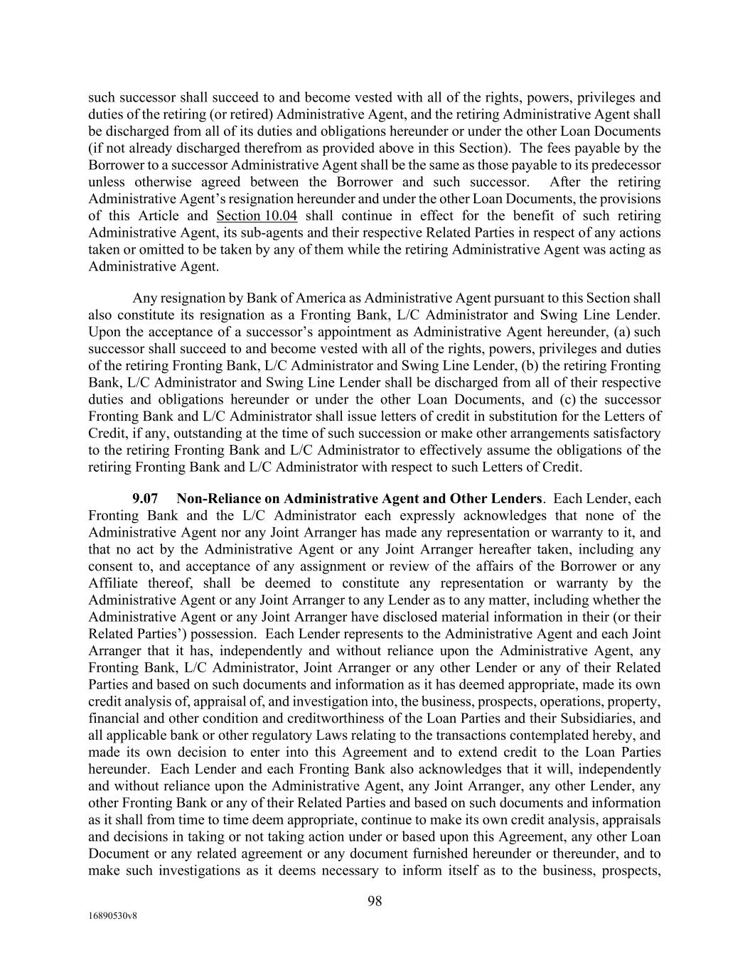 16890530v8 98 such successor shall succeed to and become vested with all of the rights, powers, privileges and duties of the retiring (or retired) Administrative Agent, and the retiring Administrative Agent shall be discharged from all of its duties and obligations hereunder or under the other Loan Documents (if not already discharged therefrom as provided above in this Section). The fees payable by the Borrower to a successor Administrative Agent shall be the same as those payable to its predecessor unless otherwise agreed between the Borrower and such successor. After the retiring Administrative Agent’s resignation hereunder and under the other Loan Documents, the provisions of this Article and Section 10.04 shall continue in effect for the benefit of such retiring Administrative Agent, its sub-agents and their respective Related Parties in respect of any actions taken or omitted to be taken by any of them while the retiring Administrative Agent was acting as Administrative Agent. Any resignation by Bank of America as Administrative Agent pursuant to this Section shall also constitute its resignation as a Fronting Bank, L/C Administrator and Swing Line Lender. Upon the acceptance of a successor’s appointment as Administrative Agent hereunder, (a) such successor shall succeed to and become vested with all of the rights, powers, privileges and duties of the retiring Fronting Bank, L/C Administrator and Swing Line Lender, (b) the retiring Fronting Bank, L/C Administrator and Swing Line Lender shall be discharged from all of their respective duties and obligations hereunder or under the other Loan Documents, and (c) the successor Fronting Bank and L/C Administrator shall issue letters of credit in substitution for the Letters of Credit, if any, outstanding at the time of such succession or make other arrangements satisfactory to the retiring Fronting Bank and L/C Administrator to effectively assume the obligations of the retiring Fronting Bank and L/C Administrator with respect to such Letters of Credit. 9.07 Non-Reliance on Administrative Agent and Other Lenders. Each Lender, each Fronting Bank and the L/C Administrator each expressly acknowledges that none of the Administrative Agent nor any Joint Arranger has made any representation or warranty to it, and that no act by the Administrative Agent or any Joint Arranger hereafter taken, including any consent to, and acceptance of any assignment or review of the affairs of the Borrower or any Affiliate thereof, shall be deemed to constitute any representation or warranty by the Administrative Agent or any Joint Arranger to any Lender as to any matter, including whether the Administrative Agent or any Joint Arranger have disclosed material information in their (or their Related Parties’) possession. Each Lender represents to the Administrative Agent and each Joint Arranger that it has, independently and without reliance upon the Administrative Agent, any Fronting Bank, L/C Administrator, Joint Arranger or any other Lender or any of their Related Parties and based on such documents and information as it has deemed appropriate, made its own credit analysis of, appraisal of, and investigation into, the business, prospects, operations, property, financial and other condition and creditworthiness of the Loan Parties and their Subsidiaries, and all applicable bank or other regulatory Laws relating to the transactions contemplated hereby, and made its own decision to enter into this Agreement and to extend credit to the Loan Parties hereunder. Each Lender and each Fronting Bank also acknowledges that it will, independently and without reliance upon the Administrative Agent, any Joint Arranger, any other Lender, any other Fronting Bank or any of their Related Parties and based on such documents and information as it shall from time to time deem appropriate, continue to make its own credit analysis, appraisals and decisions in taking or not taking action under or based upon this Agreement, any other Loan Document or any related agreement or any document furnished hereunder or thereunder, and to make such investigations as it deems necessary to inform itself as to the business, prospects,