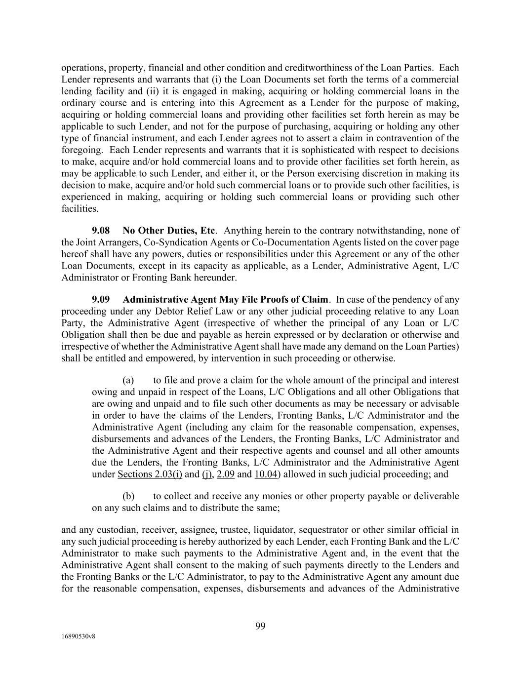 16890530v8 99 operations, property, financial and other condition and creditworthiness of the Loan Parties. Each Lender represents and warrants that (i) the Loan Documents set forth the terms of a commercial lending facility and (ii) it is engaged in making, acquiring or holding commercial loans in the ordinary course and is entering into this Agreement as a Lender for the purpose of making, acquiring or holding commercial loans and providing other facilities set forth herein as may be applicable to such Lender, and not for the purpose of purchasing, acquiring or holding any other type of financial instrument, and each Lender agrees not to assert a claim in contravention of the foregoing. Each Lender represents and warrants that it is sophisticated with respect to decisions to make, acquire and/or hold commercial loans and to provide other facilities set forth herein, as may be applicable to such Lender, and either it, or the Person exercising discretion in making its decision to make, acquire and/or hold such commercial loans or to provide such other facilities, is experienced in making, acquiring or holding such commercial loans or providing such other facilities. 9.08 No Other Duties, Etc. Anything herein to the contrary notwithstanding, none of the Joint Arrangers, Co-Syndication Agents or Co-Documentation Agents listed on the cover page hereof shall have any powers, duties or responsibilities under this Agreement or any of the other Loan Documents, except in its capacity as applicable, as a Lender, Administrative Agent, L/C Administrator or Fronting Bank hereunder. 9.09 Administrative Agent May File Proofs of Claim. In case of the pendency of any proceeding under any Debtor Relief Law or any other judicial proceeding relative to any Loan Party, the Administrative Agent (irrespective of whether the principal of any Loan or L/C Obligation shall then be due and payable as herein expressed or by declaration or otherwise and irrespective of whether the Administrative Agent shall have made any demand on the Loan Parties) shall be entitled and empowered, by intervention in such proceeding or otherwise. (a) to file and prove a claim for the whole amount of the principal and interest owing and unpaid in respect of the Loans, L/C Obligations and all other Obligations that are owing and unpaid and to file such other documents as may be necessary or advisable in order to have the claims of the Lenders, Fronting Banks, L/C Administrator and the Administrative Agent (including any claim for the reasonable compensation, expenses, disbursements and advances of the Lenders, the Fronting Banks, L/C Administrator and the Administrative Agent and their respective agents and counsel and all other amounts due the Lenders, the Fronting Banks, L/C Administrator and the Administrative Agent under Sections 2.03(i) and (j), 2.09 and 10.04) allowed in such judicial proceeding; and (b) to collect and receive any monies or other property payable or deliverable on any such claims and to distribute the same; and any custodian, receiver, assignee, trustee, liquidator, sequestrator or other similar official in any such judicial proceeding is hereby authorized by each Lender, each Fronting Bank and the L/C Administrator to make such payments to the Administrative Agent and, in the event that the Administrative Agent shall consent to the making of such payments directly to the Lenders and the Fronting Banks or the L/C Administrator, to pay to the Administrative Agent any amount due for the reasonable compensation, expenses, disbursements and advances of the Administrative