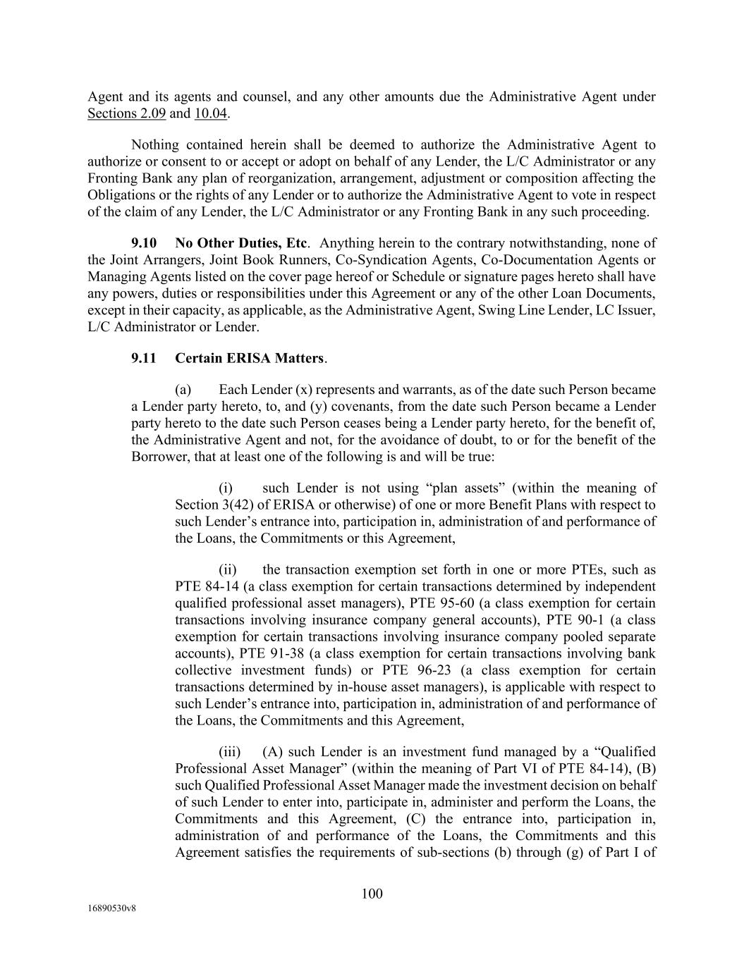16890530v8 100 Agent and its agents and counsel, and any other amounts due the Administrative Agent under Sections 2.09 and 10.04. Nothing contained herein shall be deemed to authorize the Administrative Agent to authorize or consent to or accept or adopt on behalf of any Lender, the L/C Administrator or any Fronting Bank any plan of reorganization, arrangement, adjustment or composition affecting the Obligations or the rights of any Lender or to authorize the Administrative Agent to vote in respect of the claim of any Lender, the L/C Administrator or any Fronting Bank in any such proceeding. 9.10 No Other Duties, Etc. Anything herein to the contrary notwithstanding, none of the Joint Arrangers, Joint Book Runners, Co-Syndication Agents, Co-Documentation Agents or Managing Agents listed on the cover page hereof or Schedule or signature pages hereto shall have any powers, duties or responsibilities under this Agreement or any of the other Loan Documents, except in their capacity, as applicable, as the Administrative Agent, Swing Line Lender, LC Issuer, L/C Administrator or Lender. 9.11 Certain ERISA Matters. (a) Each Lender (x) represents and warrants, as of the date such Person became a Lender party hereto, to, and (y) covenants, from the date such Person became a Lender party hereto to the date such Person ceases being a Lender party hereto, for the benefit of, the Administrative Agent and not, for the avoidance of doubt, to or for the benefit of the Borrower, that at least one of the following is and will be true: (i) such Lender is not using “plan assets” (within the meaning of Section 3(42) of ERISA or otherwise) of one or more Benefit Plans with respect to such Lender’s entrance into, participation in, administration of and performance of the Loans, the Commitments or this Agreement, (ii) the transaction exemption set forth in one or more PTEs, such as PTE 84-14 (a class exemption for certain transactions determined by independent qualified professional asset managers), PTE 95-60 (a class exemption for certain transactions involving insurance company general accounts), PTE 90-1 (a class exemption for certain transactions involving insurance company pooled separate accounts), PTE 91-38 (a class exemption for certain transactions involving bank collective investment funds) or PTE 96-23 (a class exemption for certain transactions determined by in-house asset managers), is applicable with respect to such Lender’s entrance into, participation in, administration of and performance of the Loans, the Commitments and this Agreement, (iii) (A) such Lender is an investment fund managed by a “Qualified Professional Asset Manager” (within the meaning of Part VI of PTE 84-14), (B) such Qualified Professional Asset Manager made the investment decision on behalf of such Lender to enter into, participate in, administer and perform the Loans, the Commitments and this Agreement, (C) the entrance into, participation in, administration of and performance of the Loans, the Commitments and this Agreement satisfies the requirements of sub-sections (b) through (g) of Part I of