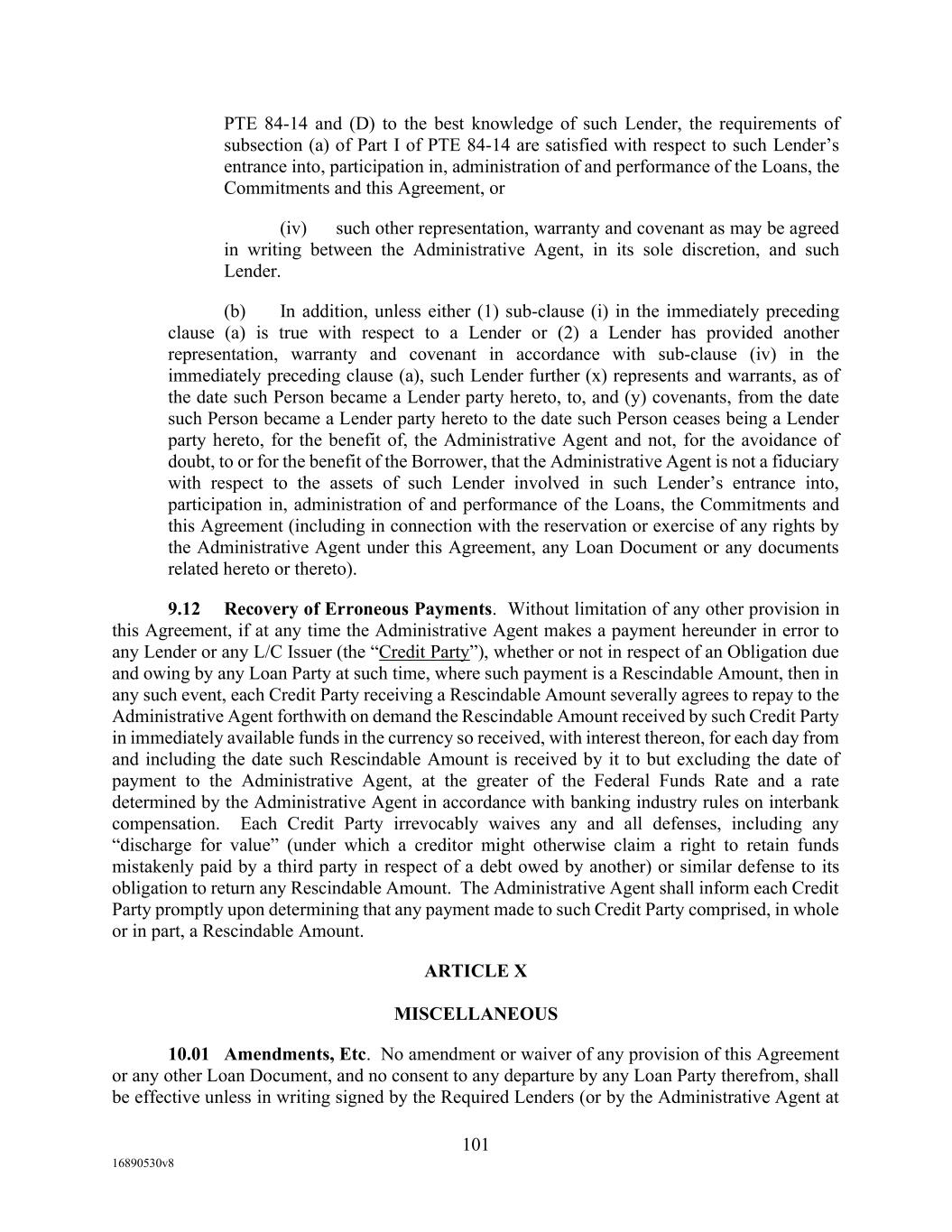 16890530v8 101 PTE 84-14 and (D) to the best knowledge of such Lender, the requirements of subsection (a) of Part I of PTE 84-14 are satisfied with respect to such Lender’s entrance into, participation in, administration of and performance of the Loans, the Commitments and this Agreement, or (iv) such other representation, warranty and covenant as may be agreed in writing between the Administrative Agent, in its sole discretion, and such Lender. (b) In addition, unless either (1) sub-clause (i) in the immediately preceding clause (a) is true with respect to a Lender or (2) a Lender has provided another representation, warranty and covenant in accordance with sub-clause (iv) in the immediately preceding clause (a), such Lender further (x) represents and warrants, as of the date such Person became a Lender party hereto, to, and (y) covenants, from the date such Person became a Lender party hereto to the date such Person ceases being a Lender party hereto, for the benefit of, the Administrative Agent and not, for the avoidance of doubt, to or for the benefit of the Borrower, that the Administrative Agent is not a fiduciary with respect to the assets of such Lender involved in such Lender’s entrance into, participation in, administration of and performance of the Loans, the Commitments and this Agreement (including in connection with the reservation or exercise of any rights by the Administrative Agent under this Agreement, any Loan Document or any documents related hereto or thereto). 9.12 Recovery of Erroneous Payments. Without limitation of any other provision in this Agreement, if at any time the Administrative Agent makes a payment hereunder in error to any Lender or any L/C Issuer (the “Credit Party”), whether or not in respect of an Obligation due and owing by any Loan Party at such time, where such payment is a Rescindable Amount, then in any such event, each Credit Party receiving a Rescindable Amount severally agrees to repay to the Administrative Agent forthwith on demand the Rescindable Amount received by such Credit Party in immediately available funds in the currency so received, with interest thereon, for each day from and including the date such Rescindable Amount is received by it to but excluding the date of payment to the Administrative Agent, at the greater of the Federal Funds Rate and a rate determined by the Administrative Agent in accordance with banking industry rules on interbank compensation. Each Credit Party irrevocably waives any and all defenses, including any “discharge for value” (under which a creditor might otherwise claim a right to retain funds mistakenly paid by a third party in respect of a debt owed by another) or similar defense to its obligation to return any Rescindable Amount. The Administrative Agent shall inform each Credit Party promptly upon determining that any payment made to such Credit Party comprised, in whole or in part, a Rescindable Amount. ARTICLE X MISCELLANEOUS 10.01 Amendments, Etc. No amendment or waiver of any provision of this Agreement or any other Loan Document, and no consent to any departure by any Loan Party therefrom, shall be effective unless in writing signed by the Required Lenders (or by the Administrative Agent at