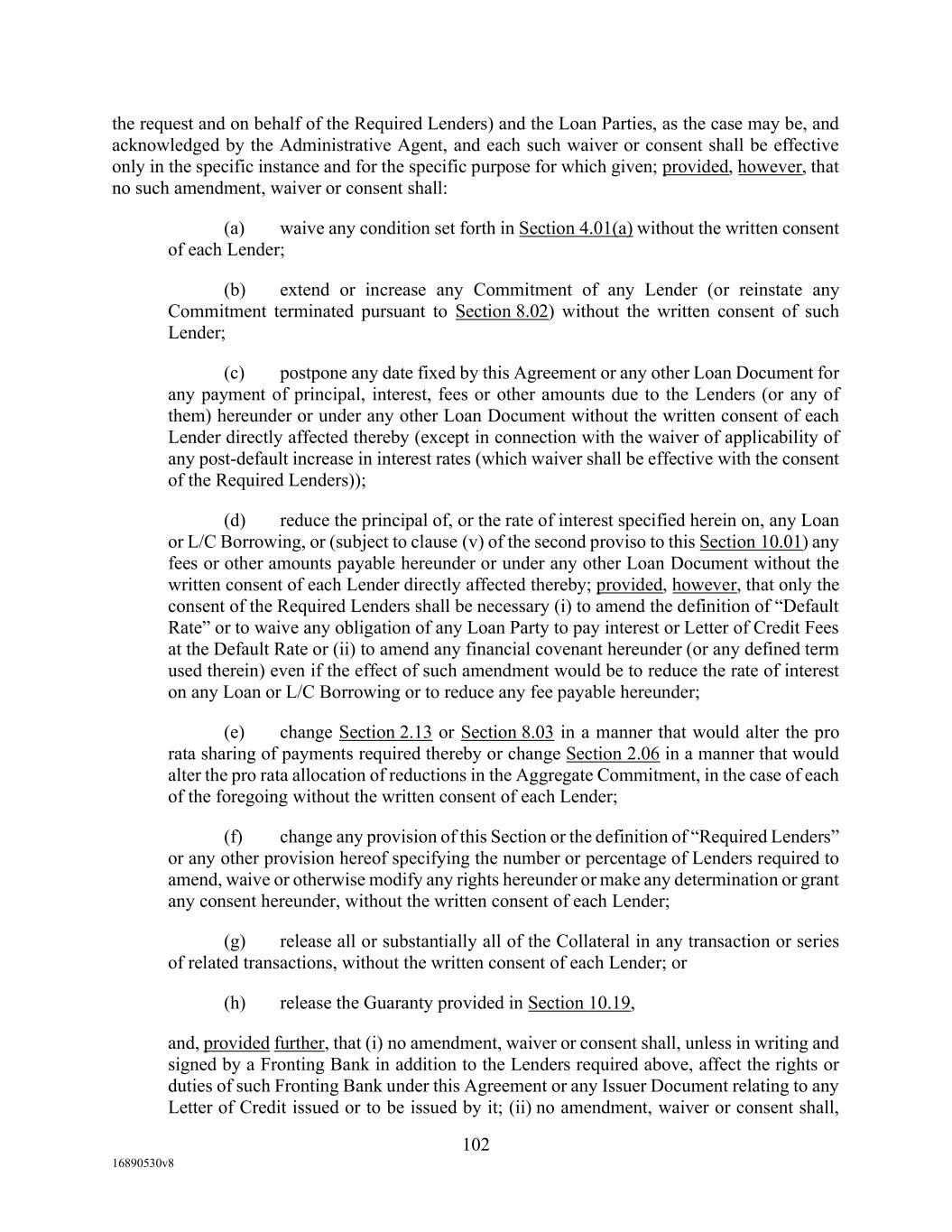 16890530v8 102 the request and on behalf of the Required Lenders) and the Loan Parties, as the case may be, and acknowledged by the Administrative Agent, and each such waiver or consent shall be effective only in the specific instance and for the specific purpose for which given; provided, however, that no such amendment, waiver or consent shall: (a) waive any condition set forth in Section 4.01(a) without the written consent of each Lender; (b) extend or increase any Commitment of any Lender (or reinstate any Commitment terminated pursuant to Section 8.02) without the written consent of such Lender; (c) postpone any date fixed by this Agreement or any other Loan Document for any payment of principal, interest, fees or other amounts due to the Lenders (or any of them) hereunder or under any other Loan Document without the written consent of each Lender directly affected thereby (except in connection with the waiver of applicability of any post-default increase in interest rates (which waiver shall be effective with the consent of the Required Lenders)); (d) reduce the principal of, or the rate of interest specified herein on, any Loan or L/C Borrowing, or (subject to clause (v) of the second proviso to this Section 10.01) any fees or other amounts payable hereunder or under any other Loan Document without the written consent of each Lender directly affected thereby; provided, however, that only the consent of the Required Lenders shall be necessary (i) to amend the definition of “Default Rate” or to waive any obligation of any Loan Party to pay interest or Letter of Credit Fees at the Default Rate or (ii) to amend any financial covenant hereunder (or any defined term used therein) even if the effect of such amendment would be to reduce the rate of interest on any Loan or L/C Borrowing or to reduce any fee payable hereunder; (e) change Section 2.13 or Section 8.03 in a manner that would alter the pro rata sharing of payments required thereby or change Section 2.06 in a manner that would alter the pro rata allocation of reductions in the Aggregate Commitment, in the case of each of the foregoing without the written consent of each Lender; (f) change any provision of this Section or the definition of “Required Lenders” or any other provision hereof specifying the number or percentage of Lenders required to amend, waive or otherwise modify any rights hereunder or make any determination or grant any consent hereunder, without the written consent of each Lender; (g) release all or substantially all of the Collateral in any transaction or series of related transactions, without the written consent of each Lender; or (h) release the Guaranty provided in Section 10.19, and, provided further, that (i) no amendment, waiver or consent shall, unless in writing and signed by a Fronting Bank in addition to the Lenders required above, affect the rights or duties of such Fronting Bank under this Agreement or any Issuer Document relating to any Letter of Credit issued or to be issued by it; (ii) no amendment, waiver or consent shall,