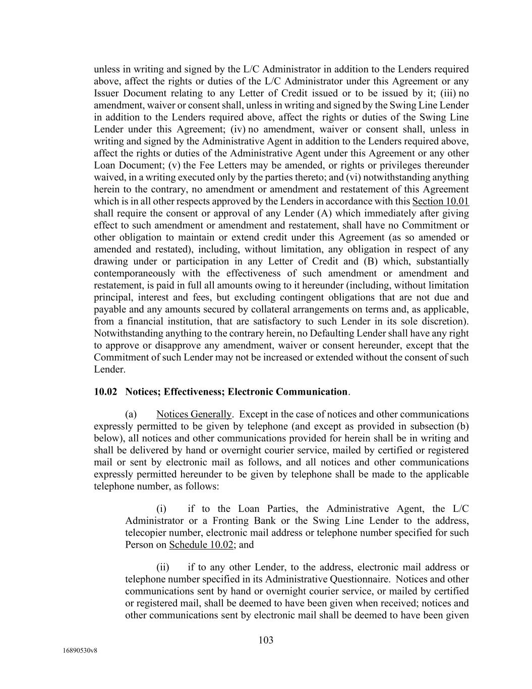 16890530v8 103 unless in writing and signed by the L/C Administrator in addition to the Lenders required above, affect the rights or duties of the L/C Administrator under this Agreement or any Issuer Document relating to any Letter of Credit issued or to be issued by it; (iii) no amendment, waiver or consent shall, unless in writing and signed by the Swing Line Lender in addition to the Lenders required above, affect the rights or duties of the Swing Line Lender under this Agreement; (iv) no amendment, waiver or consent shall, unless in writing and signed by the Administrative Agent in addition to the Lenders required above, affect the rights or duties of the Administrative Agent under this Agreement or any other Loan Document; (v) the Fee Letters may be amended, or rights or privileges thereunder waived, in a writing executed only by the parties thereto; and (vi) notwithstanding anything herein to the contrary, no amendment or amendment and restatement of this Agreement which is in all other respects approved by the Lenders in accordance with this Section 10.01 shall require the consent or approval of any Lender (A) which immediately after giving effect to such amendment or amendment and restatement, shall have no Commitment or other obligation to maintain or extend credit under this Agreement (as so amended or amended and restated), including, without limitation, any obligation in respect of any drawing under or participation in any Letter of Credit and (B) which, substantially contemporaneously with the effectiveness of such amendment or amendment and restatement, is paid in full all amounts owing to it hereunder (including, without limitation principal, interest and fees, but excluding contingent obligations that are not due and payable and any amounts secured by collateral arrangements on terms and, as applicable, from a financial institution, that are satisfactory to such Lender in its sole discretion). Notwithstanding anything to the contrary herein, no Defaulting Lender shall have any right to approve or disapprove any amendment, waiver or consent hereunder, except that the Commitment of such Lender may not be increased or extended without the consent of such Lender. 10.02 Notices; Effectiveness; Electronic Communication. (a) Notices Generally. Except in the case of notices and other communications expressly permitted to be given by telephone (and except as provided in subsection (b) below), all notices and other communications provided for herein shall be in writing and shall be delivered by hand or overnight courier service, mailed by certified or registered mail or sent by electronic mail as follows, and all notices and other communications expressly permitted hereunder to be given by telephone shall be made to the applicable telephone number, as follows: (i) if to the Loan Parties, the Administrative Agent, the L/C Administrator or a Fronting Bank or the Swing Line Lender to the address, telecopier number, electronic mail address or telephone number specified for such Person on Schedule 10.02; and (ii) if to any other Lender, to the address, electronic mail address or telephone number specified in its Administrative Questionnaire. Notices and other communications sent by hand or overnight courier service, or mailed by certified or registered mail, shall be deemed to have been given when received; notices and other communications sent by electronic mail shall be deemed to have been given