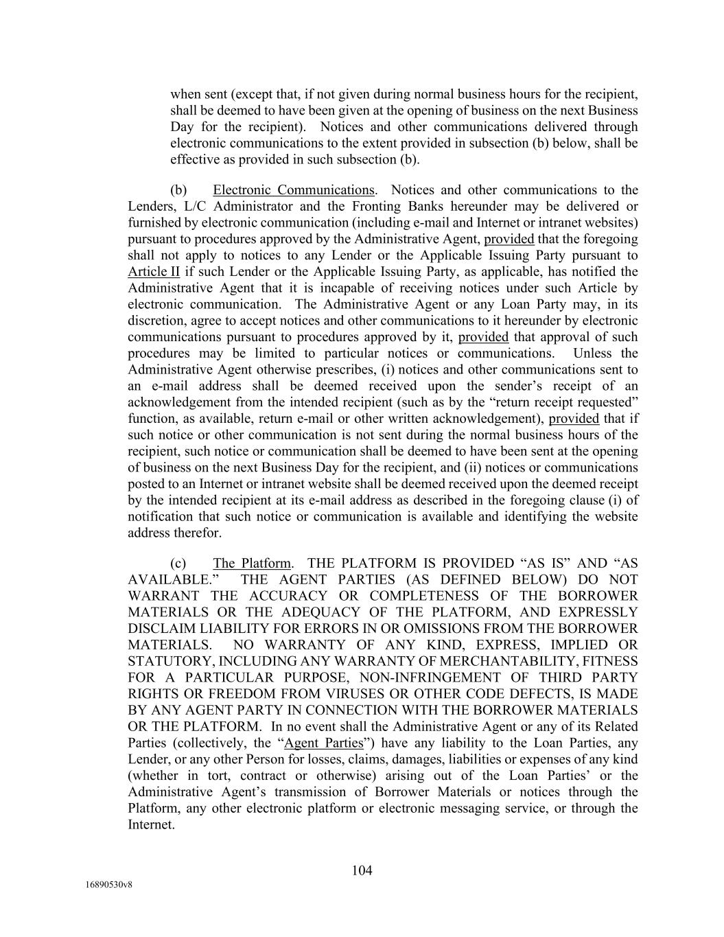 16890530v8 104 when sent (except that, if not given during normal business hours for the recipient, shall be deemed to have been given at the opening of business on the next Business Day for the recipient). Notices and other communications delivered through electronic communications to the extent provided in subsection (b) below, shall be effective as provided in such subsection (b). (b) Electronic Communications. Notices and other communications to the Lenders, L/C Administrator and the Fronting Banks hereunder may be delivered or furnished by electronic communication (including e-mail and Internet or intranet websites) pursuant to procedures approved by the Administrative Agent, provided that the foregoing shall not apply to notices to any Lender or the Applicable Issuing Party pursuant to Article II if such Lender or the Applicable Issuing Party, as applicable, has notified the Administrative Agent that it is incapable of receiving notices under such Article by electronic communication. The Administrative Agent or any Loan Party may, in its discretion, agree to accept notices and other communications to it hereunder by electronic communications pursuant to procedures approved by it, provided that approval of such procedures may be limited to particular notices or communications. Unless the Administrative Agent otherwise prescribes, (i) notices and other communications sent to an e-mail address shall be deemed received upon the sender’s receipt of an acknowledgement from the intended recipient (such as by the “return receipt requested” function, as available, return e-mail or other written acknowledgement), provided that if such notice or other communication is not sent during the normal business hours of the recipient, such notice or communication shall be deemed to have been sent at the opening of business on the next Business Day for the recipient, and (ii) notices or communications posted to an Internet or intranet website shall be deemed received upon the deemed receipt by the intended recipient at its e-mail address as described in the foregoing clause (i) of notification that such notice or communication is available and identifying the website address therefor. (c) The Platform. THE PLATFORM IS PROVIDED “AS IS” AND “AS AVAILABLE.” THE AGENT PARTIES (AS DEFINED BELOW) DO NOT WARRANT THE ACCURACY OR COMPLETENESS OF THE BORROWER MATERIALS OR THE ADEQUACY OF THE PLATFORM, AND EXPRESSLY DISCLAIM LIABILITY FOR ERRORS IN OR OMISSIONS FROM THE BORROWER MATERIALS. NO WARRANTY OF ANY KIND, EXPRESS, IMPLIED OR STATUTORY, INCLUDING ANY WARRANTY OF MERCHANTABILITY, FITNESS FOR A PARTICULAR PURPOSE, NON-INFRINGEMENT OF THIRD PARTY RIGHTS OR FREEDOM FROM VIRUSES OR OTHER CODE DEFECTS, IS MADE BY ANY AGENT PARTY IN CONNECTION WITH THE BORROWER MATERIALS OR THE PLATFORM. In no event shall the Administrative Agent or any of its Related Parties (collectively, the “Agent Parties”) have any liability to the Loan Parties, any Lender, or any other Person for losses, claims, damages, liabilities or expenses of any kind (whether in tort, contract or otherwise) arising out of the Loan Parties’ or the Administrative Agent’s transmission of Borrower Materials or notices through the Platform, any other electronic platform or electronic messaging service, or through the Internet.