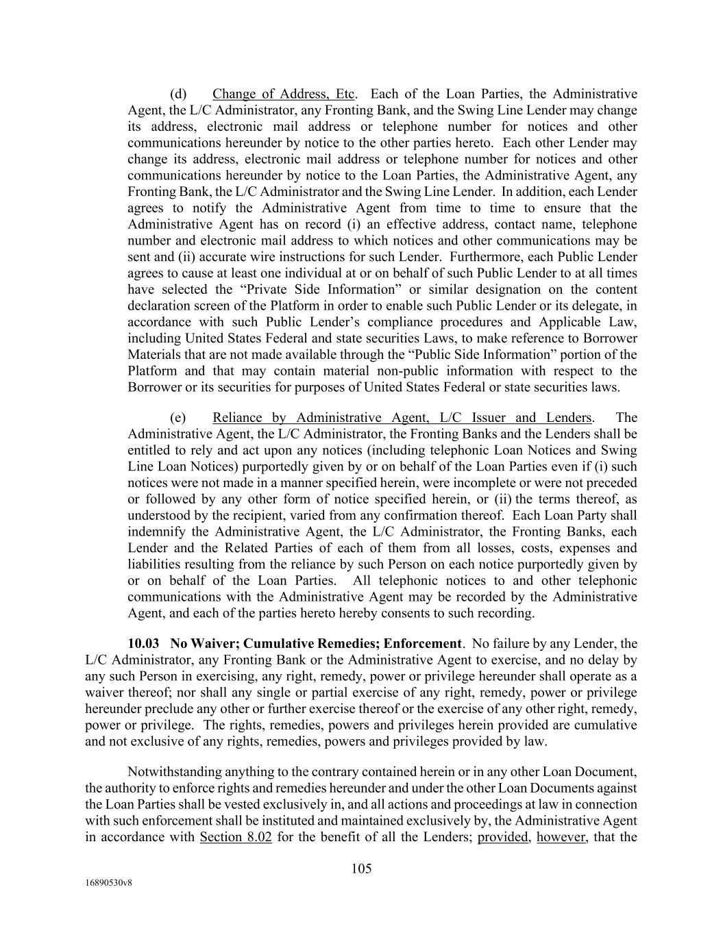 16890530v8 105 (d) Change of Address, Etc. Each of the Loan Parties, the Administrative Agent, the L/C Administrator, any Fronting Bank, and the Swing Line Lender may change its address, electronic mail address or telephone number for notices and other communications hereunder by notice to the other parties hereto. Each other Lender may change its address, electronic mail address or telephone number for notices and other communications hereunder by notice to the Loan Parties, the Administrative Agent, any Fronting Bank, the L/C Administrator and the Swing Line Lender. In addition, each Lender agrees to notify the Administrative Agent from time to time to ensure that the Administrative Agent has on record (i) an effective address, contact name, telephone number and electronic mail address to which notices and other communications may be sent and (ii) accurate wire instructions for such Lender. Furthermore, each Public Lender agrees to cause at least one individual at or on behalf of such Public Lender to at all times have selected the “Private Side Information” or similar designation on the content declaration screen of the Platform in order to enable such Public Lender or its delegate, in accordance with such Public Lender’s compliance procedures and Applicable Law, including United States Federal and state securities Laws, to make reference to Borrower Materials that are not made available through the “Public Side Information” portion of the Platform and that may contain material non-public information with respect to the Borrower or its securities for purposes of United States Federal or state securities laws. (e) Reliance by Administrative Agent, L/C Issuer and Lenders. The Administrative Agent, the L/C Administrator, the Fronting Banks and the Lenders shall be entitled to rely and act upon any notices (including telephonic Loan Notices and Swing Line Loan Notices) purportedly given by or on behalf of the Loan Parties even if (i) such notices were not made in a manner specified herein, were incomplete or were not preceded or followed by any other form of notice specified herein, or (ii) the terms thereof, as understood by the recipient, varied from any confirmation thereof. Each Loan Party shall indemnify the Administrative Agent, the L/C Administrator, the Fronting Banks, each Lender and the Related Parties of each of them from all losses, costs, expenses and liabilities resulting from the reliance by such Person on each notice purportedly given by or on behalf of the Loan Parties. All telephonic notices to and other telephonic communications with the Administrative Agent may be recorded by the Administrative Agent, and each of the parties hereto hereby consents to such recording. 10.03 No Waiver; Cumulative Remedies; Enforcement. No failure by any Lender, the L/C Administrator, any Fronting Bank or the Administrative Agent to exercise, and no delay by any such Person in exercising, any right, remedy, power or privilege hereunder shall operate as a waiver thereof; nor shall any single or partial exercise of any right, remedy, power or privilege hereunder preclude any other or further exercise thereof or the exercise of any other right, remedy, power or privilege. The rights, remedies, powers and privileges herein provided are cumulative and not exclusive of any rights, remedies, powers and privileges provided by law. Notwithstanding anything to the contrary contained herein or in any other Loan Document, the authority to enforce rights and remedies hereunder and under the other Loan Documents against the Loan Parties shall be vested exclusively in, and all actions and proceedings at law in connection with such enforcement shall be instituted and maintained exclusively by, the Administrative Agent in accordance with Section 8.02 for the benefit of all the Lenders; provided, however, that the