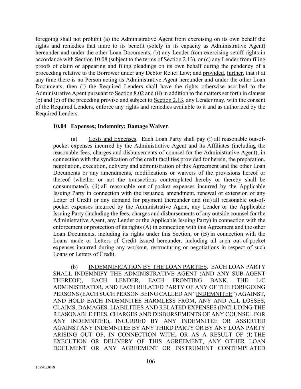 16890530v8 106 foregoing shall not prohibit (a) the Administrative Agent from exercising on its own behalf the rights and remedies that inure to its benefit (solely in its capacity as Administrative Agent) hereunder and under the other Loan Documents, (b) any Lender from exercising setoff rights in accordance with Section 10.08 (subject to the terms of Section 2.13), or (c) any Lender from filing proofs of claim or appearing and filing pleadings on its own behalf during the pendency of a proceeding relative to the Borrower under any Debtor Relief Law; and provided, further, that if at any time there is no Person acting as Administrative Agent hereunder and under the other Loan Documents, then (i) the Required Lenders shall have the rights otherwise ascribed to the Administrative Agent pursuant to Section 8.02 and (ii) in addition to the matters set forth in clauses (b) and (c) of the preceding proviso and subject to Section 2.13, any Lender may, with the consent of the Required Lenders, enforce any rights and remedies available to it and as authorized by the Required Lenders. 10.04 Expenses; Indemnity; Damage Waiver. (a) Costs and Expenses. Each Loan Party shall pay (i) all reasonable out-of- pocket expenses incurred by the Administrative Agent and its Affiliates (including the reasonable fees, charges and disbursements of counsel for the Administrative Agent), in connection with the syndication of the credit facilities provided for herein, the preparation, negotiation, execution, delivery and administration of this Agreement and the other Loan Documents or any amendments, modifications or waivers of the provisions hereof or thereof (whether or not the transactions contemplated hereby or thereby shall be consummated), (ii) all reasonable out-of-pocket expenses incurred by the Applicable Issuing Party in connection with the issuance, amendment, renewal or extension of any Letter of Credit or any demand for payment thereunder and (iii) all reasonable out-of- pocket expenses incurred by the Administrative Agent, any Lender or the Applicable Issuing Party (including the fees, charges and disbursements of any outside counsel for the Administrative Agent, any Lender or the Applicable Issuing Party) in connection with the enforcement or protection of its rights (A) in connection with this Agreement and the other Loan Documents, including its rights under this Section, or (B) in connection with the Loans made or Letters of Credit issued hereunder, including all such out-of-pocket expenses incurred during any workout, restructuring or negotiations in respect of such Loans or Letters of Credit. (b) INDEMNIFICATION BY THE LOAN PARTIES. EACH LOAN PARTY SHALL INDEMNIFY THE ADMINISTRATIVE AGENT (AND ANY SUB-AGENT THEREOF), EACH LENDER, EACH FRONTING BANK, THE L/C ADMINISTRATOR, AND EACH RELATED PARTY OF ANY OF THE FOREGOING PERSONS (EACH SUCH PERSON BEING CALLED AN “INDEMNITEE”) AGAINST, AND HOLD EACH INDEMNITEE HARMLESS FROM, ANY AND ALL LOSSES, CLAIMS, DAMAGES, LIABILITIES AND RELATED EXPENSES (INCLUDING THE REASONABLE FEES, CHARGES AND DISBURSEMENTS OF ANY COUNSEL FOR ANY INDEMNITEE), INCURRED BY ANY INDEMNITEE OR ASSERTED AGAINST ANY INDEMNITEE BY ANY THIRD PARTY OR BY ANY LOAN PARTY ARISING OUT OF, IN CONNECTION WITH, OR AS A RESULT OF (I) THE EXECUTION OR DELIVERY OF THIS AGREEMENT, ANY OTHER LOAN DOCUMENT OR ANY AGREEMENT OR INSTRUMENT CONTEMPLATED