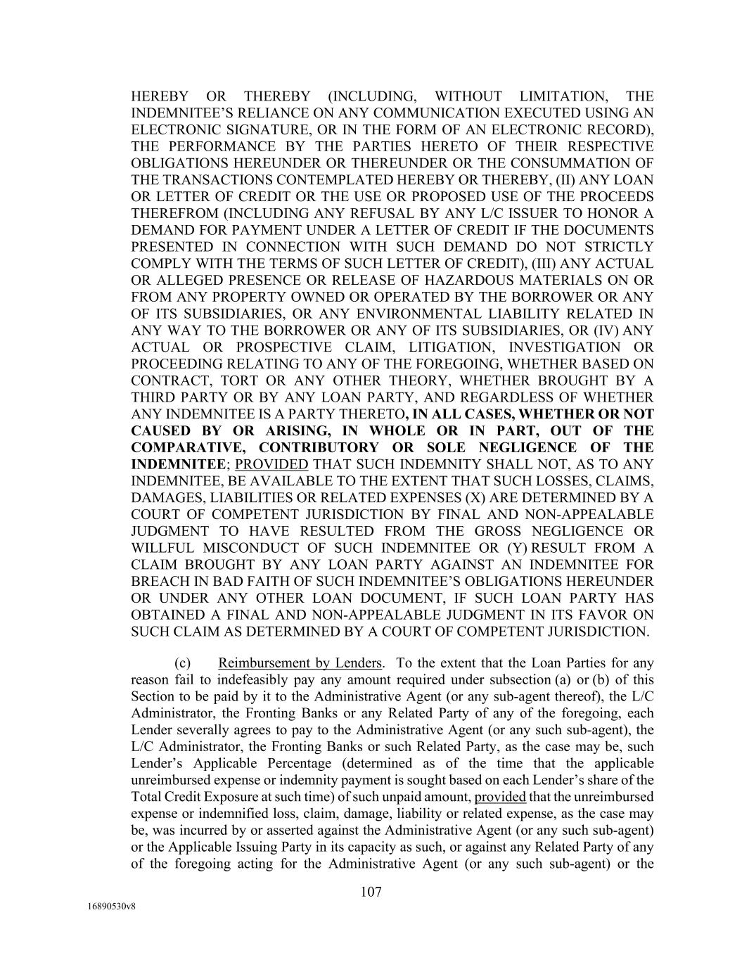 16890530v8 107 HEREBY OR THEREBY (INCLUDING, WITHOUT LIMITATION, THE INDEMNITEE’S RELIANCE ON ANY COMMUNICATION EXECUTED USING AN ELECTRONIC SIGNATURE, OR IN THE FORM OF AN ELECTRONIC RECORD), THE PERFORMANCE BY THE PARTIES HERETO OF THEIR RESPECTIVE OBLIGATIONS HEREUNDER OR THEREUNDER OR THE CONSUMMATION OF THE TRANSACTIONS CONTEMPLATED HEREBY OR THEREBY, (II) ANY LOAN OR LETTER OF CREDIT OR THE USE OR PROPOSED USE OF THE PROCEEDS THEREFROM (INCLUDING ANY REFUSAL BY ANY L/C ISSUER TO HONOR A DEMAND FOR PAYMENT UNDER A LETTER OF CREDIT IF THE DOCUMENTS PRESENTED IN CONNECTION WITH SUCH DEMAND DO NOT STRICTLY COMPLY WITH THE TERMS OF SUCH LETTER OF CREDIT), (III) ANY ACTUAL OR ALLEGED PRESENCE OR RELEASE OF HAZARDOUS MATERIALS ON OR FROM ANY PROPERTY OWNED OR OPERATED BY THE BORROWER OR ANY OF ITS SUBSIDIARIES, OR ANY ENVIRONMENTAL LIABILITY RELATED IN ANY WAY TO THE BORROWER OR ANY OF ITS SUBSIDIARIES, OR (IV) ANY ACTUAL OR PROSPECTIVE CLAIM, LITIGATION, INVESTIGATION OR PROCEEDING RELATING TO ANY OF THE FOREGOING, WHETHER BASED ON CONTRACT, TORT OR ANY OTHER THEORY, WHETHER BROUGHT BY A THIRD PARTY OR BY ANY LOAN PARTY, AND REGARDLESS OF WHETHER ANY INDEMNITEE IS A PARTY THERETO, IN ALL CASES, WHETHER OR NOT CAUSED BY OR ARISING, IN WHOLE OR IN PART, OUT OF THE COMPARATIVE, CONTRIBUTORY OR SOLE NEGLIGENCE OF THE INDEMNITEE; PROVIDED THAT SUCH INDEMNITY SHALL NOT, AS TO ANY INDEMNITEE, BE AVAILABLE TO THE EXTENT THAT SUCH LOSSES, CLAIMS, DAMAGES, LIABILITIES OR RELATED EXPENSES (X) ARE DETERMINED BY A COURT OF COMPETENT JURISDICTION BY FINAL AND NON-APPEALABLE JUDGMENT TO HAVE RESULTED FROM THE GROSS NEGLIGENCE OR WILLFUL MISCONDUCT OF SUCH INDEMNITEE OR (Y) RESULT FROM A CLAIM BROUGHT BY ANY LOAN PARTY AGAINST AN INDEMNITEE FOR BREACH IN BAD FAITH OF SUCH INDEMNITEE’S OBLIGATIONS HEREUNDER OR UNDER ANY OTHER LOAN DOCUMENT, IF SUCH LOAN PARTY HAS OBTAINED A FINAL AND NON-APPEALABLE JUDGMENT IN ITS FAVOR ON SUCH CLAIM AS DETERMINED BY A COURT OF COMPETENT JURISDICTION. (c) Reimbursement by Lenders. To the extent that the Loan Parties for any reason fail to indefeasibly pay any amount required under subsection (a) or (b) of this Section to be paid by it to the Administrative Agent (or any sub-agent thereof), the L/C Administrator, the Fronting Banks or any Related Party of any of the foregoing, each Lender severally agrees to pay to the Administrative Agent (or any such sub-agent), the L/C Administrator, the Fronting Banks or such Related Party, as the case may be, such Lender’s Applicable Percentage (determined as of the time that the applicable unreimbursed expense or indemnity payment is sought based on each Lender’s share of the Total Credit Exposure at such time) of such unpaid amount, provided that the unreimbursed expense or indemnified loss, claim, damage, liability or related expense, as the case may be, was incurred by or asserted against the Administrative Agent (or any such sub-agent) or the Applicable Issuing Party in its capacity as such, or against any Related Party of any of the foregoing acting for the Administrative Agent (or any such sub-agent) or the