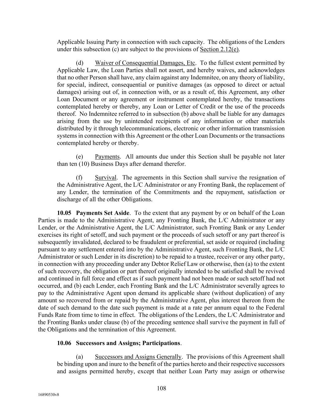 16890530v8 108 Applicable Issuing Party in connection with such capacity. The obligations of the Lenders under this subsection (c) are subject to the provisions of Section 2.12(e). (d) Waiver of Consequential Damages, Etc. To the fullest extent permitted by Applicable Law, the Loan Parties shall not assert, and hereby waives, and acknowledges that no other Person shall have, any claim against any Indemnitee, on any theory of liability, for special, indirect, consequential or punitive damages (as opposed to direct or actual damages) arising out of, in connection with, or as a result of, this Agreement, any other Loan Document or any agreement or instrument contemplated hereby, the transactions contemplated hereby or thereby, any Loan or Letter of Credit or the use of the proceeds thereof. No Indemnitee referred to in subsection (b) above shall be liable for any damages arising from the use by unintended recipients of any information or other materials distributed by it through telecommunications, electronic or other information transmission systems in connection with this Agreement or the other Loan Documents or the transactions contemplated hereby or thereby. (e) Payments. All amounts due under this Section shall be payable not later than ten (10) Business Days after demand therefor. (f) Survival. The agreements in this Section shall survive the resignation of the Administrative Agent, the L/C Administrator or any Fronting Bank, the replacement of any Lender, the termination of the Commitments and the repayment, satisfaction or discharge of all the other Obligations. 10.05 Payments Set Aside. To the extent that any payment by or on behalf of the Loan Parties is made to the Administrative Agent, any Fronting Bank, the L/C Administrator or any Lender, or the Administrative Agent, the L/C Administrator, such Fronting Bank or any Lender exercises its right of setoff, and such payment or the proceeds of such setoff or any part thereof is subsequently invalidated, declared to be fraudulent or preferential, set aside or required (including pursuant to any settlement entered into by the Administrative Agent, such Fronting Bank, the L/C Administrator or such Lender in its discretion) to be repaid to a trustee, receiver or any other party, in connection with any proceeding under any Debtor Relief Law or otherwise, then (a) to the extent of such recovery, the obligation or part thereof originally intended to be satisfied shall be revived and continued in full force and effect as if such payment had not been made or such setoff had not occurred, and (b) each Lender, each Fronting Bank and the L/C Administrator severally agrees to pay to the Administrative Agent upon demand its applicable share (without duplication) of any amount so recovered from or repaid by the Administrative Agent, plus interest thereon from the date of such demand to the date such payment is made at a rate per annum equal to the Federal Funds Rate from time to time in effect. The obligations of the Lenders, the L/C Administrator and the Fronting Banks under clause (b) of the preceding sentence shall survive the payment in full of the Obligations and the termination of this Agreement. 10.06 Successors and Assigns; Participations. (a) Successors and Assigns Generally. The provisions of this Agreement shall be binding upon and inure to the benefit of the parties hereto and their respective successors and assigns permitted hereby, except that neither Loan Party may assign or otherwise