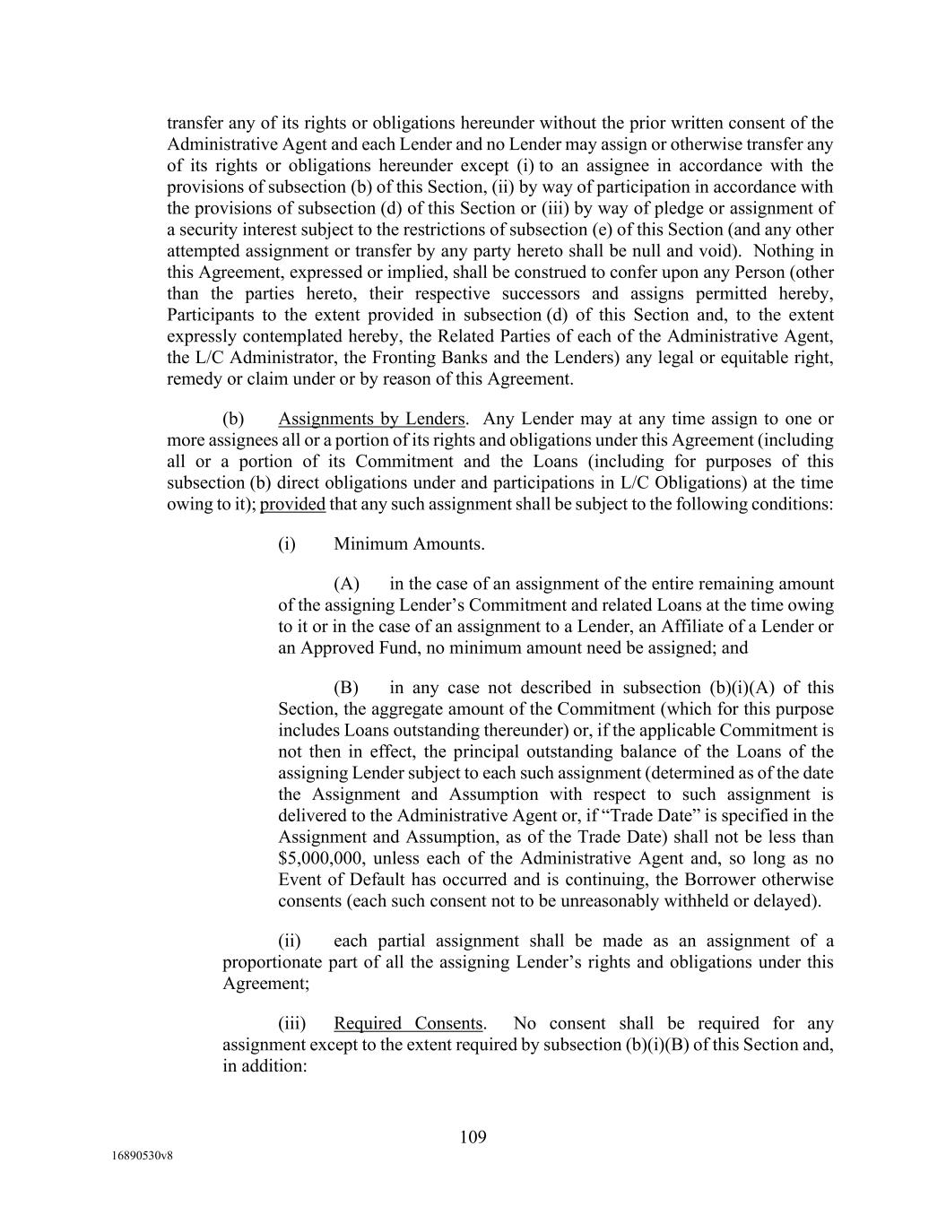 16890530v8 109 transfer any of its rights or obligations hereunder without the prior written consent of the Administrative Agent and each Lender and no Lender may assign or otherwise transfer any of its rights or obligations hereunder except (i) to an assignee in accordance with the provisions of subsection (b) of this Section, (ii) by way of participation in accordance with the provisions of subsection (d) of this Section or (iii) by way of pledge or assignment of a security interest subject to the restrictions of subsection (e) of this Section (and any other attempted assignment or transfer by any party hereto shall be null and void). Nothing in this Agreement, expressed or implied, shall be construed to confer upon any Person (other than the parties hereto, their respective successors and assigns permitted hereby, Participants to the extent provided in subsection (d) of this Section and, to the extent expressly contemplated hereby, the Related Parties of each of the Administrative Agent, the L/C Administrator, the Fronting Banks and the Lenders) any legal or equitable right, remedy or claim under or by reason of this Agreement. (b) Assignments by Lenders. Any Lender may at any time assign to one or more assignees all or a portion of its rights and obligations under this Agreement (including all or a portion of its Commitment and the Loans (including for purposes of this subsection (b) direct obligations under and participations in L/C Obligations) at the time owing to it); provided that any such assignment shall be subject to the following conditions: (i) Minimum Amounts. (A) in the case of an assignment of the entire remaining amount of the assigning Lender’s Commitment and related Loans at the time owing to it or in the case of an assignment to a Lender, an Affiliate of a Lender or an Approved Fund, no minimum amount need be assigned; and (B) in any case not described in subsection (b)(i)(A) of this Section, the aggregate amount of the Commitment (which for this purpose includes Loans outstanding thereunder) or, if the applicable Commitment is not then in effect, the principal outstanding balance of the Loans of the assigning Lender subject to each such assignment (determined as of the date the Assignment and Assumption with respect to such assignment is delivered to the Administrative Agent or, if “Trade Date” is specified in the Assignment and Assumption, as of the Trade Date) shall not be less than $5,000,000, unless each of the Administrative Agent and, so long as no Event of Default has occurred and is continuing, the Borrower otherwise consents (each such consent not to be unreasonably withheld or delayed). (ii) each partial assignment shall be made as an assignment of a proportionate part of all the assigning Lender’s rights and obligations under this Agreement; (iii) Required Consents. No consent shall be required for any assignment except to the extent required by subsection (b)(i)(B) of this Section and, in addition: