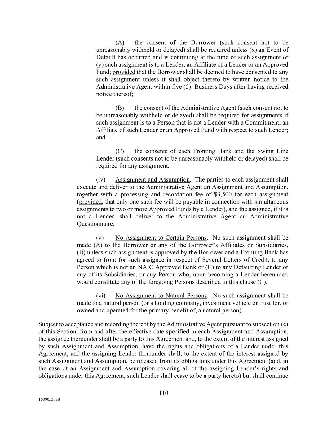 16890530v8 110 (A) the consent of the Borrower (such consent not to be unreasonably withheld or delayed) shall be required unless (x) an Event of Default has occurred and is continuing at the time of such assignment or (y) such assignment is to a Lender, an Affiliate of a Lender or an Approved Fund; provided that the Borrower shall be deemed to have consented to any such assignment unless it shall object thereto by written notice to the Administrative Agent within five (5) Business Days after having received notice thereof; (B) the consent of the Administrative Agent (such consent not to be unreasonably withheld or delayed) shall be required for assignments if such assignment is to a Person that is not a Lender with a Commitment, an Affiliate of such Lender or an Approved Fund with respect to such Lender; and (C) the consents of each Fronting Bank and the Swing Line Lender (such consents not to be unreasonably withheld or delayed) shall be required for any assignment. (iv) Assignment and Assumption. The parties to each assignment shall execute and deliver to the Administrative Agent an Assignment and Assumption, together with a processing and recordation fee of $3,500 for each assignment (provided, that only one such fee will be payable in connection with simultaneous assignments to two or more Approved Funds by a Lender), and the assignee, if it is not a Lender, shall deliver to the Administrative Agent an Administrative Questionnaire. (v) No Assignment to Certain Persons. No such assignment shall be made (A) to the Borrower or any of the Borrower’s Affiliates or Subsidiaries, (B) unless such assignment is approved by the Borrower and a Fronting Bank has agreed to front for such assignee in respect of Several Letters of Credit, to any Person which is not an NAIC Approved Bank or (C) to any Defaulting Lender or any of its Subsidiaries, or any Person who, upon becoming a Lender hereunder, would constitute any of the foregoing Persons described in this clause (C). (vi) No Assignment to Natural Persons. No such assignment shall be made to a natural person (or a holding company, investment vehicle or trust for, or owned and operated for the primary benefit of, a natural person). Subject to acceptance and recording thereof by the Administrative Agent pursuant to subsection (c) of this Section, from and after the effective date specified in each Assignment and Assumption, the assignee thereunder shall be a party to this Agreement and, to the extent of the interest assigned by such Assignment and Assumption, have the rights and obligations of a Lender under this Agreement, and the assigning Lender thereunder shall, to the extent of the interest assigned by such Assignment and Assumption, be released from its obligations under this Agreement (and, in the case of an Assignment and Assumption covering all of the assigning Lender’s rights and obligations under this Agreement, such Lender shall cease to be a party hereto) but shall continue