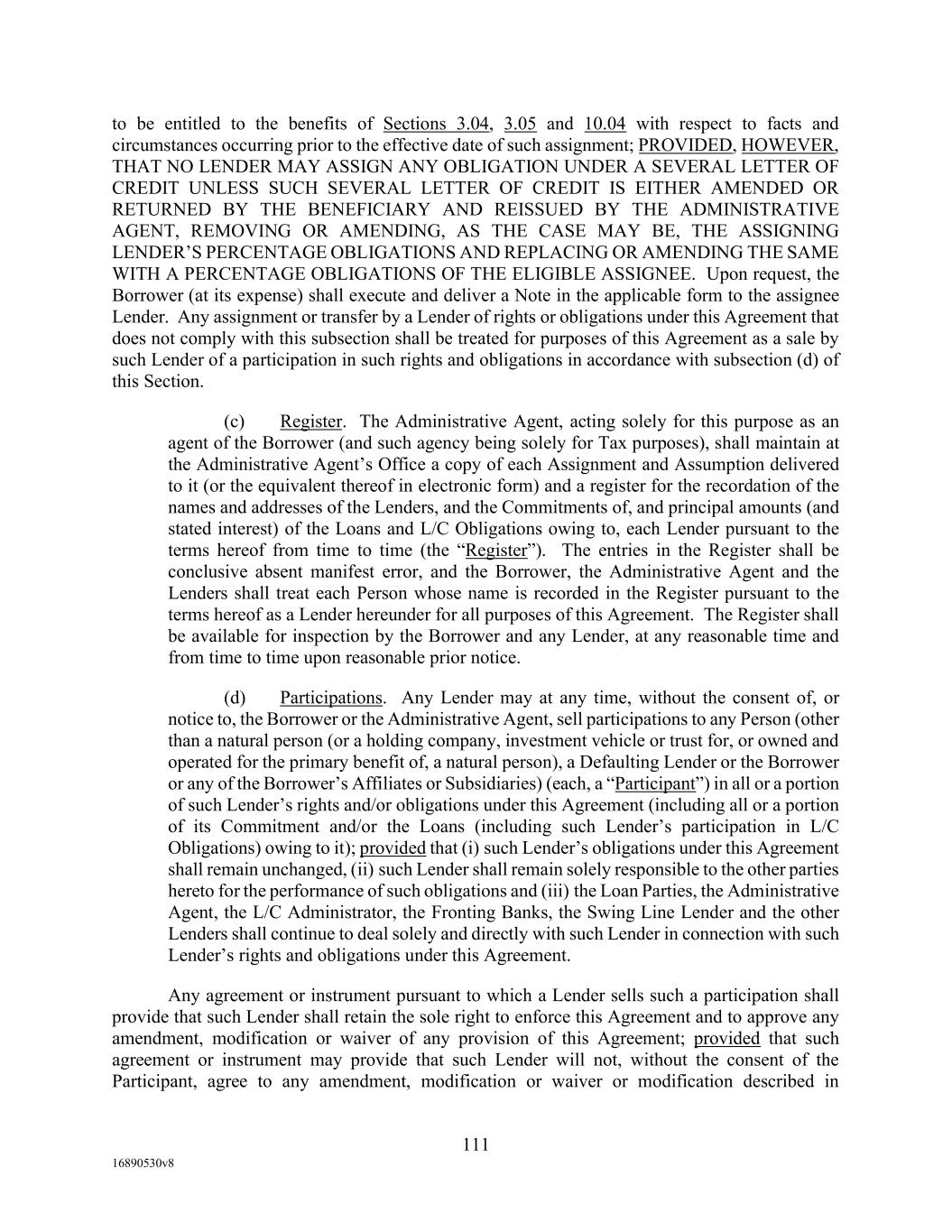 16890530v8 111 to be entitled to the benefits of Sections 3.04, 3.05 and 10.04 with respect to facts and circumstances occurring prior to the effective date of such assignment; PROVIDED, HOWEVER, THAT NO LENDER MAY ASSIGN ANY OBLIGATION UNDER A SEVERAL LETTER OF CREDIT UNLESS SUCH SEVERAL LETTER OF CREDIT IS EITHER AMENDED OR RETURNED BY THE BENEFICIARY AND REISSUED BY THE ADMINISTRATIVE AGENT, REMOVING OR AMENDING, AS THE CASE MAY BE, THE ASSIGNING LENDER’S PERCENTAGE OBLIGATIONS AND REPLACING OR AMENDING THE SAME WITH A PERCENTAGE OBLIGATIONS OF THE ELIGIBLE ASSIGNEE. Upon request, the Borrower (at its expense) shall execute and deliver a Note in the applicable form to the assignee Lender. Any assignment or transfer by a Lender of rights or obligations under this Agreement that does not comply with this subsection shall be treated for purposes of this Agreement as a sale by such Lender of a participation in such rights and obligations in accordance with subsection (d) of this Section. (c) Register. The Administrative Agent, acting solely for this purpose as an agent of the Borrower (and such agency being solely for Tax purposes), shall maintain at the Administrative Agent’s Office a copy of each Assignment and Assumption delivered to it (or the equivalent thereof in electronic form) and a register for the recordation of the names and addresses of the Lenders, and the Commitments of, and principal amounts (and stated interest) of the Loans and L/C Obligations owing to, each Lender pursuant to the terms hereof from time to time (the “Register”). The entries in the Register shall be conclusive absent manifest error, and the Borrower, the Administrative Agent and the Lenders shall treat each Person whose name is recorded in the Register pursuant to the terms hereof as a Lender hereunder for all purposes of this Agreement. The Register shall be available for inspection by the Borrower and any Lender, at any reasonable time and from time to time upon reasonable prior notice. (d) Participations. Any Lender may at any time, without the consent of, or notice to, the Borrower or the Administrative Agent, sell participations to any Person (other than a natural person (or a holding company, investment vehicle or trust for, or owned and operated for the primary benefit of, a natural person), a Defaulting Lender or the Borrower or any of the Borrower’s Affiliates or Subsidiaries) (each, a “Participant”) in all or a portion of such Lender’s rights and/or obligations under this Agreement (including all or a portion of its Commitment and/or the Loans (including such Lender’s participation in L/C Obligations) owing to it); provided that (i) such Lender’s obligations under this Agreement shall remain unchanged, (ii) such Lender shall remain solely responsible to the other parties hereto for the performance of such obligations and (iii) the Loan Parties, the Administrative Agent, the L/C Administrator, the Fronting Banks, the Swing Line Lender and the other Lenders shall continue to deal solely and directly with such Lender in connection with such Lender’s rights and obligations under this Agreement. Any agreement or instrument pursuant to which a Lender sells such a participation shall provide that such Lender shall retain the sole right to enforce this Agreement and to approve any amendment, modification or waiver of any provision of this Agreement; provided that such agreement or instrument may provide that such Lender will not, without the consent of the Participant, agree to any amendment, modification or waiver or modification described in