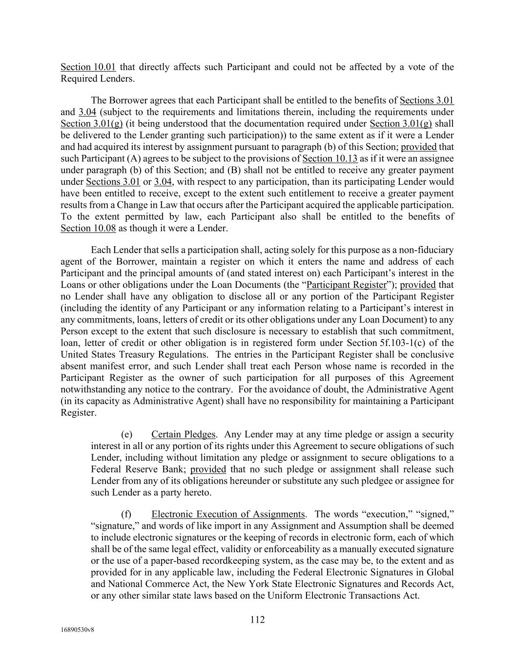16890530v8 112 Section 10.01 that directly affects such Participant and could not be affected by a vote of the Required Lenders. The Borrower agrees that each Participant shall be entitled to the benefits of Sections 3.01 and 3.04 (subject to the requirements and limitations therein, including the requirements under Section 3.01(g) (it being understood that the documentation required under Section 3.01(g) shall be delivered to the Lender granting such participation)) to the same extent as if it were a Lender and had acquired its interest by assignment pursuant to paragraph (b) of this Section; provided that such Participant (A) agrees to be subject to the provisions of Section 10.13 as if it were an assignee under paragraph (b) of this Section; and (B) shall not be entitled to receive any greater payment under Sections 3.01 or 3.04, with respect to any participation, than its participating Lender would have been entitled to receive, except to the extent such entitlement to receive a greater payment results from a Change in Law that occurs after the Participant acquired the applicable participation. To the extent permitted by law, each Participant also shall be entitled to the benefits of Section 10.08 as though it were a Lender. Each Lender that sells a participation shall, acting solely for this purpose as a non-fiduciary agent of the Borrower, maintain a register on which it enters the name and address of each Participant and the principal amounts of (and stated interest on) each Participant’s interest in the Loans or other obligations under the Loan Documents (the “Participant Register”); provided that no Lender shall have any obligation to disclose all or any portion of the Participant Register (including the identity of any Participant or any information relating to a Participant’s interest in any commitments, loans, letters of credit or its other obligations under any Loan Document) to any Person except to the extent that such disclosure is necessary to establish that such commitment, loan, letter of credit or other obligation is in registered form under Section 5f.103-1(c) of the United States Treasury Regulations. The entries in the Participant Register shall be conclusive absent manifest error, and such Lender shall treat each Person whose name is recorded in the Participant Register as the owner of such participation for all purposes of this Agreement notwithstanding any notice to the contrary. For the avoidance of doubt, the Administrative Agent (in its capacity as Administrative Agent) shall have no responsibility for maintaining a Participant Register. (e) Certain Pledges. Any Lender may at any time pledge or assign a security interest in all or any portion of its rights under this Agreement to secure obligations of such Lender, including without limitation any pledge or assignment to secure obligations to a Federal Reserve Bank; provided that no such pledge or assignment shall release such Lender from any of its obligations hereunder or substitute any such pledgee or assignee for such Lender as a party hereto. (f) Electronic Execution of Assignments. The words “execution,” “signed,” “signature,” and words of like import in any Assignment and Assumption shall be deemed to include electronic signatures or the keeping of records in electronic form, each of which shall be of the same legal effect, validity or enforceability as a manually executed signature or the use of a paper-based recordkeeping system, as the case may be, to the extent and as provided for in any applicable law, including the Federal Electronic Signatures in Global and National Commerce Act, the New York State Electronic Signatures and Records Act, or any other similar state laws based on the Uniform Electronic Transactions Act.