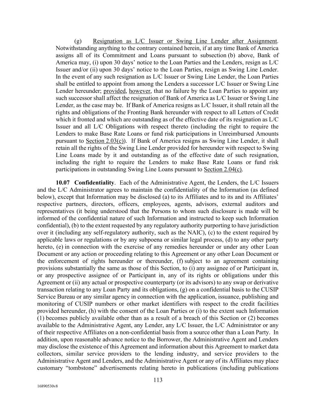 16890530v8 113 (g) Resignation as L/C Issuer or Swing Line Lender after Assignment. Notwithstanding anything to the contrary contained herein, if at any time Bank of America assigns all of its Commitment and Loans pursuant to subsection (b) above, Bank of America may, (i) upon 30 days’ notice to the Loan Parties and the Lenders, resign as L/C Issuer and/or (ii) upon 30 days’ notice to the Loan Parties, resign as Swing Line Lender. In the event of any such resignation as L/C Issuer or Swing Line Lender, the Loan Parties shall be entitled to appoint from among the Lenders a successor L/C Issuer or Swing Line Lender hereunder; provided, however, that no failure by the Loan Parties to appoint any such successor shall affect the resignation of Bank of America as L/C Issuer or Swing Line Lender, as the case may be. If Bank of America resigns as L/C Issuer, it shall retain all the rights and obligations of the Fronting Bank hereunder with respect to all Letters of Credit which it fronted and which are outstanding as of the effective date of its resignation as L/C Issuer and all L/C Obligations with respect thereto (including the right to require the Lenders to make Base Rate Loans or fund risk participations in Unreimbursed Amounts pursuant to Section 2.03(c)). If Bank of America resigns as Swing Line Lender, it shall retain all the rights of the Swing Line Lender provided for hereunder with respect to Swing Line Loans made by it and outstanding as of the effective date of such resignation, including the right to require the Lenders to make Base Rate Loans or fund risk participations in outstanding Swing Line Loans pursuant to Section 2.04(c). 10.07 Confidentiality. Each of the Administrative Agent, the Lenders, the L/C Issuers and the L/C Administrator agrees to maintain the confidentiality of the Information (as defined below), except that Information may be disclosed (a) to its Affiliates and to its and its Affiliates’ respective partners, directors, officers, employees, agents, advisors, external auditors and representatives (it being understood that the Persons to whom such disclosure is made will be informed of the confidential nature of such Information and instructed to keep such Information confidential), (b) to the extent requested by any regulatory authority purporting to have jurisdiction over it (including any self-regulatory authority, such as the NAIC), (c) to the extent required by applicable laws or regulations or by any subpoena or similar legal process, (d) to any other party hereto, (e) in connection with the exercise of any remedies hereunder or under any other Loan Document or any action or proceeding relating to this Agreement or any other Loan Document or the enforcement of rights hereunder or thereunder, (f) subject to an agreement containing provisions substantially the same as those of this Section, to (i) any assignee of or Participant in, or any prospective assignee of or Participant in, any of its rights or obligations under this Agreement or (ii) any actual or prospective counterparty (or its advisors) to any swap or derivative transaction relating to any Loan Party and its obligations, (g) on a confidential basis to the CUSIP Service Bureau or any similar agency in connection with the application, issuance, publishing and monitoring of CUSIP numbers or other market identifiers with respect to the credit facilities provided hereunder, (h) with the consent of the Loan Parties or (i) to the extent such Information (1) becomes publicly available other than as a result of a breach of this Section or (2) becomes available to the Administrative Agent, any Lender, any L/C Issuer, the L/C Administrator or any of their respective Affiliates on a non-confidential basis from a source other than a Loan Party. In addition, upon reasonable advance notice to the Borrower, the Administrative Agent and Lenders may disclose the existence of this Agreement and information about this Agreement to market data collectors, similar service providers to the lending industry, and service providers to the Administrative Agent and Lenders, and the Administrative Agent or any of its Affiliates may place customary “tombstone” advertisements relating hereto in publications (including publications
