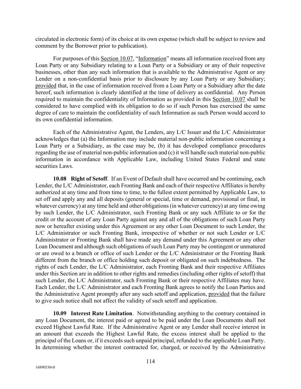 16890530v8 114 circulated in electronic form) of its choice at its own expense (which shall be subject to review and comment by the Borrower prior to publication). For purposes of this Section 10.07, “Information” means all information received from any Loan Party or any Subsidiary relating to a Loan Party or a Subsidiary or any of their respective businesses, other than any such information that is available to the Administrative Agent or any Lender on a non-confidential basis prior to disclosure by any Loan Party or any Subsidiary; provided that, in the case of information received from a Loan Party or a Subsidiary after the date hereof, such information is clearly identified at the time of delivery as confidential. Any Person required to maintain the confidentiality of Information as provided in this Section 10.07 shall be considered to have complied with its obligation to do so if such Person has exercised the same degree of care to maintain the confidentiality of such Information as such Person would accord to its own confidential information. Each of the Administrative Agent, the Lenders, any L/C Issuer and the L/C Administrator acknowledges that (a) the Information may include material non-public information concerning a Loan Party or a Subsidiary, as the case may be, (b) it has developed compliance procedures regarding the use of material non-public information and (c) it will handle such material non-public information in accordance with Applicable Law, including United States Federal and state securities Laws. 10.08 Right of Setoff. If an Event of Default shall have occurred and be continuing, each Lender, the L/C Administrator, each Fronting Bank and each of their respective Affiliates is hereby authorized at any time and from time to time, to the fullest extent permitted by Applicable Law, to set off and apply any and all deposits (general or special, time or demand, provisional or final, in whatever currency) at any time held and other obligations (in whatever currency) at any time owing by such Lender, the L/C Administrator, such Fronting Bank or any such Affiliate to or for the credit or the account of any Loan Party against any and all of the obligations of such Loan Party now or hereafter existing under this Agreement or any other Loan Document to such Lender, the L/C Administrator or such Fronting Bank, irrespective of whether or not such Lender or L/C Administrator or Fronting Bank shall have made any demand under this Agreement or any other Loan Document and although such obligations of such Loan Party may be contingent or unmatured or are owed to a branch or office of such Lender or the L/C Administrator or the Fronting Bank different from the branch or office holding such deposit or obligated on such indebtedness. The rights of each Lender, the L/C Administrator, each Fronting Bank and their respective Affiliates under this Section are in addition to other rights and remedies (including other rights of setoff) that such Lender, the L/C Administrator, such Fronting Bank or their respective Affiliates may have. Each Lender, the L/C Administrator and each Fronting Bank agrees to notify the Loan Parties and the Administrative Agent promptly after any such setoff and application, provided that the failure to give such notice shall not affect the validity of such setoff and application. 10.09 Interest Rate Limitation. Notwithstanding anything to the contrary contained in any Loan Document, the interest paid or agreed to be paid under the Loan Documents shall not exceed Highest Lawful Rate. If the Administrative Agent or any Lender shall receive interest in an amount that exceeds the Highest Lawful Rate, the excess interest shall be applied to the principal of the Loans or, if it exceeds such unpaid principal, refunded to the applicable Loan Party. In determining whether the interest contracted for, charged, or received by the Administrative