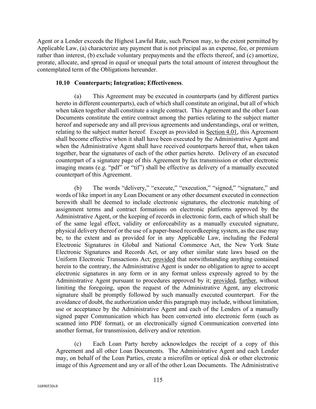 16890530v8 115 Agent or a Lender exceeds the Highest Lawful Rate, such Person may, to the extent permitted by Applicable Law, (a) characterize any payment that is not principal as an expense, fee, or premium rather than interest, (b) exclude voluntary prepayments and the effects thereof, and (c) amortize, prorate, allocate, and spread in equal or unequal parts the total amount of interest throughout the contemplated term of the Obligations hereunder. 10.10 Counterparts; Integration; Effectiveness. (a) This Agreement may be executed in counterparts (and by different parties hereto in different counterparts), each of which shall constitute an original, but all of which when taken together shall constitute a single contract. This Agreement and the other Loan Documents constitute the entire contract among the parties relating to the subject matter hereof and supersede any and all previous agreements and understandings, oral or written, relating to the subject matter hereof. Except as provided in Section 4.01, this Agreement shall become effective when it shall have been executed by the Administrative Agent and when the Administrative Agent shall have received counterparts hereof that, when taken together, bear the signatures of each of the other parties hereto. Delivery of an executed counterpart of a signature page of this Agreement by fax transmission or other electronic imaging means (e.g. “pdf” or “tif”) shall be effective as delivery of a manually executed counterpart of this Agreement. (b) The words “delivery,” “execute,” “execution,” “signed,” “signature,” and words of like import in any Loan Document or any other document executed in connection herewith shall be deemed to include electronic signatures, the electronic matching of assignment terms and contract formations on electronic platforms approved by the Administrative Agent, or the keeping of records in electronic form, each of which shall be of the same legal effect, validity or enforceability as a manually executed signature, physical delivery thereof or the use of a paper-based recordkeeping system, as the case may be, to the extent and as provided for in any Applicable Law, including the Federal Electronic Signatures in Global and National Commerce Act, the New York State Electronic Signatures and Records Act, or any other similar state laws based on the Uniform Electronic Transactions Act; provided that notwithstanding anything contained herein to the contrary, the Administrative Agent is under no obligation to agree to accept electronic signatures in any form or in any format unless expressly agreed to by the Administrative Agent pursuant to procedures approved by it; provided, further, without limiting the foregoing, upon the request of the Administrative Agent, any electronic signature shall be promptly followed by such manually executed counterpart. For the avoidance of doubt, the authorization under this paragraph may include, without limitation, use or acceptance by the Administrative Agent and each of the Lenders of a manually signed paper Communication which has been converted into electronic form (such as scanned into PDF format), or an electronically signed Communication converted into another format, for transmission, delivery and/or retention. (c) Each Loan Party hereby acknowledges the receipt of a copy of this Agreement and all other Loan Documents. The Administrative Agent and each Lender may, on behalf of the Loan Parties, create a microfilm or optical disk or other electronic image of this Agreement and any or all of the other Loan Documents. The Administrative