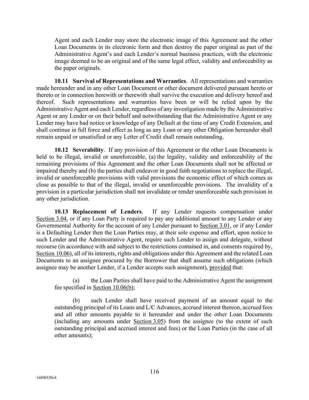 16890530v8 116 Agent and each Lender may store the electronic image of this Agreement and the other Loan Documents in its electronic form and then destroy the paper original as part of the Administrative Agent’s and each Lender’s normal business practices, with the electronic image deemed to be an original and of the same legal effect, validity and enforceability as the paper originals. 10.11 Survival of Representations and Warranties. All representations and warranties made hereunder and in any other Loan Document or other document delivered pursuant hereto or thereto or in connection herewith or therewith shall survive the execution and delivery hereof and thereof. Such representations and warranties have been or will be relied upon by the Administrative Agent and each Lender, regardless of any investigation made by the Administrative Agent or any Lender or on their behalf and notwithstanding that the Administrative Agent or any Lender may have had notice or knowledge of any Default at the time of any Credit Extension, and shall continue in full force and effect as long as any Loan or any other Obligation hereunder shall remain unpaid or unsatisfied or any Letter of Credit shall remain outstanding. 10.12 Severability. If any provision of this Agreement or the other Loan Documents is held to be illegal, invalid or unenforceable, (a) the legality, validity and enforceability of the remaining provisions of this Agreement and the other Loan Documents shall not be affected or impaired thereby and (b) the parties shall endeavor in good faith negotiations to replace the illegal, invalid or unenforceable provisions with valid provisions the economic effect of which comes as close as possible to that of the illegal, invalid or unenforceable provisions. The invalidity of a provision in a particular jurisdiction shall not invalidate or render unenforceable such provision in any other jurisdiction. 10.13 Replacement of Lenders. If any Lender requests compensation under Section 3.04, or if any Loan Party is required to pay any additional amount to any Lender or any Governmental Authority for the account of any Lender pursuant to Section 3.01, or if any Lender is a Defaulting Lender then the Loan Parties may, at their sole expense and effort, upon notice to such Lender and the Administrative Agent, require such Lender to assign and delegate, without recourse (in accordance with and subject to the restrictions contained in, and consents required by, Section 10.06), all of its interests, rights and obligations under this Agreement and the related Loan Documents to an assignee procured by the Borrower that shall assume such obligations (which assignee may be another Lender, if a Lender accepts such assignment), provided that: (a) the Loan Parties shall have paid to the Administrative Agent the assignment fee specified in Section 10.06(b); (b) such Lender shall have received payment of an amount equal to the outstanding principal of its Loans and L/C Advances, accrued interest thereon, accrued fees and all other amounts payable to it hereunder and under the other Loan Documents (including any amounts under Section 3.05) from the assignee (to the extent of such outstanding principal and accrued interest and fees) or the Loan Parties (in the case of all other amounts);