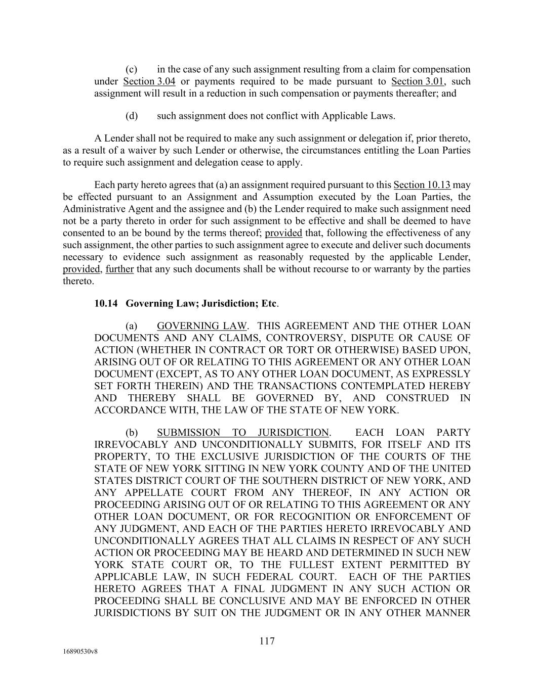 16890530v8 117 (c) in the case of any such assignment resulting from a claim for compensation under Section 3.04 or payments required to be made pursuant to Section 3.01, such assignment will result in a reduction in such compensation or payments thereafter; and (d) such assignment does not conflict with Applicable Laws. A Lender shall not be required to make any such assignment or delegation if, prior thereto, as a result of a waiver by such Lender or otherwise, the circumstances entitling the Loan Parties to require such assignment and delegation cease to apply. Each party hereto agrees that (a) an assignment required pursuant to this Section 10.13 may be effected pursuant to an Assignment and Assumption executed by the Loan Parties, the Administrative Agent and the assignee and (b) the Lender required to make such assignment need not be a party thereto in order for such assignment to be effective and shall be deemed to have consented to an be bound by the terms thereof; provided that, following the effectiveness of any such assignment, the other parties to such assignment agree to execute and deliver such documents necessary to evidence such assignment as reasonably requested by the applicable Lender, provided, further that any such documents shall be without recourse to or warranty by the parties thereto. 10.14 Governing Law; Jurisdiction; Etc. (a) GOVERNING LAW. THIS AGREEMENT AND THE OTHER LOAN DOCUMENTS AND ANY CLAIMS, CONTROVERSY, DISPUTE OR CAUSE OF ACTION (WHETHER IN CONTRACT OR TORT OR OTHERWISE) BASED UPON, ARISING OUT OF OR RELATING TO THIS AGREEMENT OR ANY OTHER LOAN DOCUMENT (EXCEPT, AS TO ANY OTHER LOAN DOCUMENT, AS EXPRESSLY SET FORTH THEREIN) AND THE TRANSACTIONS CONTEMPLATED HEREBY AND THEREBY SHALL BE GOVERNED BY, AND CONSTRUED IN ACCORDANCE WITH, THE LAW OF THE STATE OF NEW YORK. (b) SUBMISSION TO JURISDICTION. EACH LOAN PARTY IRREVOCABLY AND UNCONDITIONALLY SUBMITS, FOR ITSELF AND ITS PROPERTY, TO THE EXCLUSIVE JURISDICTION OF THE COURTS OF THE STATE OF NEW YORK SITTING IN NEW YORK COUNTY AND OF THE UNITED STATES DISTRICT COURT OF THE SOUTHERN DISTRICT OF NEW YORK, AND ANY APPELLATE COURT FROM ANY THEREOF, IN ANY ACTION OR PROCEEDING ARISING OUT OF OR RELATING TO THIS AGREEMENT OR ANY OTHER LOAN DOCUMENT, OR FOR RECOGNITION OR ENFORCEMENT OF ANY JUDGMENT, AND EACH OF THE PARTIES HERETO IRREVOCABLY AND UNCONDITIONALLY AGREES THAT ALL CLAIMS IN RESPECT OF ANY SUCH ACTION OR PROCEEDING MAY BE HEARD AND DETERMINED IN SUCH NEW YORK STATE COURT OR, TO THE FULLEST EXTENT PERMITTED BY APPLICABLE LAW, IN SUCH FEDERAL COURT. EACH OF THE PARTIES HERETO AGREES THAT A FINAL JUDGMENT IN ANY SUCH ACTION OR PROCEEDING SHALL BE CONCLUSIVE AND MAY BE ENFORCED IN OTHER JURISDICTIONS BY SUIT ON THE JUDGMENT OR IN ANY OTHER MANNER