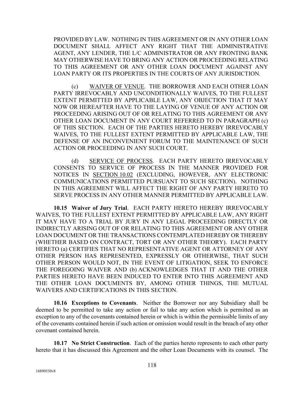 16890530v8 118 PROVIDED BY LAW. NOTHING IN THIS AGREEMENT OR IN ANY OTHER LOAN DOCUMENT SHALL AFFECT ANY RIGHT THAT THE ADMINISTRATIVE AGENT, ANY LENDER, THE L/C ADMINISTRATOR OR ANY FRONTING BANK MAY OTHERWISE HAVE TO BRING ANY ACTION OR PROCEEDING RELATING TO THIS AGREEMENT OR ANY OTHER LOAN DOCUMENT AGAINST ANY LOAN PARTY OR ITS PROPERTIES IN THE COURTS OF ANY JURISDICTION. (c) WAIVER OF VENUE. THE BORROWER AND EACH OTHER LOAN PARTY IRREVOCABLY AND UNCONDITIONALLY WAIVES, TO THE FULLEST EXTENT PERMITTED BY APPLICABLE LAW, ANY OBJECTION THAT IT MAY NOW OR HEREAFTER HAVE TO THE LAYING OF VENUE OF ANY ACTION OR PROCEEDING ARISING OUT OF OR RELATING TO THIS AGREEMENT OR ANY OTHER LOAN DOCUMENT IN ANY COURT REFERRED TO IN PARAGRAPH (c) OF THIS SECTION. EACH OF THE PARTIES HERETO HEREBY IRREVOCABLY WAIVES, TO THE FULLEST EXTENT PERMITTED BY APPLICABLE LAW, THE DEFENSE OF AN INCONVENIENT FORUM TO THE MAINTENANCE OF SUCH ACTION OR PROCEEDING IN ANY SUCH COURT. (d) SERVICE OF PROCESS. EACH PARTY HERETO IRREVOCABLY CONSENTS TO SERVICE OF PROCESS IN THE MANNER PROVIDED FOR NOTICES IN SECTION 10.02 (EXCLUDING, HOWEVER, ANY ELECTRONIC COMMUNICATIONS PERMITTED PURSUANT TO SUCH SECTION). NOTHING IN THIS AGREEMENT WILL AFFECT THE RIGHT OF ANY PARTY HERETO TO SERVE PROCESS IN ANY OTHER MANNER PERMITTED BY APPLICABLE LAW. 10.15 Waiver of Jury Trial. EACH PARTY HERETO HEREBY IRREVOCABLY WAIVES, TO THE FULLEST EXTENT PERMITTED BY APPLICABLE LAW, ANY RIGHT IT MAY HAVE TO A TRIAL BY JURY IN ANY LEGAL PROCEEDING DIRECTLY OR INDIRECTLY ARISING OUT OF OR RELATING TO THIS AGREEMENT OR ANY OTHER LOAN DOCUMENT OR THE TRANSACTIONS CONTEMPLATED HEREBY OR THEREBY (WHETHER BASED ON CONTRACT, TORT OR ANY OTHER THEORY). EACH PARTY HERETO (a) CERTIFIES THAT NO REPRESENTATIVE AGENT OR ATTORNEY OF ANY OTHER PERSON HAS REPRESENTED, EXPRESSLY OR OTHERWISE, THAT SUCH OTHER PERSON WOULD NOT, IN THE EVENT OF LITIGATION, SEEK TO ENFORCE THE FOREGOING WAIVER AND (b) ACKNOWLEDGES THAT IT AND THE OTHER PARTIES HERETO HAVE BEEN INDUCED TO ENTER INTO THIS AGREEMENT AND THE OTHER LOAN DOCUMENTS BY, AMONG OTHER THINGS, THE MUTUAL WAIVERS AND CERTIFICATIONS IN THIS SECTION. 10.16 Exceptions to Covenants. Neither the Borrower nor any Subsidiary shall be deemed to be permitted to take any action or fail to take any action which is permitted as an exception to any of the covenants contained herein or which is within the permissible limits of any of the covenants contained herein if such action or omission would result in the breach of any other covenant contained herein. 10.17 No Strict Construction. Each of the parties hereto represents to each other party hereto that it has discussed this Agreement and the other Loan Documents with its counsel. The