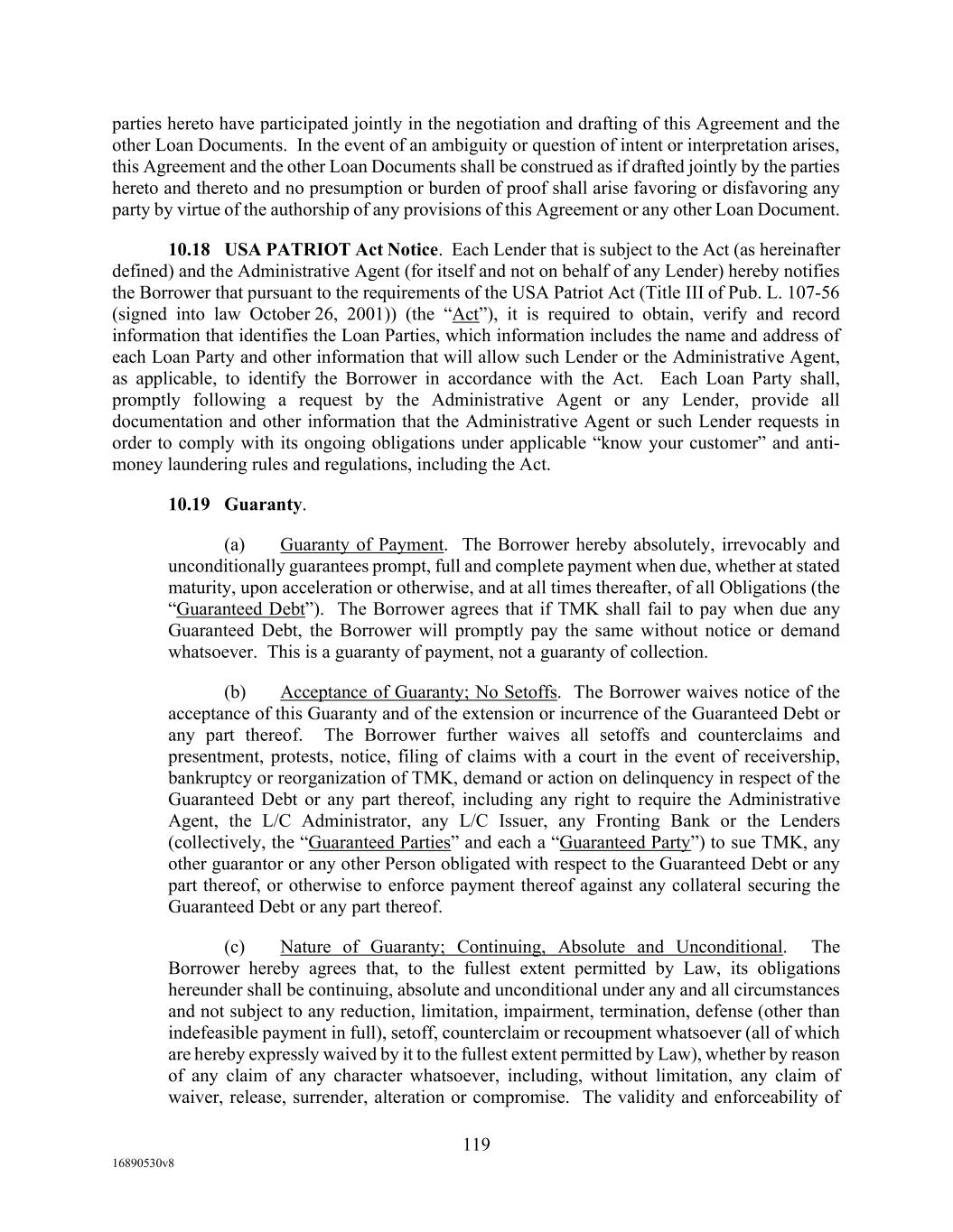 16890530v8 119 parties hereto have participated jointly in the negotiation and drafting of this Agreement and the other Loan Documents. In the event of an ambiguity or question of intent or interpretation arises, this Agreement and the other Loan Documents shall be construed as if drafted jointly by the parties hereto and thereto and no presumption or burden of proof shall arise favoring or disfavoring any party by virtue of the authorship of any provisions of this Agreement or any other Loan Document. 10.18 USA PATRIOT Act Notice. Each Lender that is subject to the Act (as hereinafter defined) and the Administrative Agent (for itself and not on behalf of any Lender) hereby notifies the Borrower that pursuant to the requirements of the USA Patriot Act (Title III of Pub. L. 107-56 (signed into law October 26, 2001)) (the “Act”), it is required to obtain, verify and record information that identifies the Loan Parties, which information includes the name and address of each Loan Party and other information that will allow such Lender or the Administrative Agent, as applicable, to identify the Borrower in accordance with the Act. Each Loan Party shall, promptly following a request by the Administrative Agent or any Lender, provide all documentation and other information that the Administrative Agent or such Lender requests in order to comply with its ongoing obligations under applicable “know your customer” and anti- money laundering rules and regulations, including the Act. 10.19 Guaranty. (a) Guaranty of Payment. The Borrower hereby absolutely, irrevocably and unconditionally guarantees prompt, full and complete payment when due, whether at stated maturity, upon acceleration or otherwise, and at all times thereafter, of all Obligations (the “Guaranteed Debt”). The Borrower agrees that if TMK shall fail to pay when due any Guaranteed Debt, the Borrower will promptly pay the same without notice or demand whatsoever. This is a guaranty of payment, not a guaranty of collection. (b) Acceptance of Guaranty; No Setoffs. The Borrower waives notice of the acceptance of this Guaranty and of the extension or incurrence of the Guaranteed Debt or any part thereof. The Borrower further waives all setoffs and counterclaims and presentment, protests, notice, filing of claims with a court in the event of receivership, bankruptcy or reorganization of TMK, demand or action on delinquency in respect of the Guaranteed Debt or any part thereof, including any right to require the Administrative Agent, the L/C Administrator, any L/C Issuer, any Fronting Bank or the Lenders (collectively, the “Guaranteed Parties” and each a “Guaranteed Party”) to sue TMK, any other guarantor or any other Person obligated with respect to the Guaranteed Debt or any part thereof, or otherwise to enforce payment thereof against any collateral securing the Guaranteed Debt or any part thereof. (c) Nature of Guaranty; Continuing, Absolute and Unconditional. The Borrower hereby agrees that, to the fullest extent permitted by Law, its obligations hereunder shall be continuing, absolute and unconditional under any and all circumstances and not subject to any reduction, limitation, impairment, termination, defense (other than indefeasible payment in full), setoff, counterclaim or recoupment whatsoever (all of which are hereby expressly waived by it to the fullest extent permitted by Law), whether by reason of any claim of any character whatsoever, including, without limitation, any claim of waiver, release, surrender, alteration or compromise. The validity and enforceability of