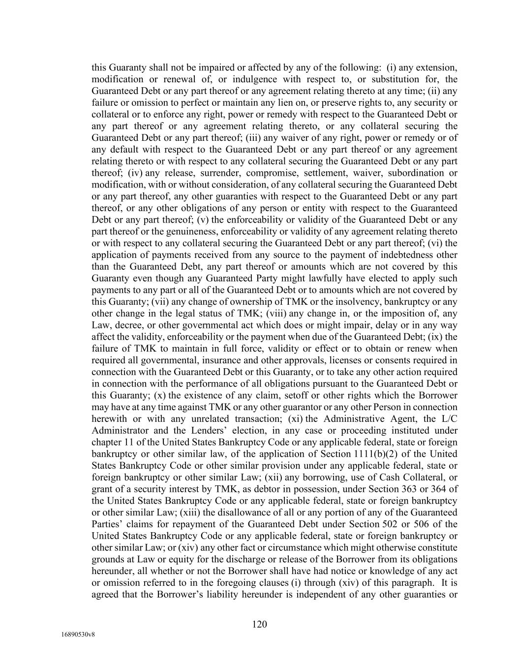 16890530v8 120 this Guaranty shall not be impaired or affected by any of the following: (i) any extension, modification or renewal of, or indulgence with respect to, or substitution for, the Guaranteed Debt or any part thereof or any agreement relating thereto at any time; (ii) any failure or omission to perfect or maintain any lien on, or preserve rights to, any security or collateral or to enforce any right, power or remedy with respect to the Guaranteed Debt or any part thereof or any agreement relating thereto, or any collateral securing the Guaranteed Debt or any part thereof; (iii) any waiver of any right, power or remedy or of any default with respect to the Guaranteed Debt or any part thereof or any agreement relating thereto or with respect to any collateral securing the Guaranteed Debt or any part thereof; (iv) any release, surrender, compromise, settlement, waiver, subordination or modification, with or without consideration, of any collateral securing the Guaranteed Debt or any part thereof, any other guaranties with respect to the Guaranteed Debt or any part thereof, or any other obligations of any person or entity with respect to the Guaranteed Debt or any part thereof; (v) the enforceability or validity of the Guaranteed Debt or any part thereof or the genuineness, enforceability or validity of any agreement relating thereto or with respect to any collateral securing the Guaranteed Debt or any part thereof; (vi) the application of payments received from any source to the payment of indebtedness other than the Guaranteed Debt, any part thereof or amounts which are not covered by this Guaranty even though any Guaranteed Party might lawfully have elected to apply such payments to any part or all of the Guaranteed Debt or to amounts which are not covered by this Guaranty; (vii) any change of ownership of TMK or the insolvency, bankruptcy or any other change in the legal status of TMK; (viii) any change in, or the imposition of, any Law, decree, or other governmental act which does or might impair, delay or in any way affect the validity, enforceability or the payment when due of the Guaranteed Debt; (ix) the failure of TMK to maintain in full force, validity or effect or to obtain or renew when required all governmental, insurance and other approvals, licenses or consents required in connection with the Guaranteed Debt or this Guaranty, or to take any other action required in connection with the performance of all obligations pursuant to the Guaranteed Debt or this Guaranty; (x) the existence of any claim, setoff or other rights which the Borrower may have at any time against TMK or any other guarantor or any other Person in connection herewith or with any unrelated transaction; (xi) the Administrative Agent, the L/C Administrator and the Lenders’ election, in any case or proceeding instituted under chapter 11 of the United States Bankruptcy Code or any applicable federal, state or foreign bankruptcy or other similar law, of the application of Section 1111(b)(2) of the United States Bankruptcy Code or other similar provision under any applicable federal, state or foreign bankruptcy or other similar Law; (xii) any borrowing, use of Cash Collateral, or grant of a security interest by TMK, as debtor in possession, under Section 363 or 364 of the United States Bankruptcy Code or any applicable federal, state or foreign bankruptcy or other similar Law; (xiii) the disallowance of all or any portion of any of the Guaranteed Parties’ claims for repayment of the Guaranteed Debt under Section 502 or 506 of the United States Bankruptcy Code or any applicable federal, state or foreign bankruptcy or other similar Law; or (xiv) any other fact or circumstance which might otherwise constitute grounds at Law or equity for the discharge or release of the Borrower from its obligations hereunder, all whether or not the Borrower shall have had notice or knowledge of any act or omission referred to in the foregoing clauses (i) through (xiv) of this paragraph. It is agreed that the Borrower’s liability hereunder is independent of any other guaranties or