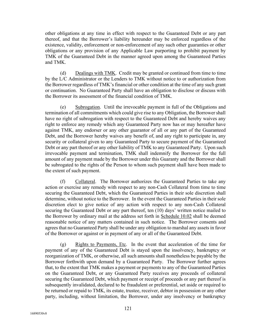 16890530v8 121 other obligations at any time in effect with respect to the Guaranteed Debt or any part thereof, and that the Borrower’s liability hereunder may be enforced regardless of the existence, validity, enforcement or non-enforcement of any such other guaranties or other obligations or any provision of any Applicable Law purporting to prohibit payment by TMK of the Guaranteed Debt in the manner agreed upon among the Guaranteed Parties and TMK. (d) Dealings with TMK. Credit may be granted or continued from time to time by the L/C Administrator or the Lenders to TMK without notice to or authorization from the Borrower regardless of TMK’s financial or other condition at the time of any such grant or continuation. No Guaranteed Party shall have an obligation to disclose or discuss with the Borrower its assessment of the financial condition of TMK. (e) Subrogation. Until the irrevocable payment in full of the Obligations and termination of all commitments which could give rise to any Obligation, the Borrower shall have no right of subrogation with respect to the Guaranteed Debt and hereby waives any right to enforce any remedy which any Guaranteed Party now has or may hereafter have against TMK, any endorser or any other guarantor of all or any part of the Guaranteed Debt, and the Borrower hereby waives any benefit of, and any right to participate in, any security or collateral given to any Guaranteed Party to secure payment of the Guaranteed Debt or any part thereof or any other liability of TMK to any Guaranteed Party. Upon such irrevocable payment and termination, TMK shall indemnify the Borrower for the full amount of any payment made by the Borrower under this Guaranty and the Borrower shall be subrogated to the rights of the Person to whom such payment shall have been made to the extent of such payment. (f) Collateral. The Borrower authorizes the Guaranteed Parties to take any action or exercise any remedy with respect to any non-Cash Collateral from time to time securing the Guaranteed Debt, which the Guaranteed Parties in their sole discretion shall determine, without notice to the Borrower. In the event the Guaranteed Parties in their sole discretion elect to give notice of any action with respect to any non-Cash Collateral securing the Guaranteed Debt or any part thereof, ten (10) days’ written notice mailed to the Borrower by ordinary mail at the address set forth in Schedule 10.02 shall be deemed reasonable notice of any matters contained in such notice. The Borrower consents and agrees that no Guaranteed Party shall be under any obligation to marshal any assets in favor of the Borrower or against or in payment of any or all of the Guaranteed Debt. (g) Rights to Payments, Etc. In the event that acceleration of the time for payment of any of the Guaranteed Debt is stayed upon the insolvency, bankruptcy or reorganization of TMK, or otherwise, all such amounts shall nonetheless be payable by the Borrower forthwith upon demand by a Guaranteed Party. The Borrower further agrees that, to the extent that TMK makes a payment or payments to any of the Guaranteed Parties on the Guaranteed Debt, or any Guaranteed Party receives any proceeds of collateral securing the Guaranteed Debt, which payment or receipt of proceeds or any part thereof is subsequently invalidated, declared to be fraudulent or preferential, set aside or required to be returned or repaid to TMK, its estate, trustee, receiver, debtor in possession or any other party, including, without limitation, the Borrower, under any insolvency or bankruptcy