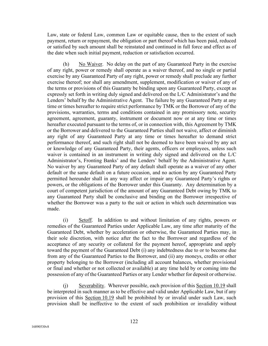16890530v8 122 Law, state or federal Law, common Law or equitable cause, then to the extent of such payment, return or repayment, the obligation or part thereof which has been paid, reduced or satisfied by such amount shall be reinstated and continued in full force and effect as of the date when such initial payment, reduction or satisfaction occurred. (h) No Waiver. No delay on the part of any Guaranteed Party in the exercise of any right, power or remedy shall operate as a waiver thereof, and no single or partial exercise by any Guaranteed Party of any right, power or remedy shall preclude any further exercise thereof; nor shall any amendment, supplement, modification or waiver of any of the terms or provisions of this Guaranty be binding upon any Guaranteed Party, except as expressly set forth in writing duly signed and delivered on the L/C Administrator’s and the Lenders’ behalf by the Administrative Agent. The failure by any Guaranteed Party at any time or times hereafter to require strict performance by TMK or the Borrower of any of the provisions, warranties, terms and conditions contained in any promissory note, security agreement, agreement, guaranty, instrument or document now or at any time or times hereafter executed pursuant to the terms of, or in connection with, this Agreement by TMK or the Borrower and delivered to the Guaranteed Parties shall not waive, affect or diminish any right of any Guaranteed Party at any time or times hereafter to demand strict performance thereof, and such right shall not be deemed to have been waived by any act or knowledge of any Guaranteed Party, their agents, officers or employees, unless such waiver is contained in an instrument in writing duly signed and delivered on the L/C Administrator’s, Fronting Banks’ and the Lenders’ behalf by the Administrative Agent. No waiver by any Guaranteed Party of any default shall operate as a waiver of any other default or the same default on a future occasion, and no action by any Guaranteed Party permitted hereunder shall in any way affect or impair any Guaranteed Party’s rights or powers, or the obligations of the Borrower under this Guaranty. Any determination by a court of competent jurisdiction of the amount of any Guaranteed Debt owing by TMK to any Guaranteed Party shall be conclusive and binding on the Borrower irrespective of whether the Borrower was a party to the suit or action in which such determination was made. (i) Setoff. In addition to and without limitation of any rights, powers or remedies of the Guaranteed Parties under Applicable Law, any time after maturity of the Guaranteed Debt, whether by acceleration or otherwise, the Guaranteed Parties may, in their sole discretion, with notice after the fact to the Borrower and regardless of the acceptance of any security or collateral for the payment hereof, appropriate and apply toward the payment of the Guaranteed Debt (i) any indebtedness due to or to become due from any of the Guaranteed Parties to the Borrower, and (ii) any moneys, credits or other property belonging to the Borrower (including all account balances, whether provisional or final and whether or not collected or available) at any time held by or coming into the possession of any of the Guaranteed Parties or any Lender whether for deposit or otherwise. (j) Severability. Wherever possible, each provision of this Section 10.19 shall be interpreted in such manner as to be effective and valid under Applicable Law, but if any provision of this Section 10.19 shall be prohibited by or invalid under such Law, such provision shall be ineffective to the extent of such prohibition or invalidity without