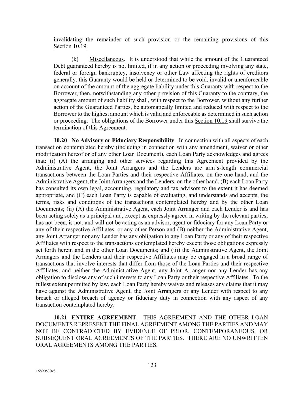 16890530v8 123 invalidating the remainder of such provision or the remaining provisions of this Section 10.19. (k) Miscellaneous. It is understood that while the amount of the Guaranteed Debt guaranteed hereby is not limited, if in any action or proceeding involving any state, federal or foreign bankruptcy, insolvency or other Law affecting the rights of creditors generally, this Guaranty would be held or determined to be void, invalid or unenforceable on account of the amount of the aggregate liability under this Guaranty with respect to the Borrower, then, notwithstanding any other provision of this Guaranty to the contrary, the aggregate amount of such liability shall, with respect to the Borrower, without any further action of the Guaranteed Parties, be automatically limited and reduced with respect to the Borrower to the highest amount which is valid and enforceable as determined in such action or proceeding. The obligations of the Borrower under this Section 10.19 shall survive the termination of this Agreement. 10.20 No Advisory or Fiduciary Responsibility. In connection with all aspects of each transaction contemplated hereby (including in connection with any amendment, waiver or other modification hereof or of any other Loan Document), each Loan Party acknowledges and agrees that: (i) (A) the arranging and other services regarding this Agreement provided by the Administrative Agent, the Joint Arrangers and the Lenders are arm’s-length commercial transactions between the Loan Parties and their respective Affiliates, on the one hand, and the Administrative Agent, the Joint Arrangers and the Lenders, on the other hand, (B) each Loan Party has consulted its own legal, accounting, regulatory and tax advisors to the extent it has deemed appropriate, and (C) each Loan Party is capable of evaluating, and understands and accepts, the terms, risks and conditions of the transactions contemplated hereby and by the other Loan Documents; (ii) (A) the Administrative Agent, each Joint Arranger and each Lender is and has been acting solely as a principal and, except as expressly agreed in writing by the relevant parties, has not been, is not, and will not be acting as an advisor, agent or fiduciary for any Loan Party or any of their respective Affiliates, or any other Person and (B) neither the Administrative Agent, any Joint Arranger nor any Lender has any obligation to any Loan Party or any of their respective Affiliates with respect to the transactions contemplated hereby except those obligations expressly set forth herein and in the other Loan Documents; and (iii) the Administrative Agent, the Joint Arrangers and the Lenders and their respective Affiliates may be engaged in a broad range of transactions that involve interests that differ from those of the Loan Parties and their respective Affiliates, and neither the Administrative Agent, any Joint Arranger nor any Lender has any obligation to disclose any of such interests to any Loan Party or their respective Affiliates. To the fullest extent permitted by law, each Loan Party hereby waives and releases any claims that it may have against the Administrative Agent, the Joint Arrangers or any Lender with respect to any breach or alleged breach of agency or fiduciary duty in connection with any aspect of any transaction contemplated hereby. 10.21 ENTIRE AGREEMENT. THIS AGREEMENT AND THE OTHER LOAN DOCUMENTS REPRESENT THE FINAL AGREEMENT AMONG THE PARTIES AND MAY NOT BE CONTRADICTED BY EVIDENCE OF PRIOR, CONTEMPORANEOUS, OR SUBSEQUENT ORAL AGREEMENTS OF THE PARTIES. THERE ARE NO UNWRITTEN ORAL AGREEMENTS AMONG THE PARTIES.
