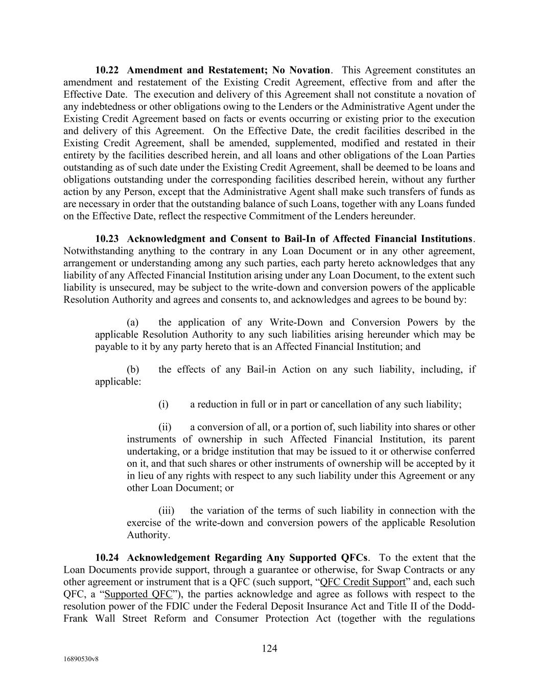 16890530v8 124 10.22 Amendment and Restatement; No Novation. This Agreement constitutes an amendment and restatement of the Existing Credit Agreement, effective from and after the Effective Date. The execution and delivery of this Agreement shall not constitute a novation of any indebtedness or other obligations owing to the Lenders or the Administrative Agent under the Existing Credit Agreement based on facts or events occurring or existing prior to the execution and delivery of this Agreement. On the Effective Date, the credit facilities described in the Existing Credit Agreement, shall be amended, supplemented, modified and restated in their entirety by the facilities described herein, and all loans and other obligations of the Loan Parties outstanding as of such date under the Existing Credit Agreement, shall be deemed to be loans and obligations outstanding under the corresponding facilities described herein, without any further action by any Person, except that the Administrative Agent shall make such transfers of funds as are necessary in order that the outstanding balance of such Loans, together with any Loans funded on the Effective Date, reflect the respective Commitment of the Lenders hereunder. 10.23 Acknowledgment and Consent to Bail-In of Affected Financial Institutions. Notwithstanding anything to the contrary in any Loan Document or in any other agreement, arrangement or understanding among any such parties, each party hereto acknowledges that any liability of any Affected Financial Institution arising under any Loan Document, to the extent such liability is unsecured, may be subject to the write-down and conversion powers of the applicable Resolution Authority and agrees and consents to, and acknowledges and agrees to be bound by: (a) the application of any Write-Down and Conversion Powers by the applicable Resolution Authority to any such liabilities arising hereunder which may be payable to it by any party hereto that is an Affected Financial Institution; and (b) the effects of any Bail-in Action on any such liability, including, if applicable: (i) a reduction in full or in part or cancellation of any such liability; (ii) a conversion of all, or a portion of, such liability into shares or other instruments of ownership in such Affected Financial Institution, its parent undertaking, or a bridge institution that may be issued to it or otherwise conferred on it, and that such shares or other instruments of ownership will be accepted by it in lieu of any rights with respect to any such liability under this Agreement or any other Loan Document; or (iii) the variation of the terms of such liability in connection with the exercise of the write-down and conversion powers of the applicable Resolution Authority. 10.24 Acknowledgement Regarding Any Supported QFCs. To the extent that the Loan Documents provide support, through a guarantee or otherwise, for Swap Contracts or any other agreement or instrument that is a QFC (such support, “QFC Credit Support” and, each such QFC, a “Supported QFC”), the parties acknowledge and agree as follows with respect to the resolution power of the FDIC under the Federal Deposit Insurance Act and Title II of the Dodd- Frank Wall Street Reform and Consumer Protection Act (together with the regulations